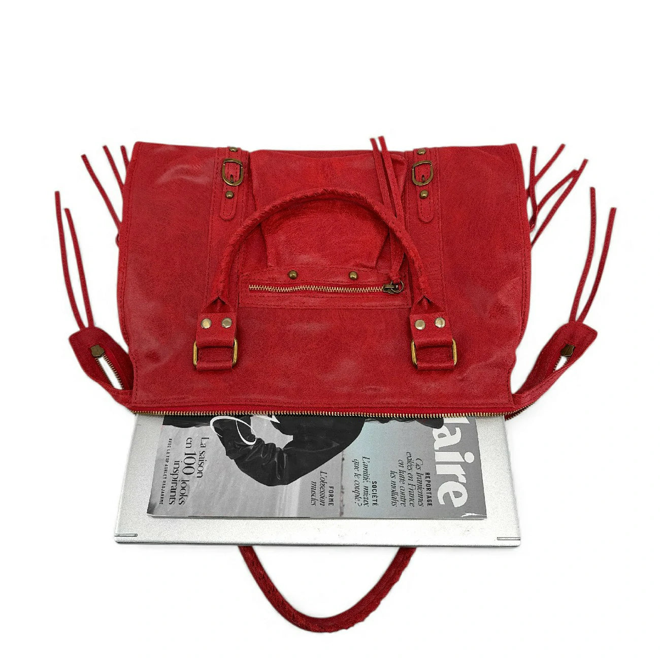 Sac à main en cuir brossé rouge garance à bandoulière avec lacets décoratifs, porté main, épaule ou bandoulière, fabriqué en Italie.