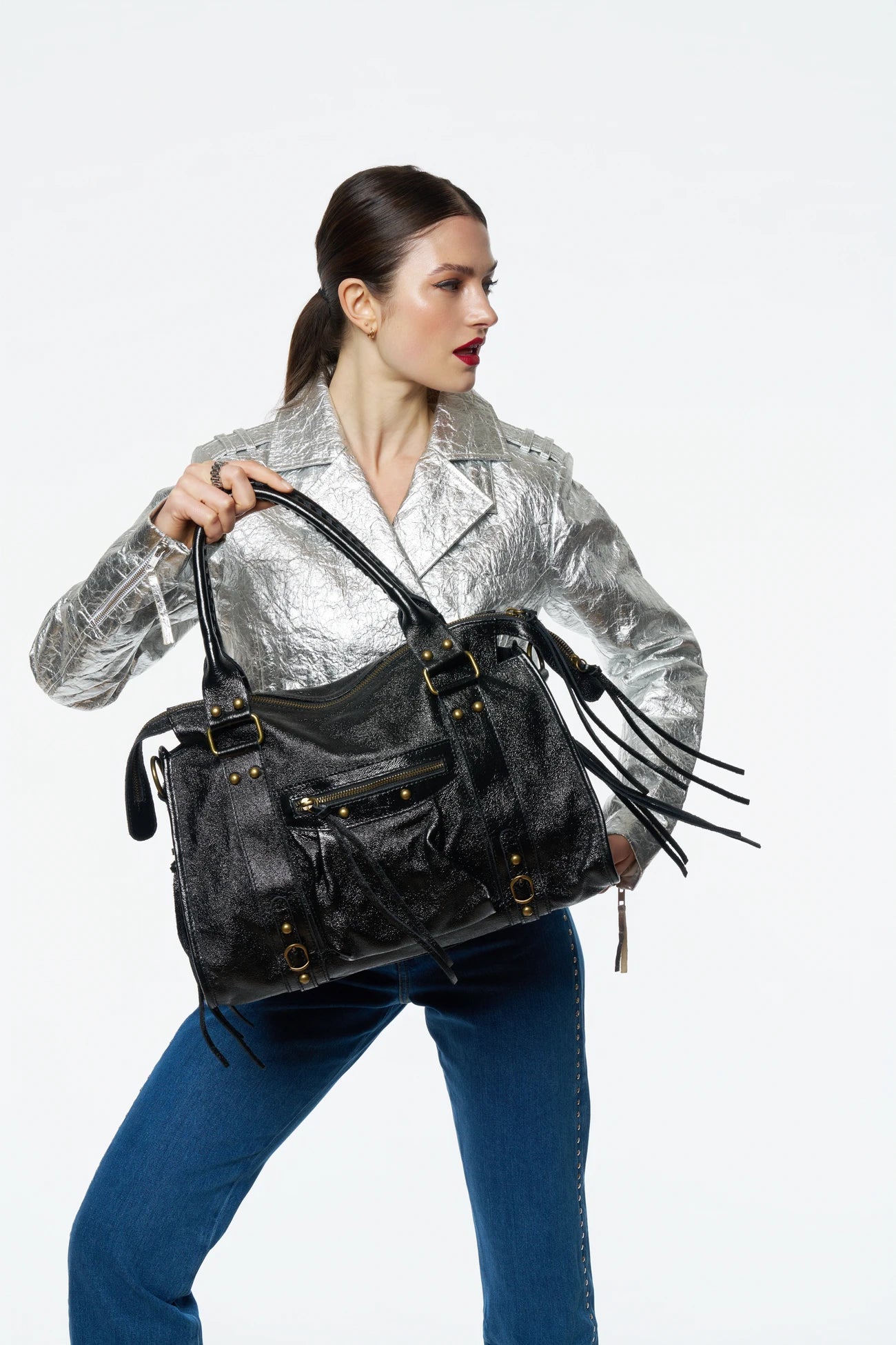 Lorsque notre it-bag MISS STORM se réinvente en cuir effet métallisé noir glossy, cela donne un best-seller absolu !
