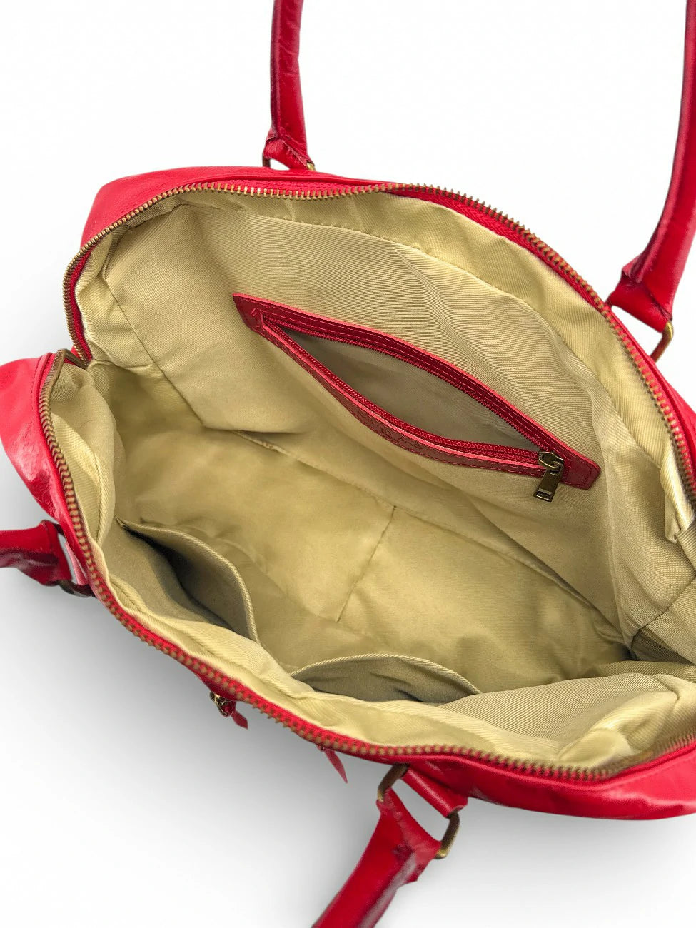 Sac bowling de type bureau en cuir lisse, porté main ou bandoulière, fabriqué en italie.