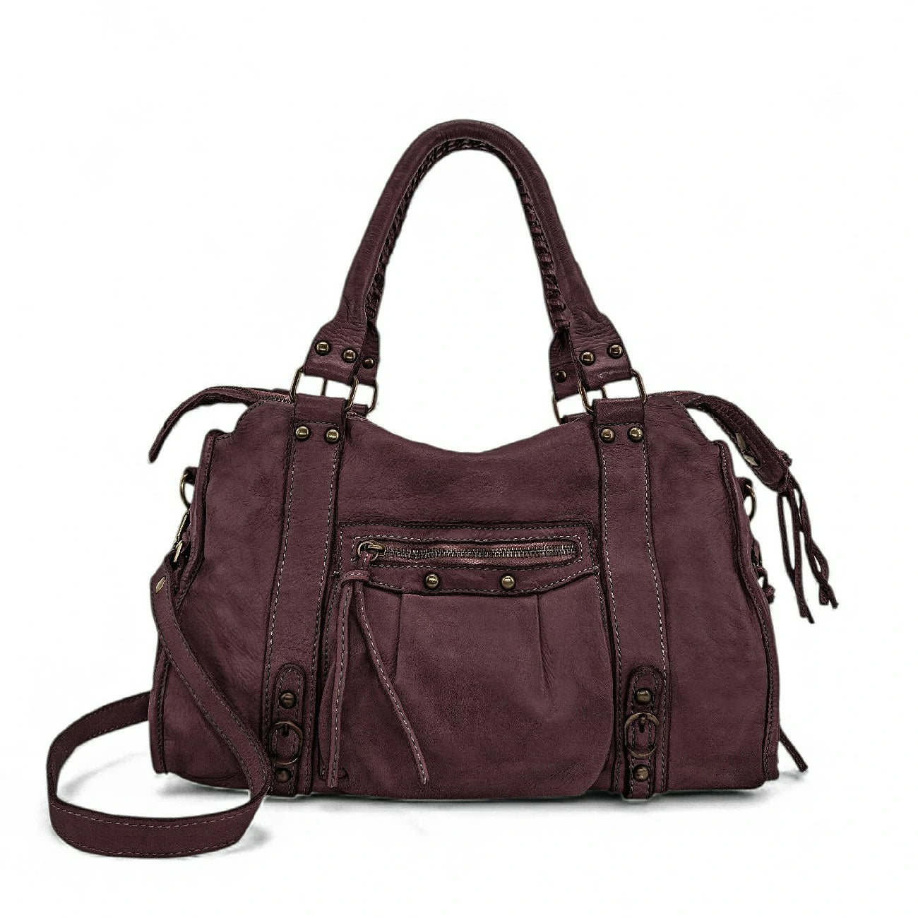 Sac à main en cuir vintage, porté épaule, main et bandoulière, fabriqué en Italie.