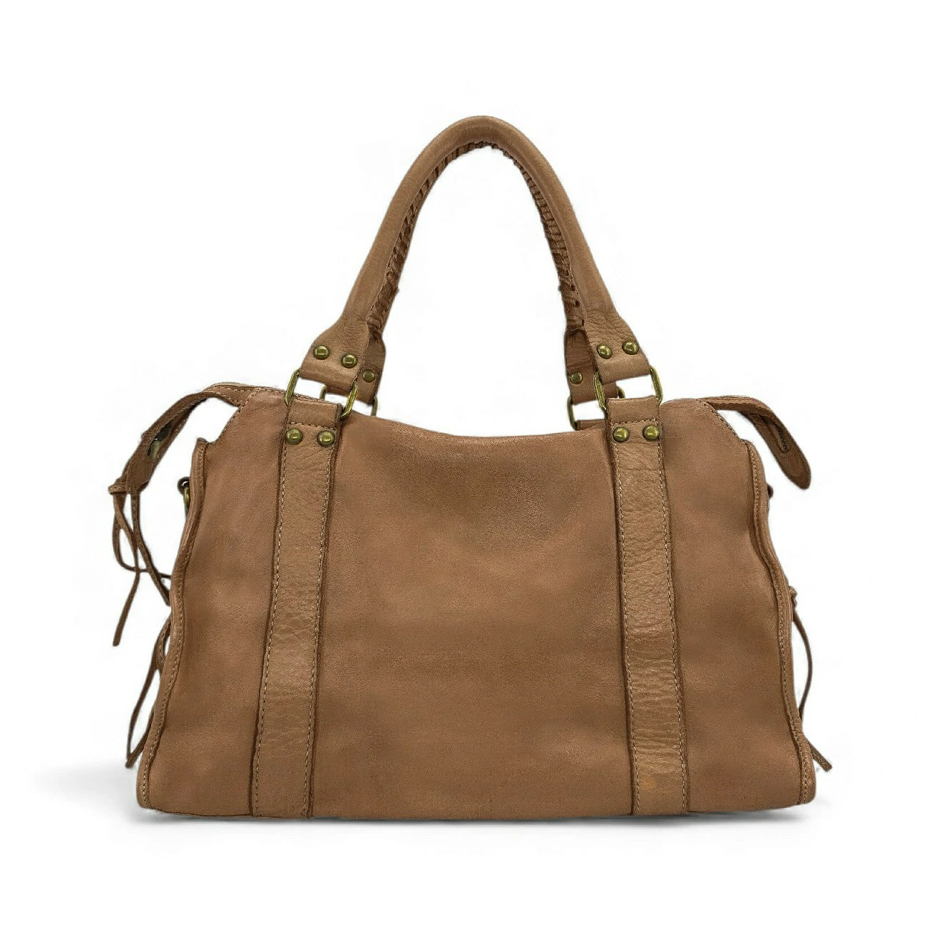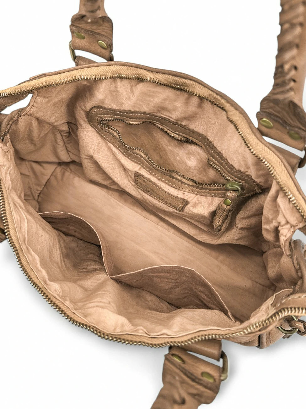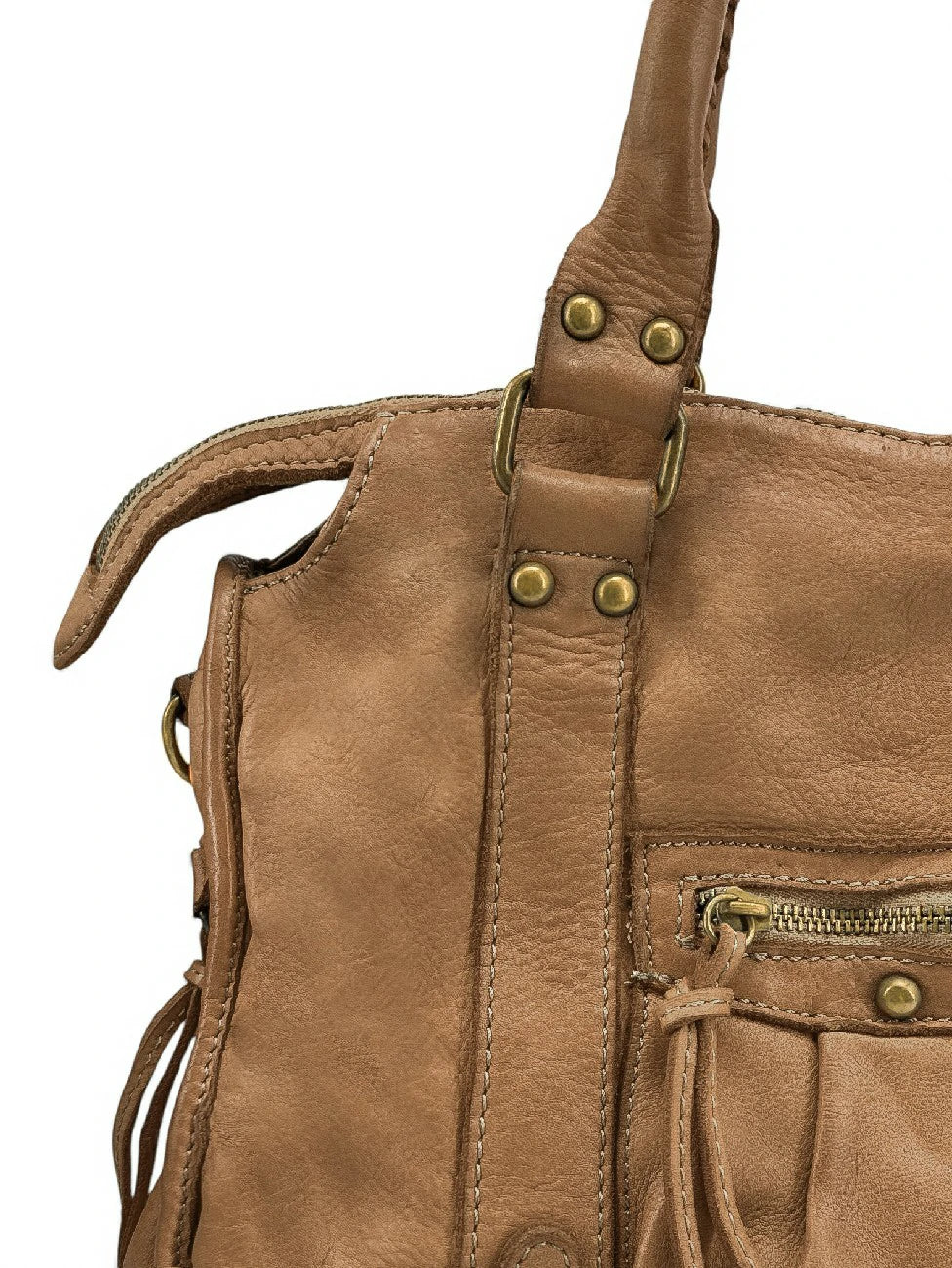 Sac à main en cuir vintage taupe, porté épaule, main et bandoulière, fabriqué en Italie.