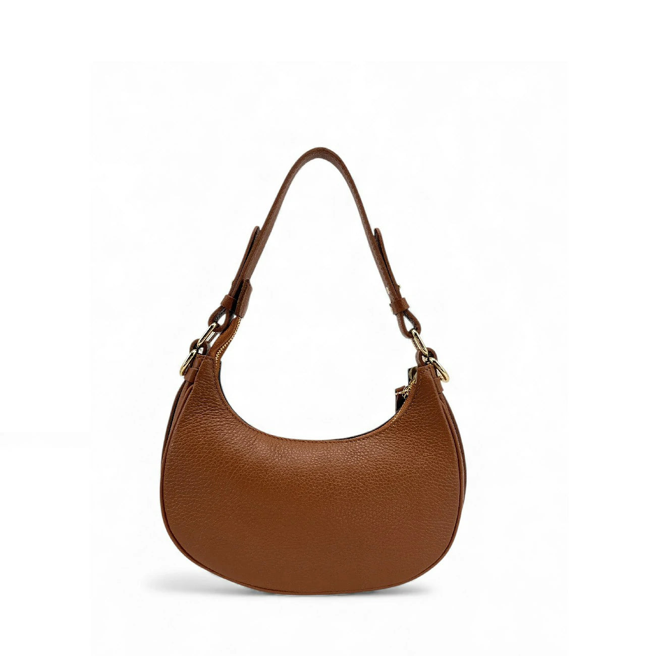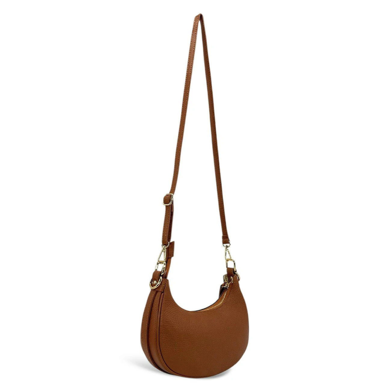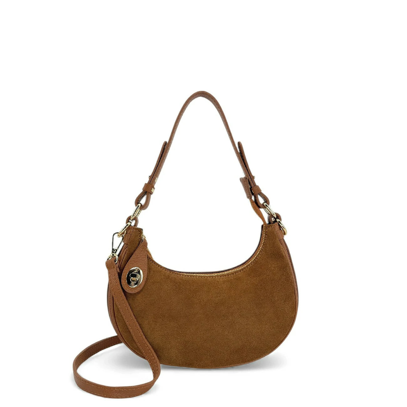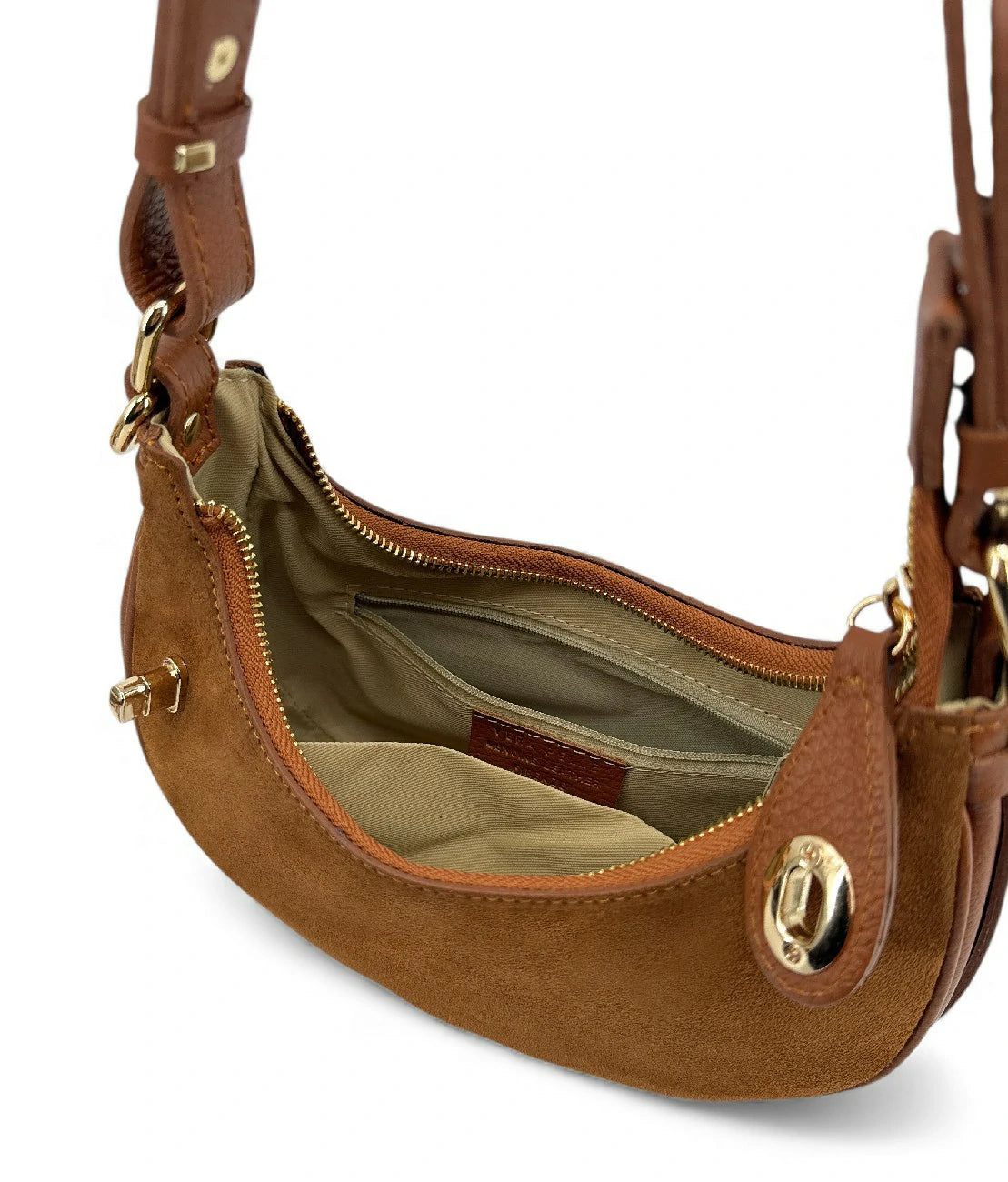 Sac à main demi lune bi-matière en cuir nubuck camel foncé et détails en cuir grainé, porté coude, épaule ou bandoulière, fabriqué en Italie.