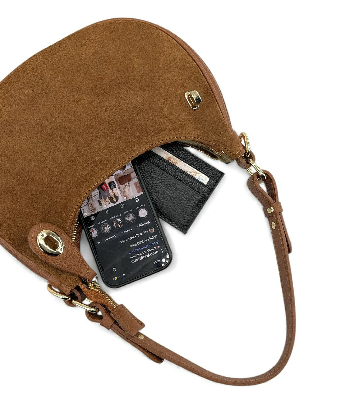 Un sac demi-lune au design bi-matière, sculpté entre daim luxueux et cuir grainé, pensé pour accompagner les silhouettes actives avec un sens inné du style et de la fonctionnalité couture.