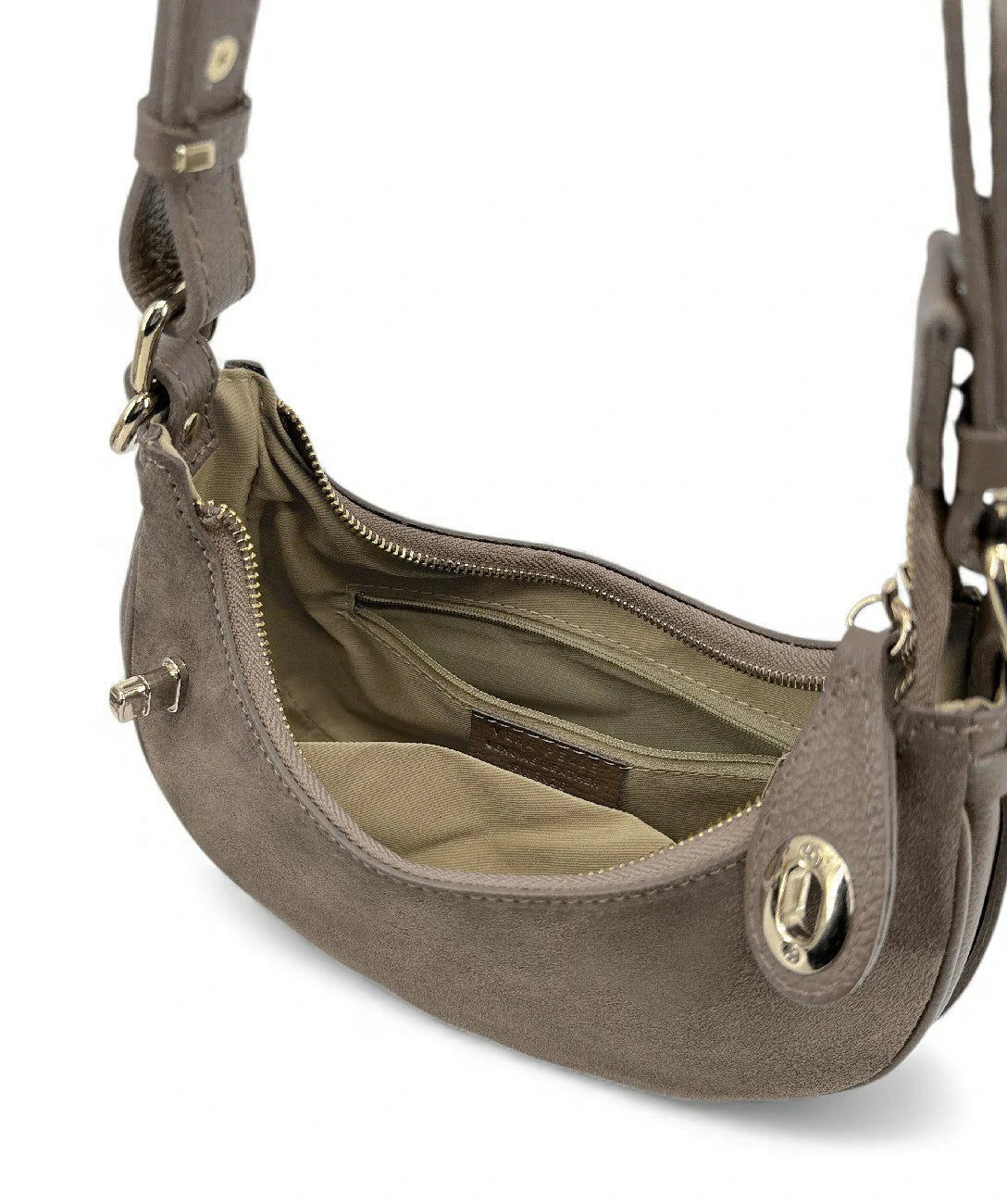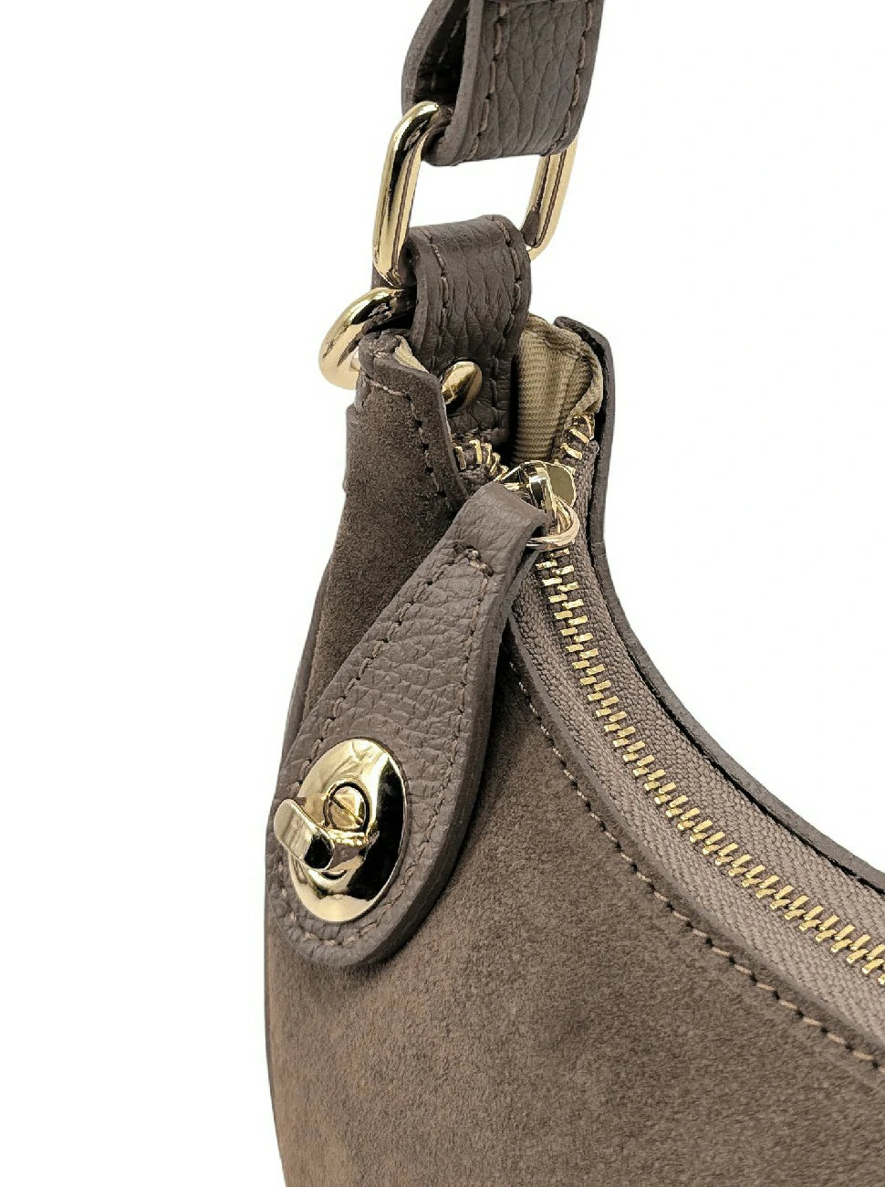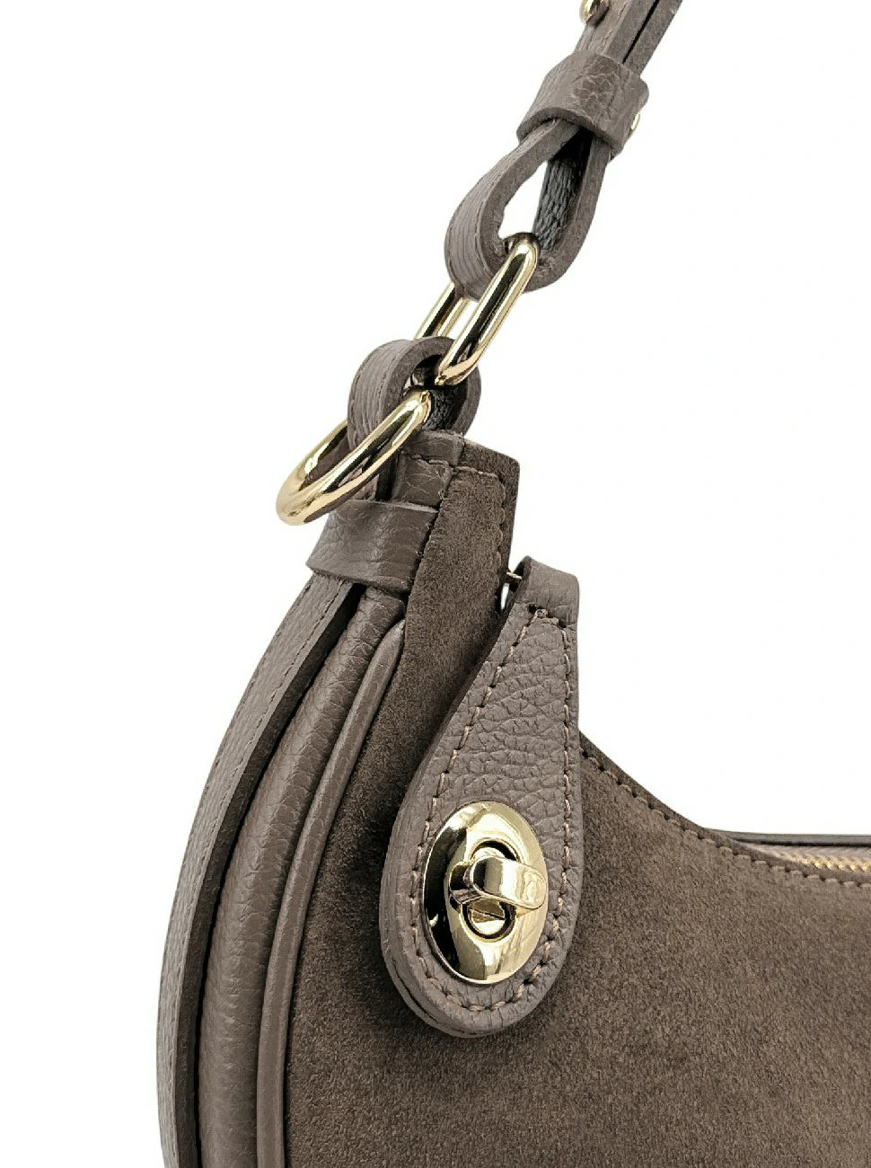 Sac à main demi lune bi-matière en cuir nubuck taupe foncé et détails en cuir grainé, porté coude, épaule ou bandoulière, fabriqué en Italie.