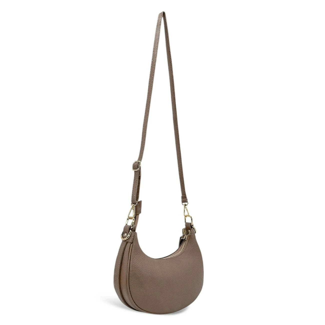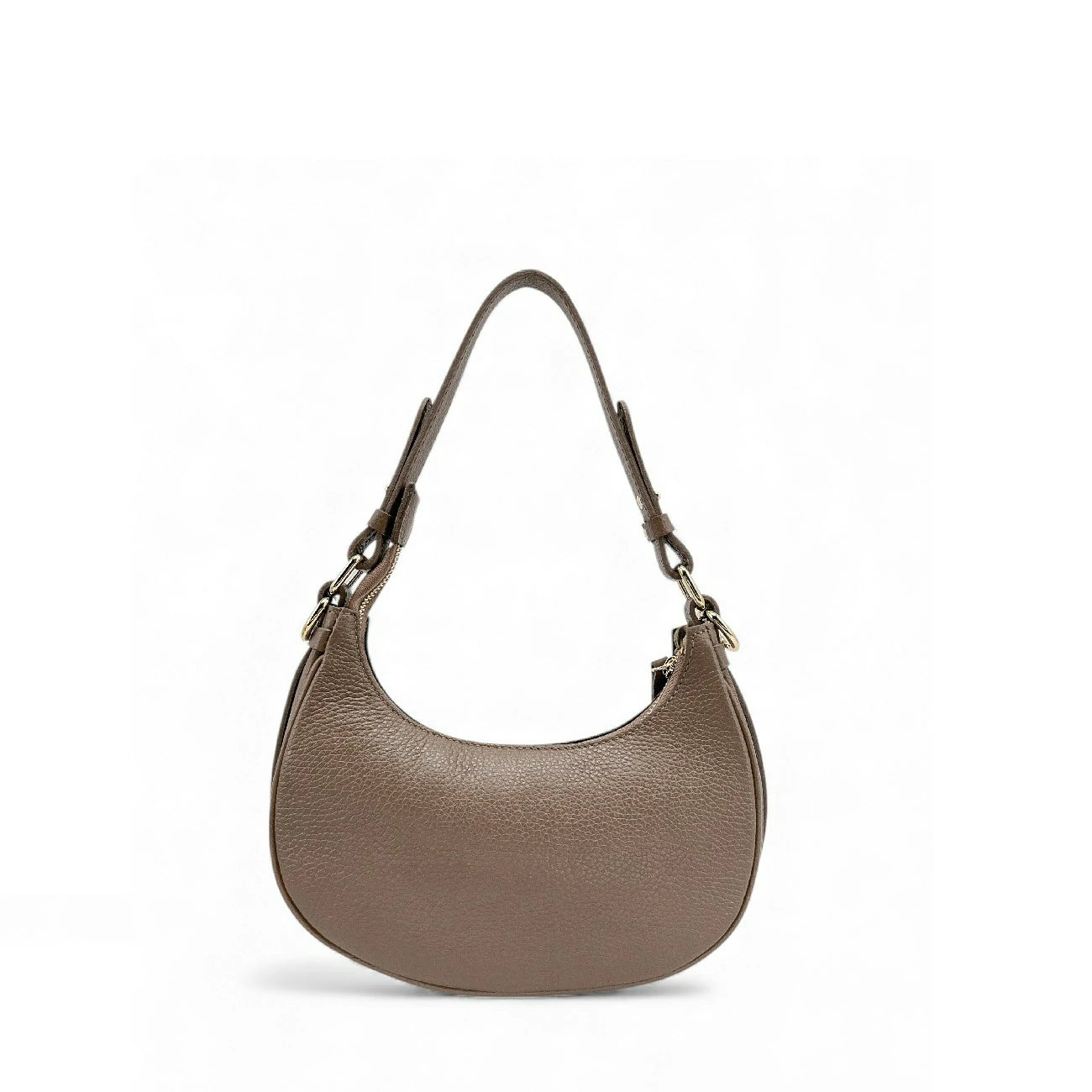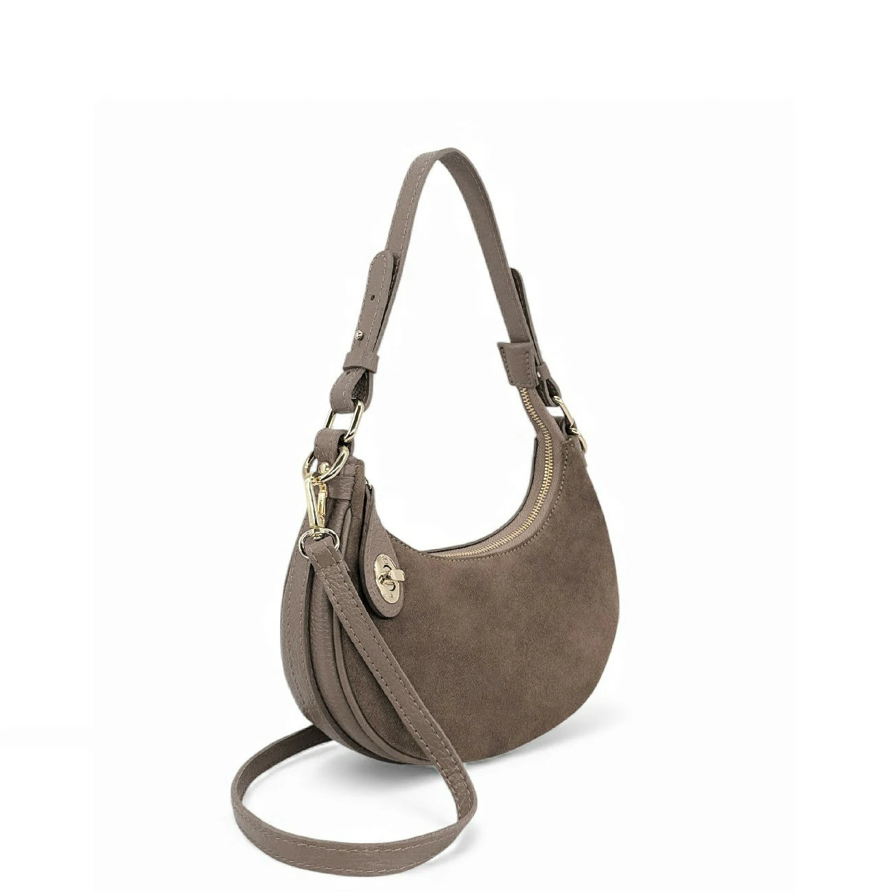 Sac à main demi lune bi-matière en cuir nubuck taupe foncé et détails en cuir grainé, porté coude, épaule ou bandoulière, fabriqué en Italie.