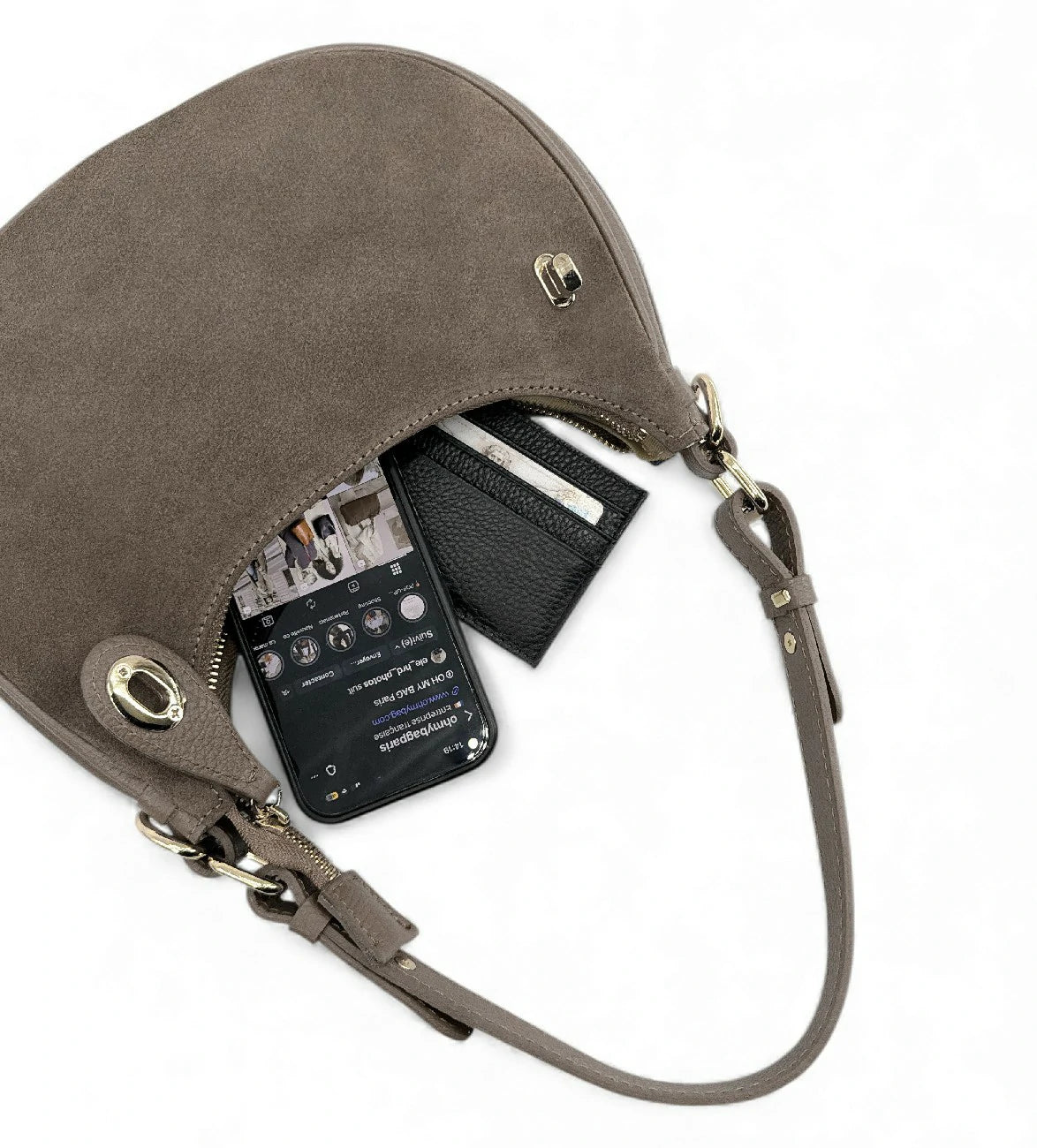 Un sac demi-lune premium à l’allure minimaliste, bi-matière en daim aux détails en cuir grainé. Sac à main pensé pour conjuguer sophistication, praticité et élégance versatile au quotidien et pour les grandes occasions.