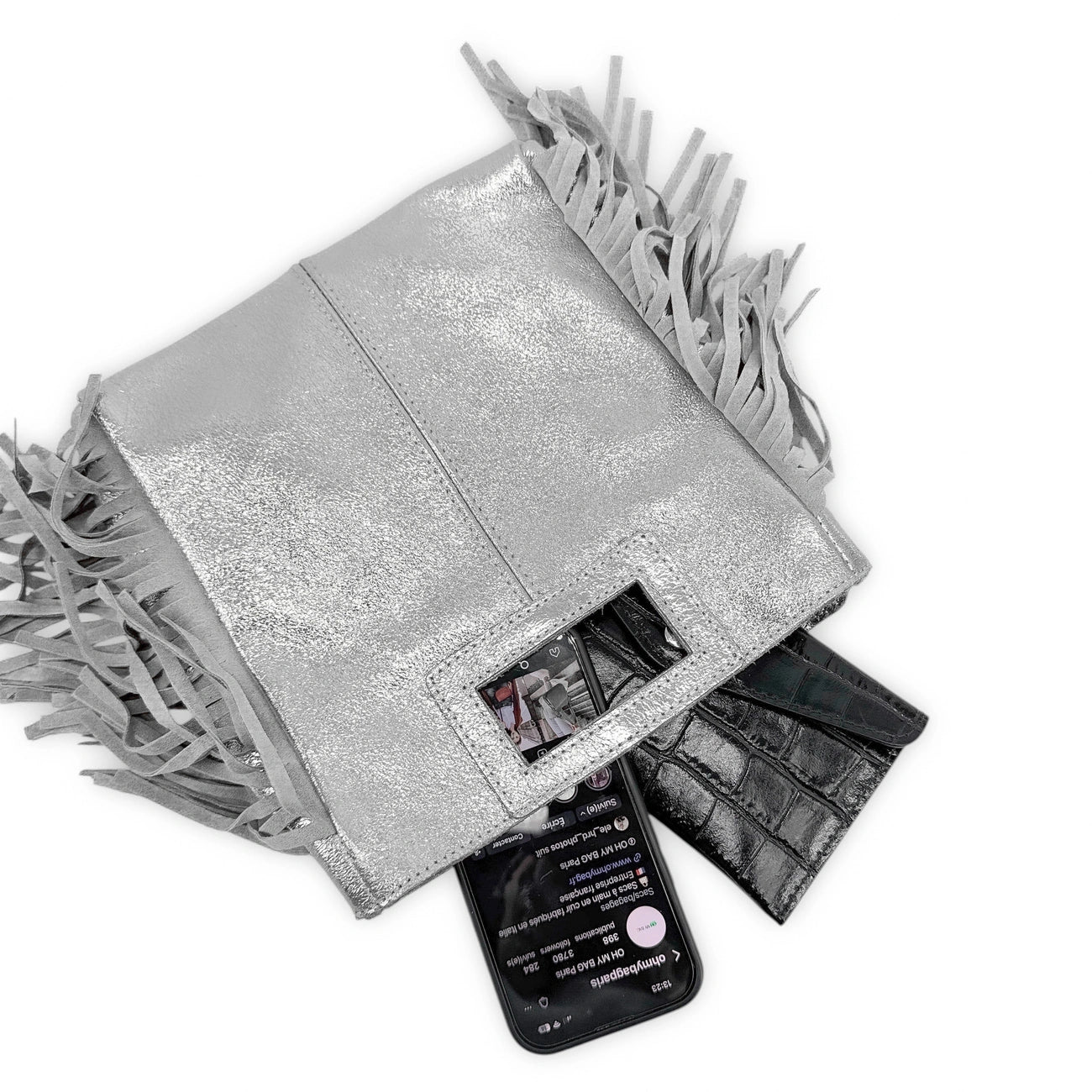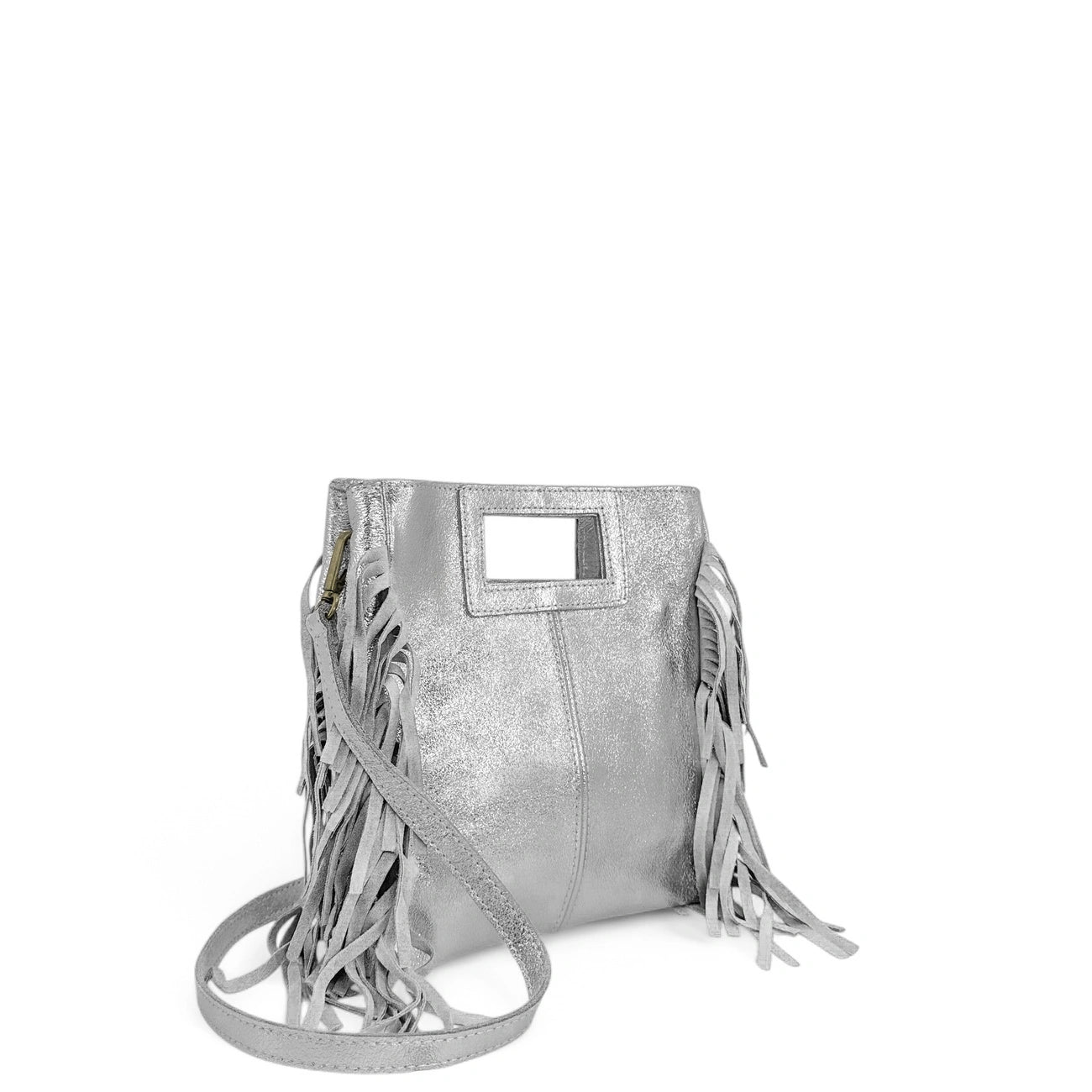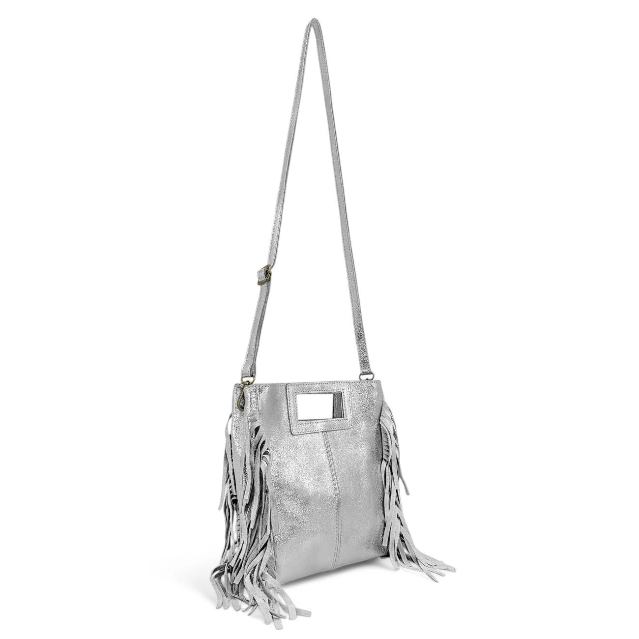 | Dénomination | Sac à main bandoulière à franges en cuir irisé et daim ENOLA Argent clair |