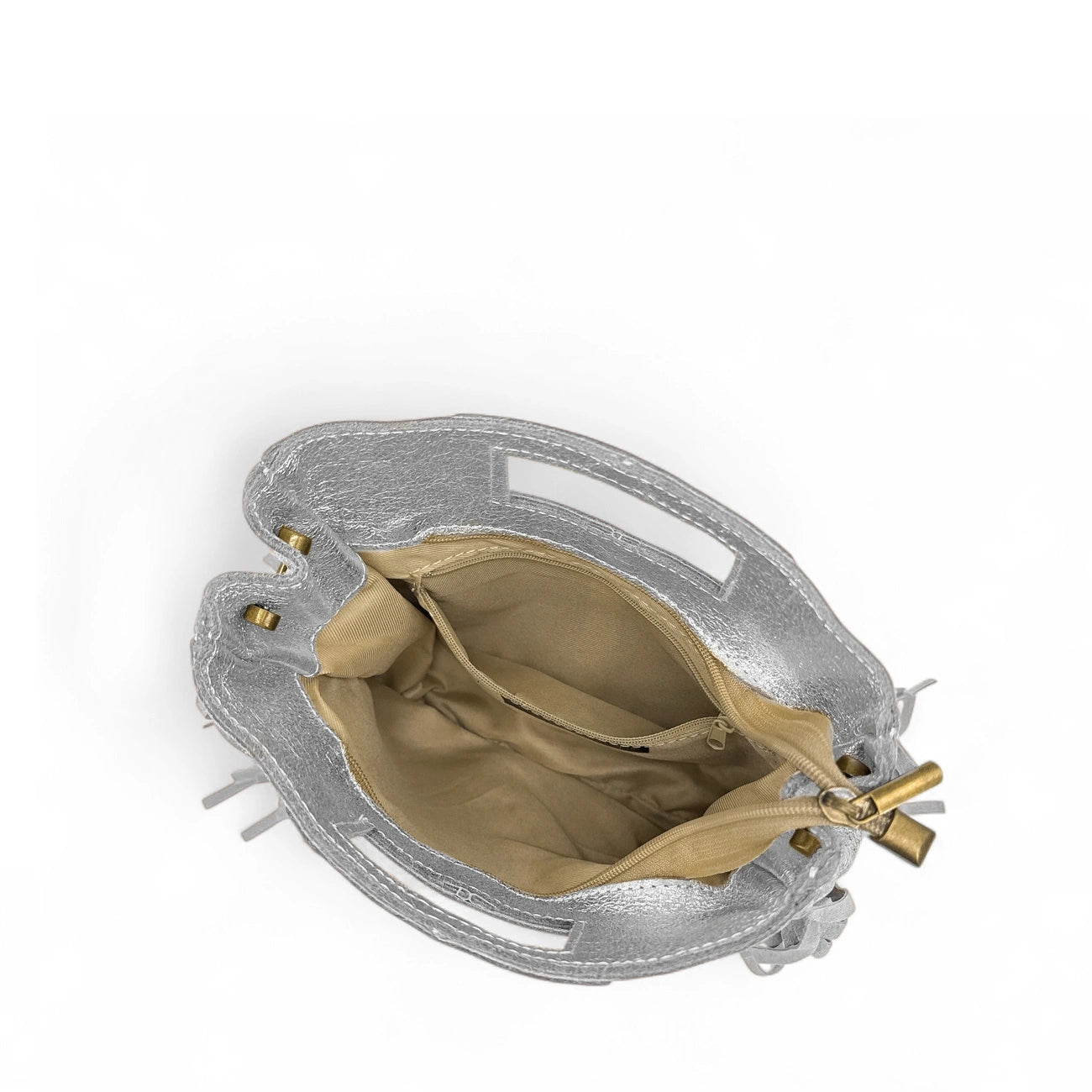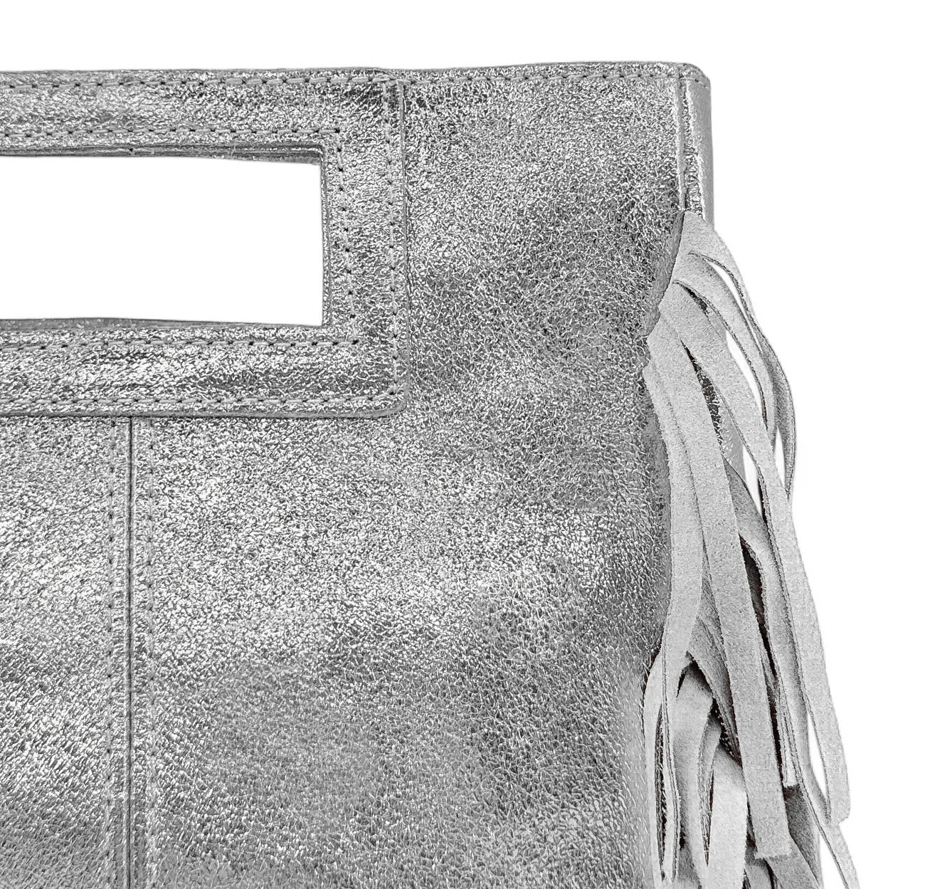 Sac à main à franges en cuir métallisé et daim, porté main ou bandoulière, fabriqué en Italie.