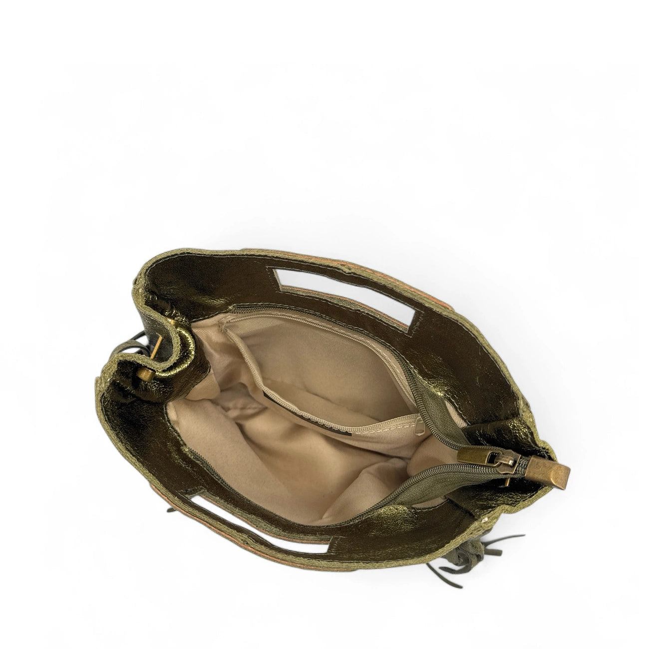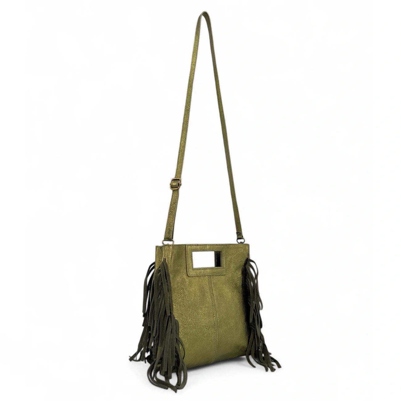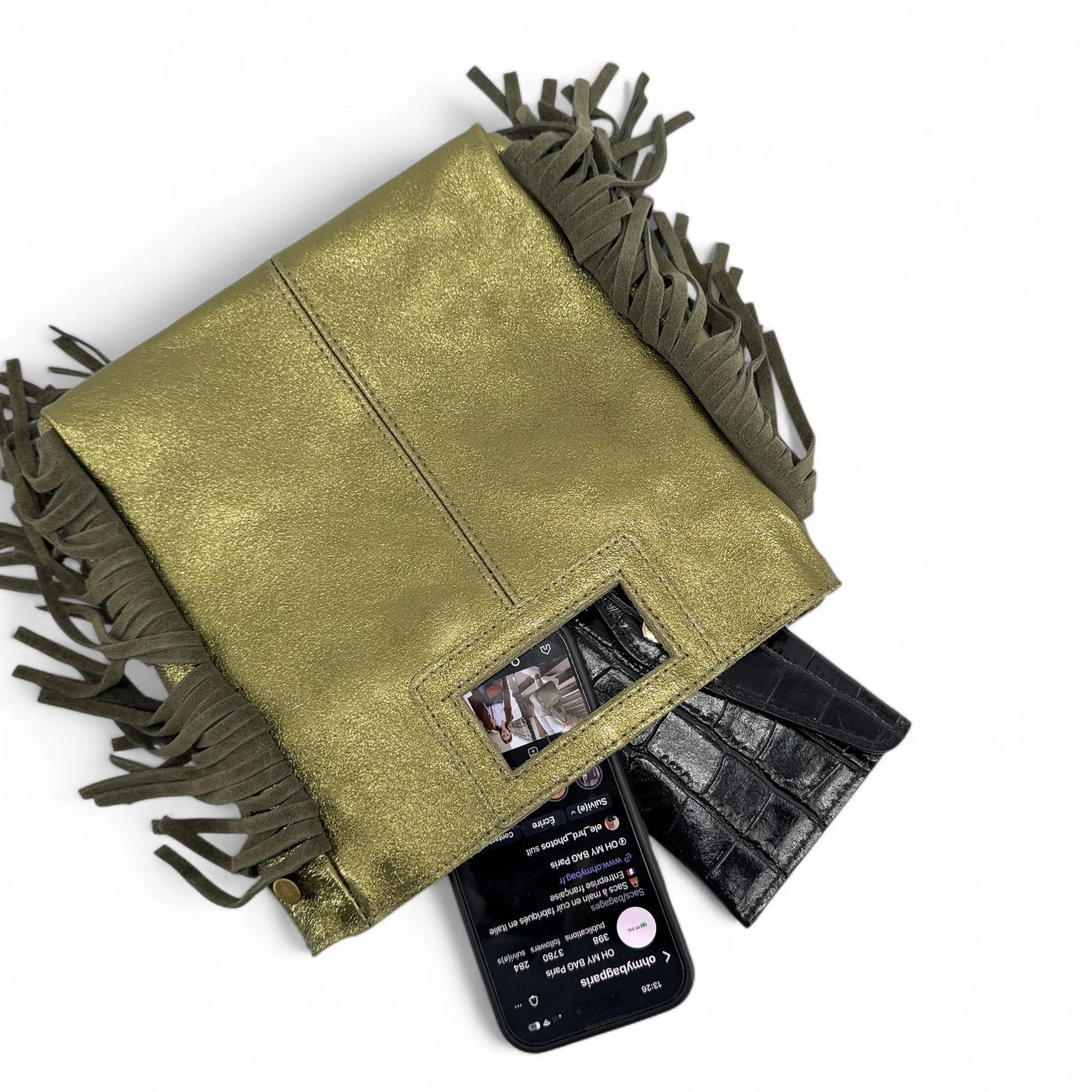 Sac à main bandoulière à franges en cuir irisé et daim ENOLA Kaki irisé