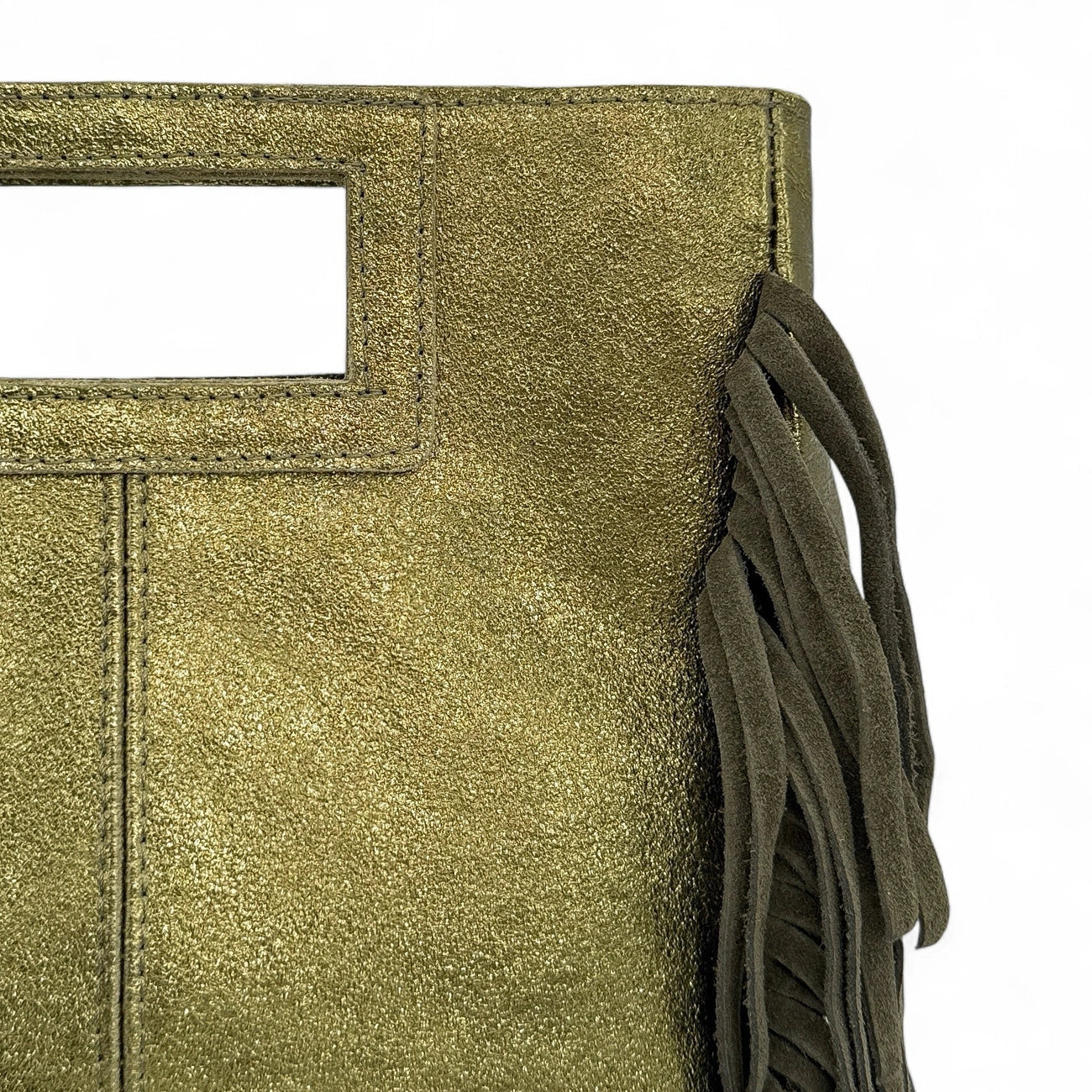 Sac à main à franges en cuir métallisé et daim, porté main ou bandoulière, fabriqué en Italie.