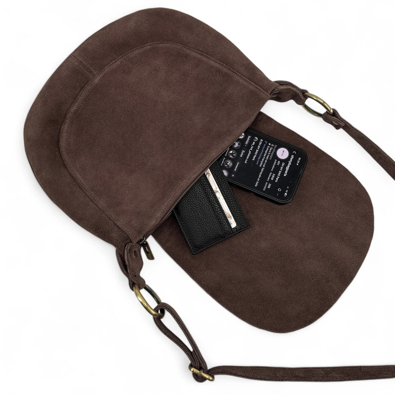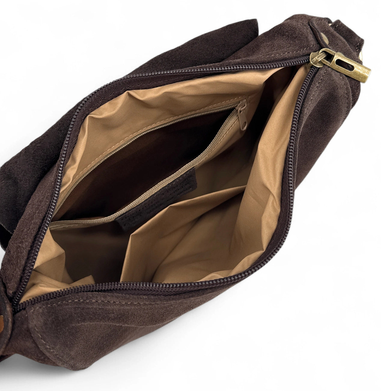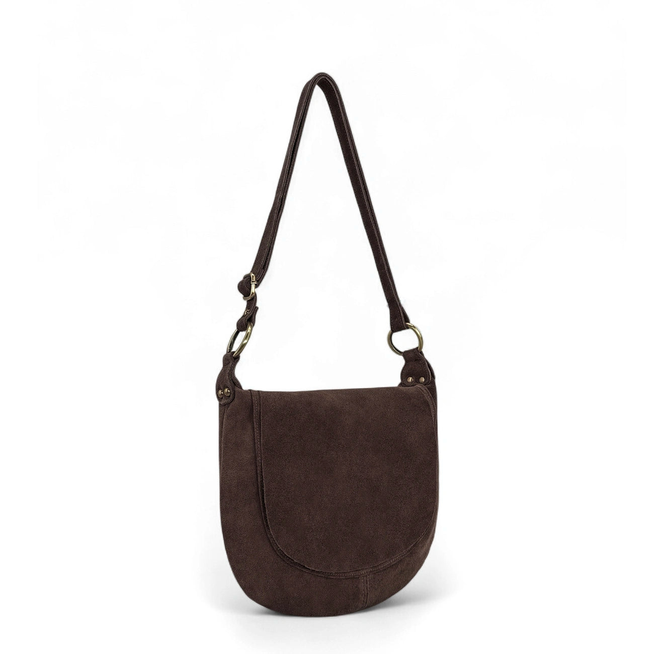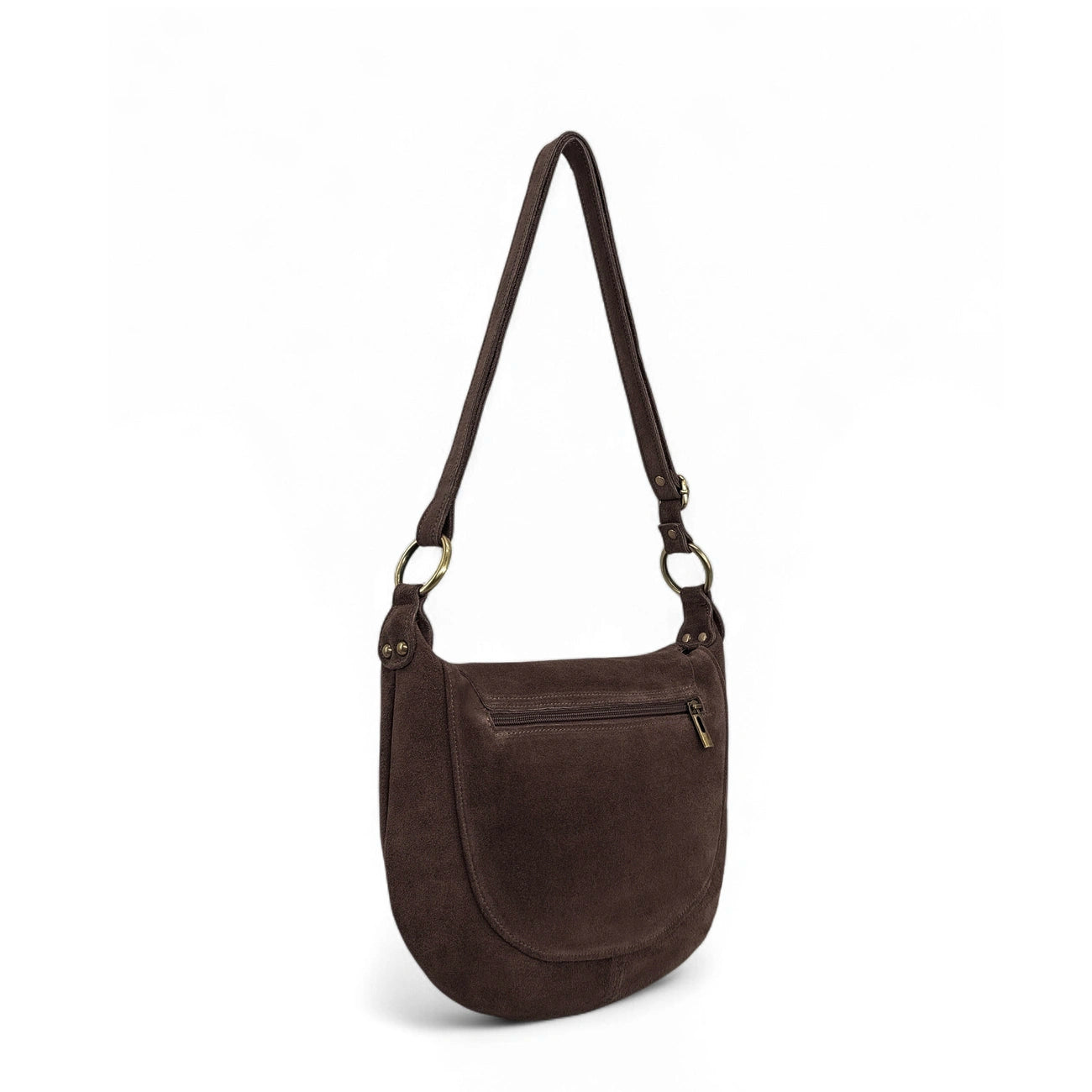 Sac besace en cuir nubuck marron foncé porté épaule ou bandoulière, fabriqué en Italie.