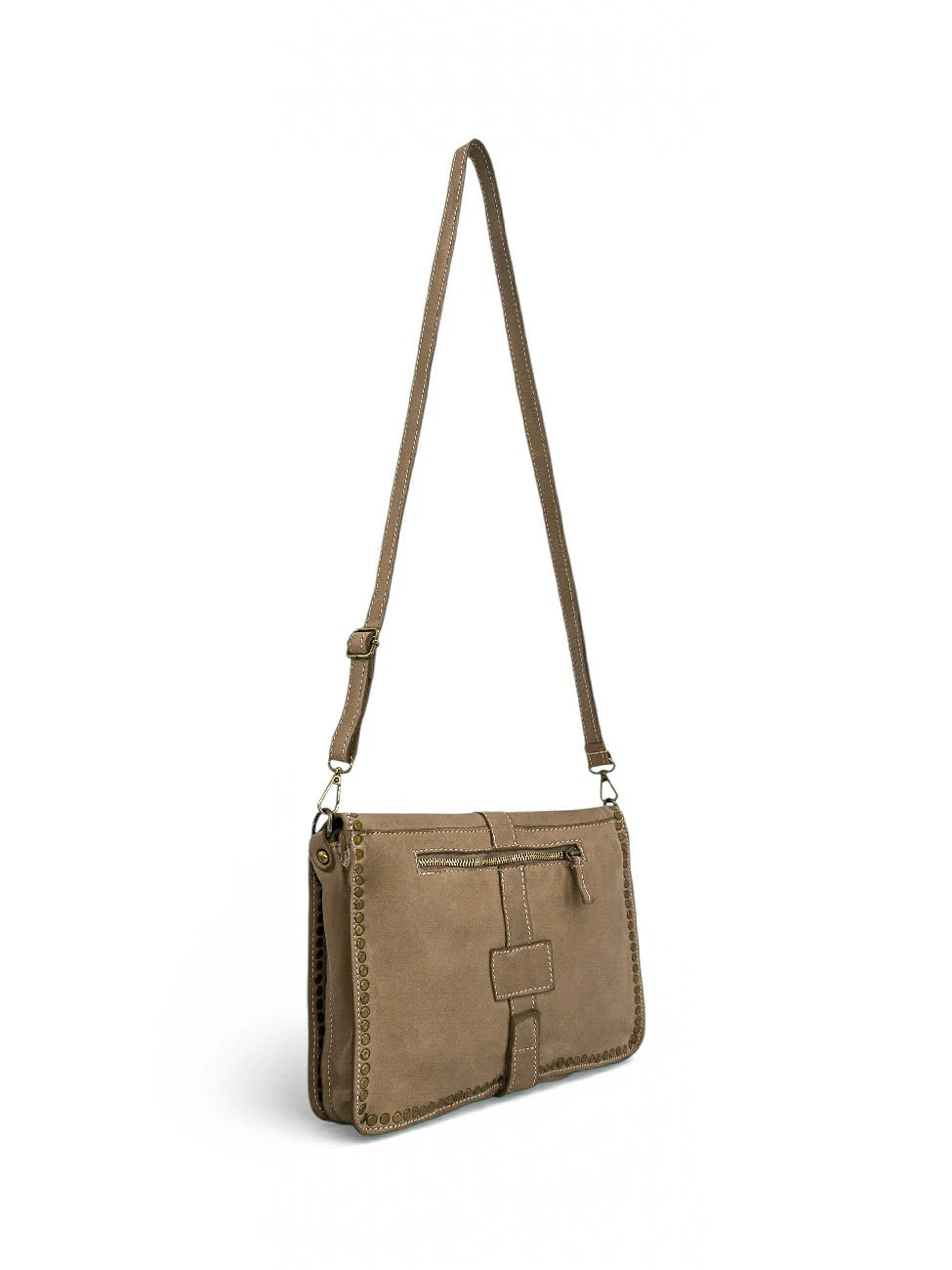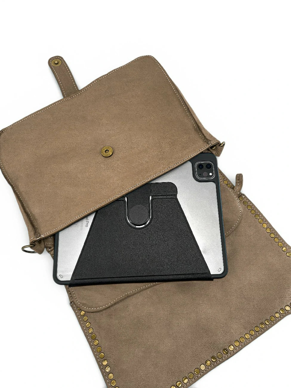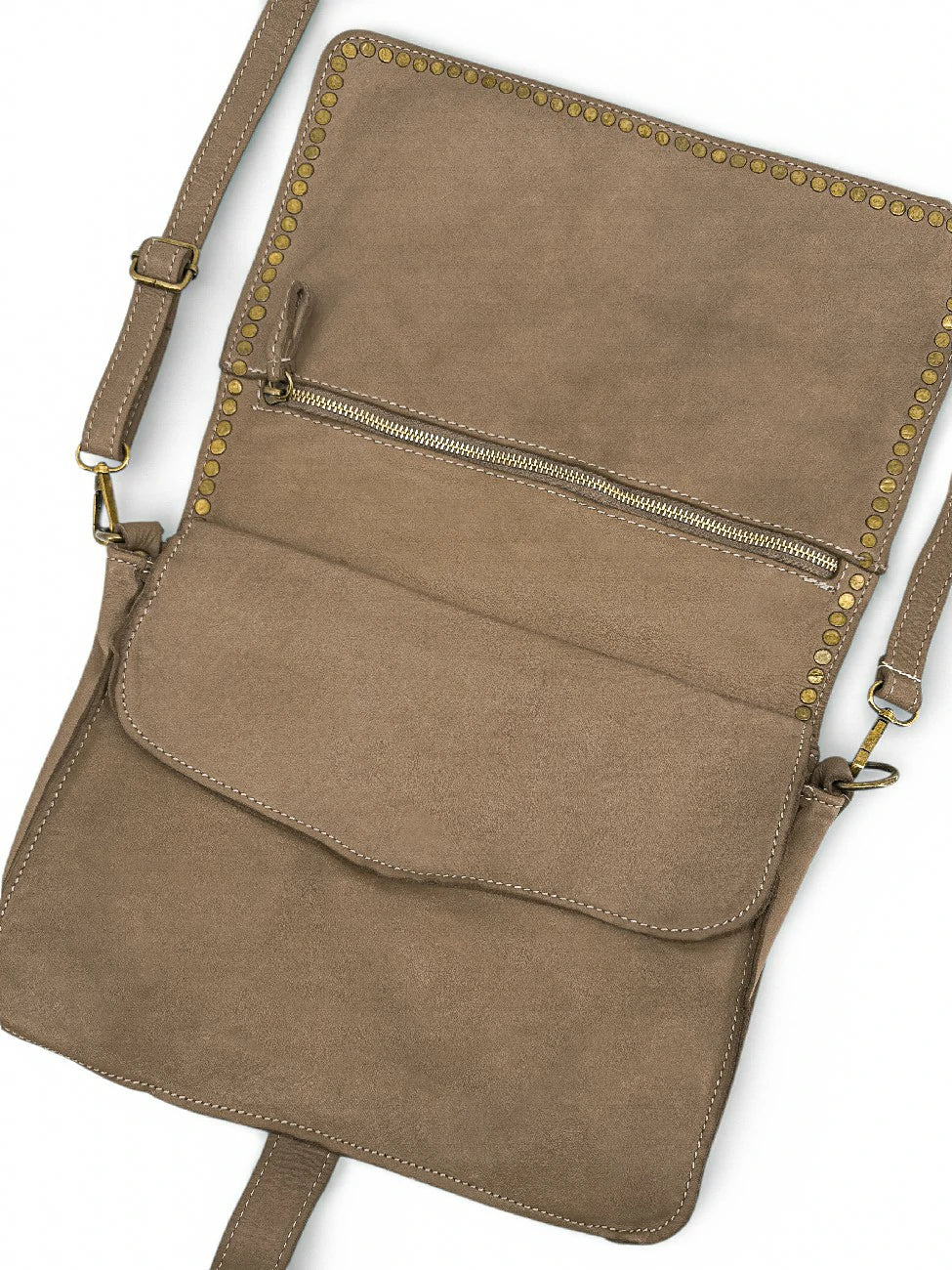 Ce sac besace en cuir vintage est doté d'un style rock bohème qui fera craquer les modeuses. Son rabat clouté en laiton vieilli, sa bandoulière amovible et son côté multi-compartiments lui donnent une belle présence à laquelle s'ajoute une praticité à toute épreuve. Sa taille idéale accueille tablette, portefeuille et essentiels beauté tout en conservant une silhouette élégante, parfaite du matin au soir.