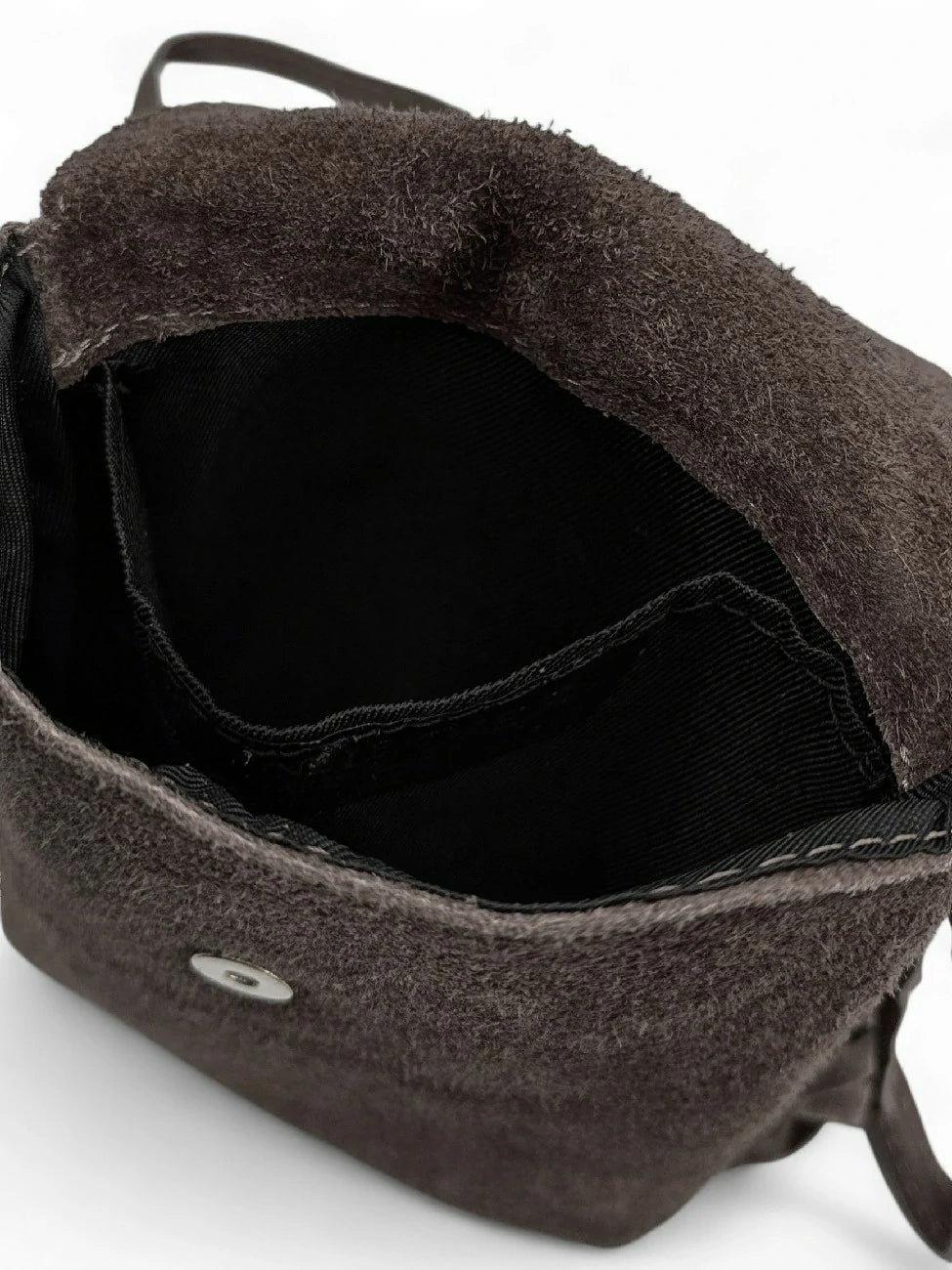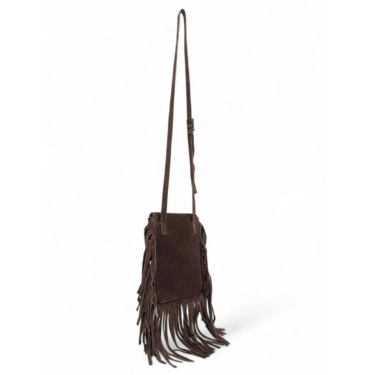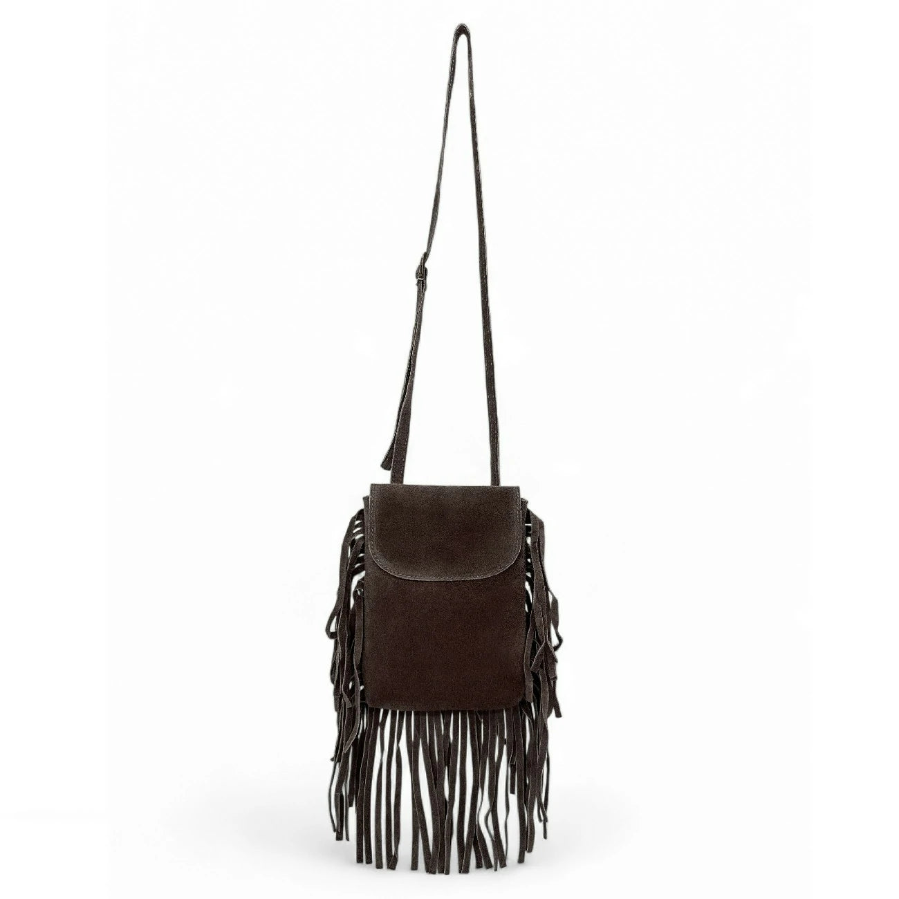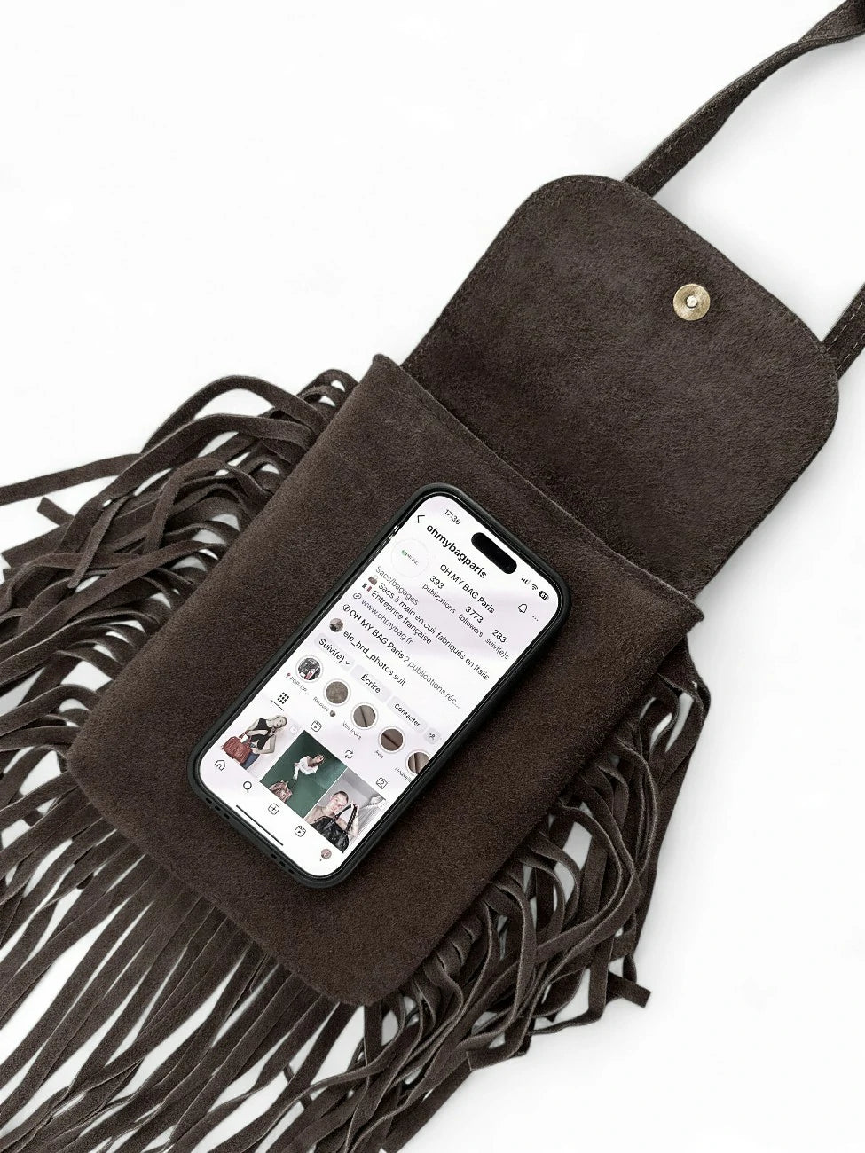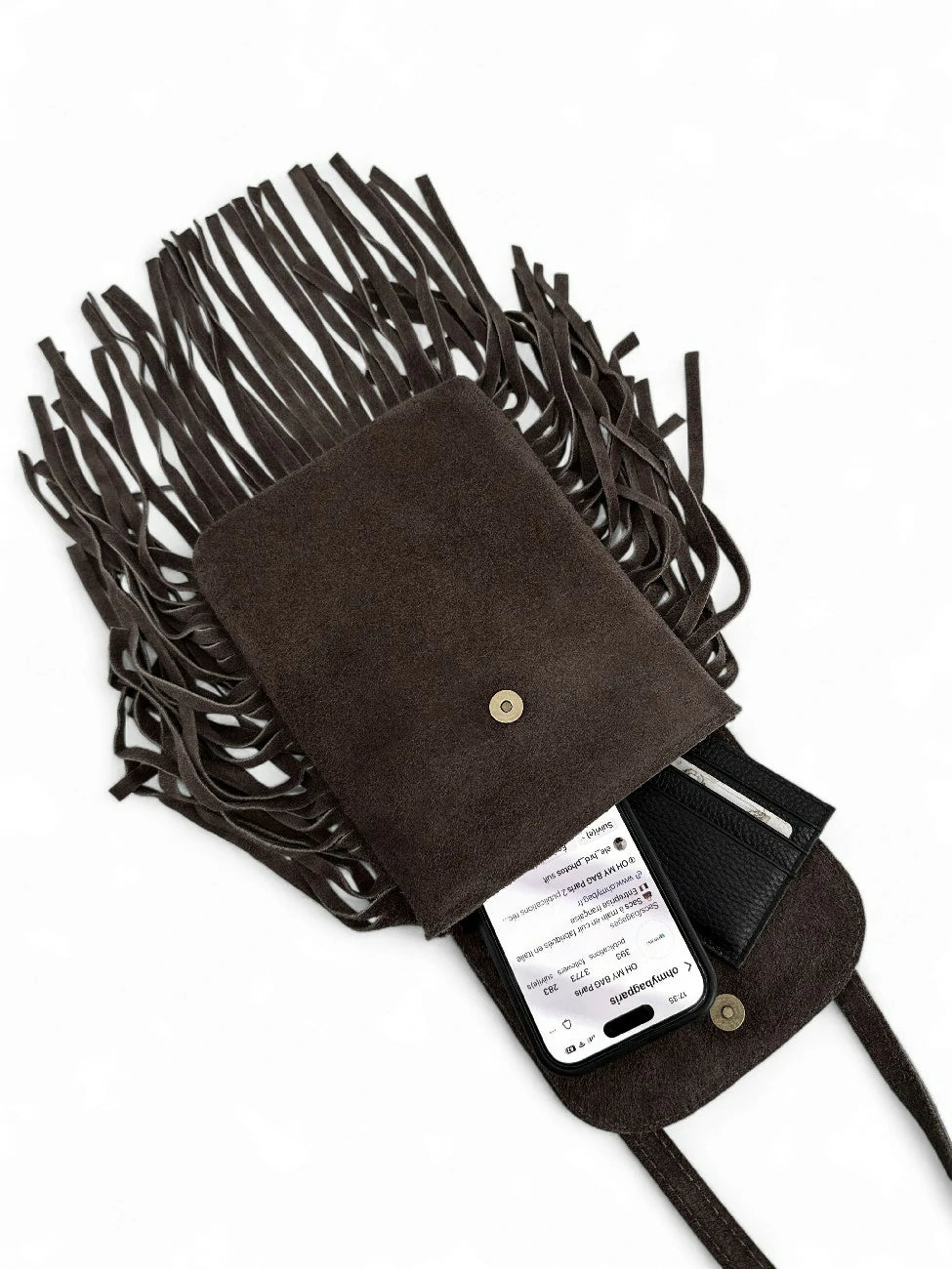 Dans sa version chocolat, cette mini besace femme révèle son esprit urbain et sensuel. Le cuir nubuck velouté s’associe à des franges au mouvement fluide pour une allure bohème-chic. Idéal en crossbody sur un blazer oversize ou une robe fluide : l’élégance texturée qui sublime chaque silhouette.