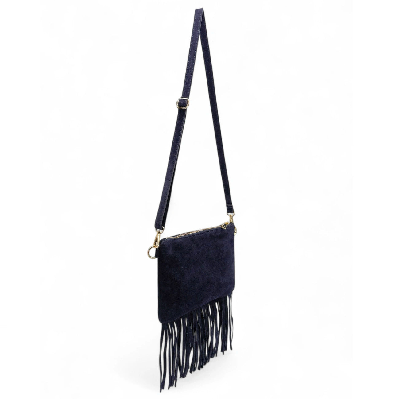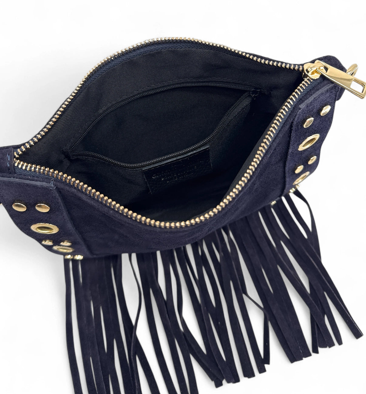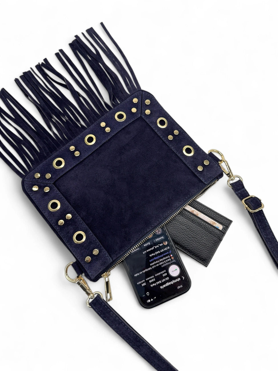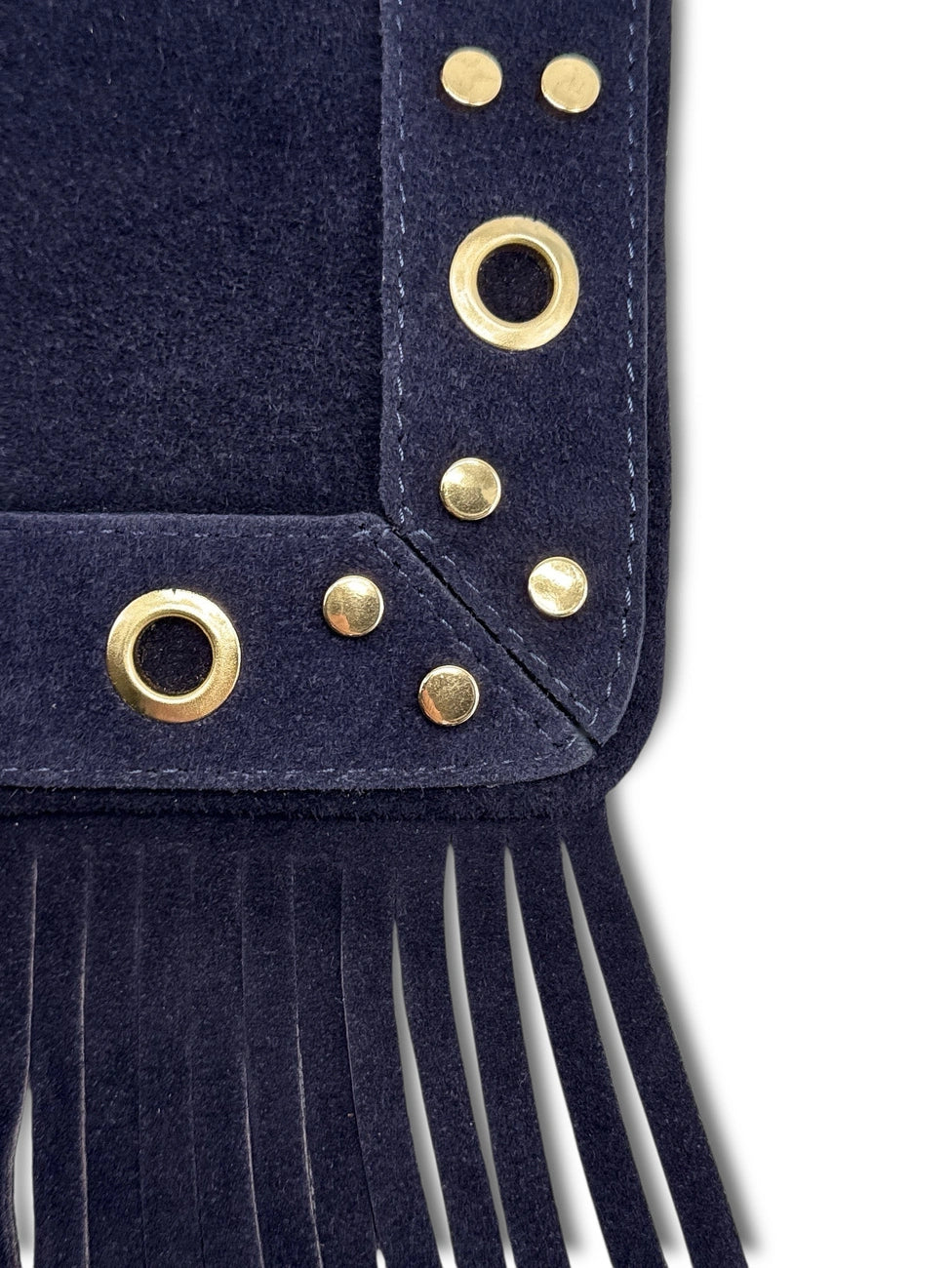 Sac besace à clous et franges, porté épaule ou bandoulière, en cuir nubuck fabriqué en Italie.