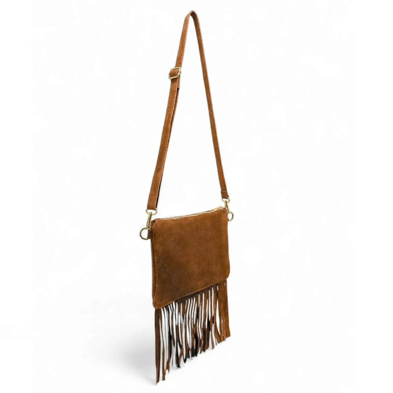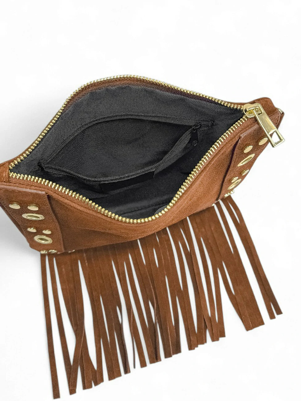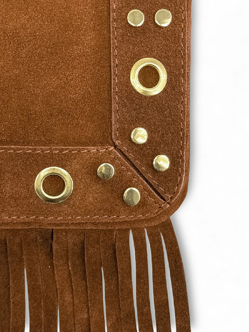Sac besace à clous et franges, porté épaule ou bandoulière, en cuir nubuck camel foncé fabriqué en Italie.