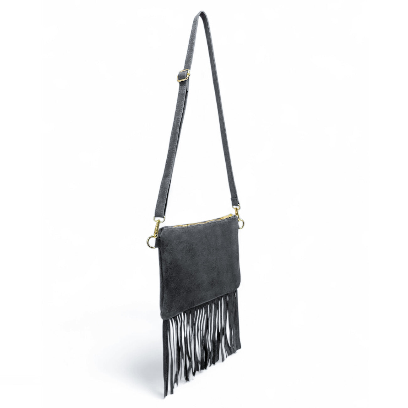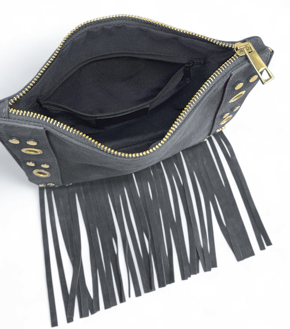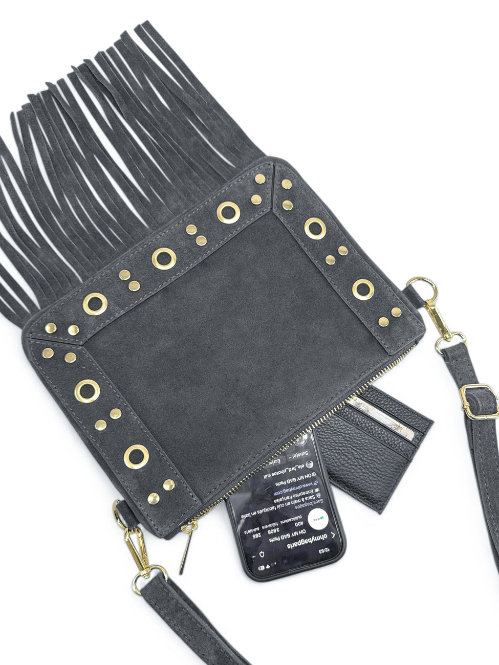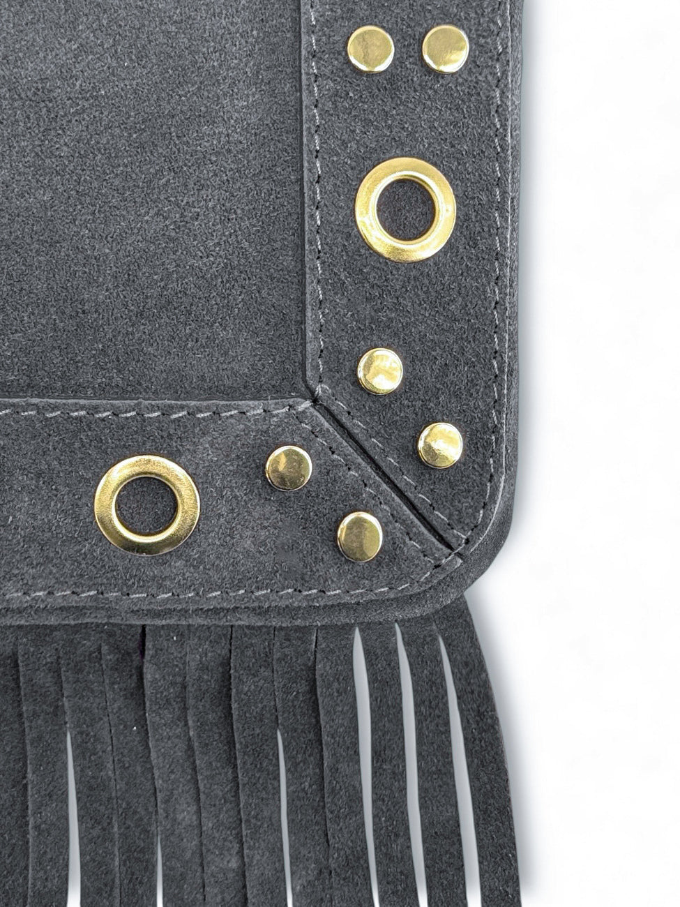 Sac besace à clous et franges, porté épaule ou bandoulière, en cuir nubuck fabriqué en Italie.