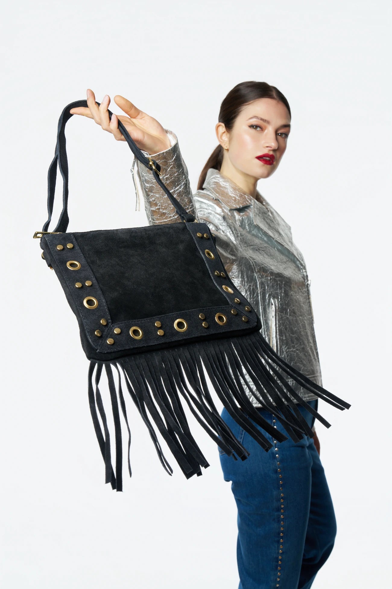 Sac besace à clous et franges, porté épaule ou bandoulière, en cuir nubuck fabriqué en Italie.