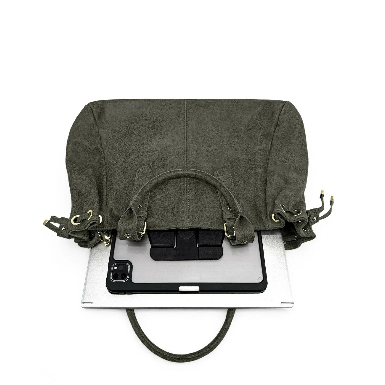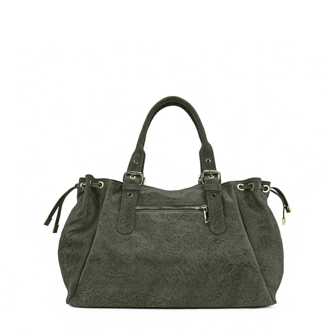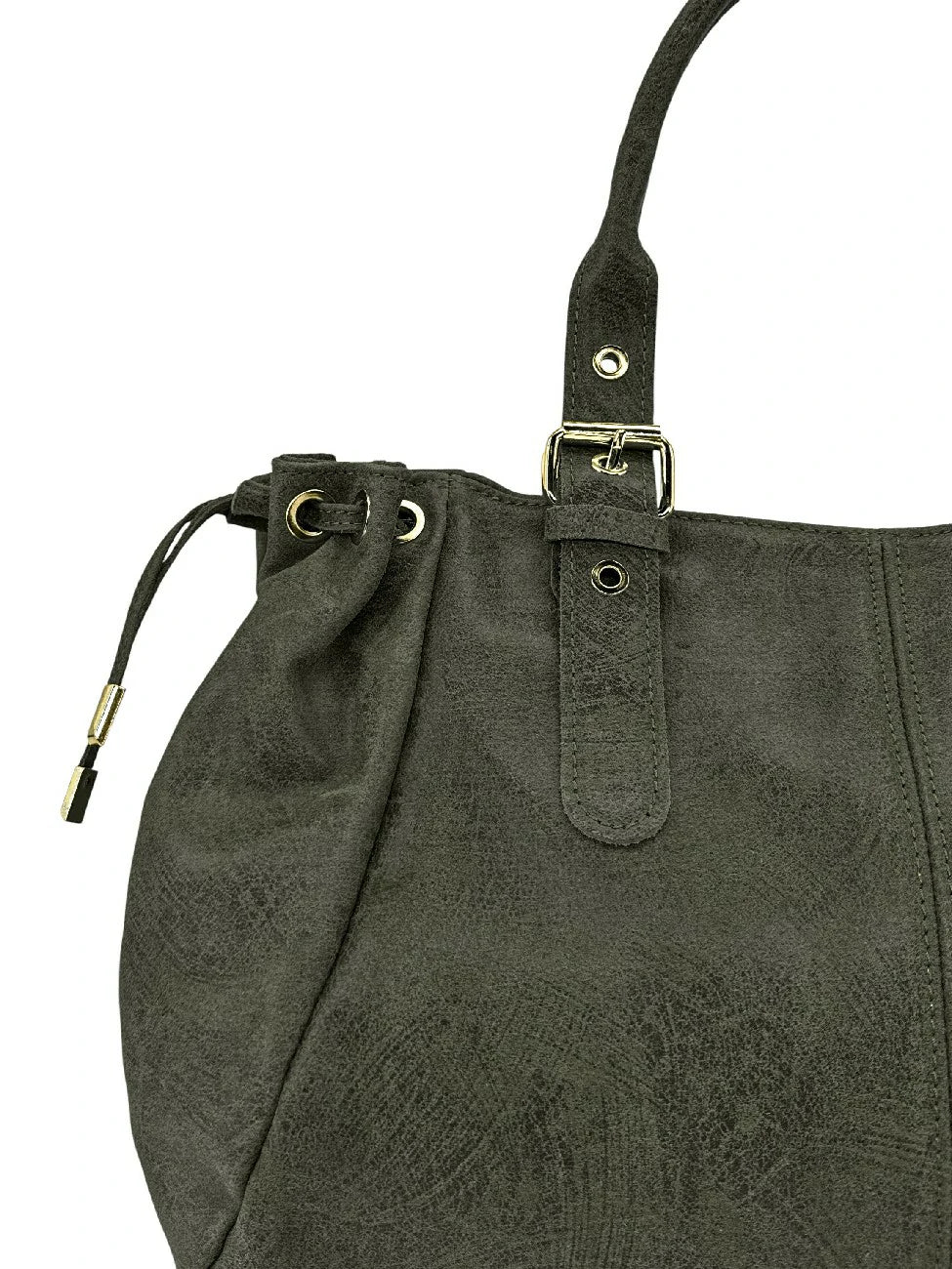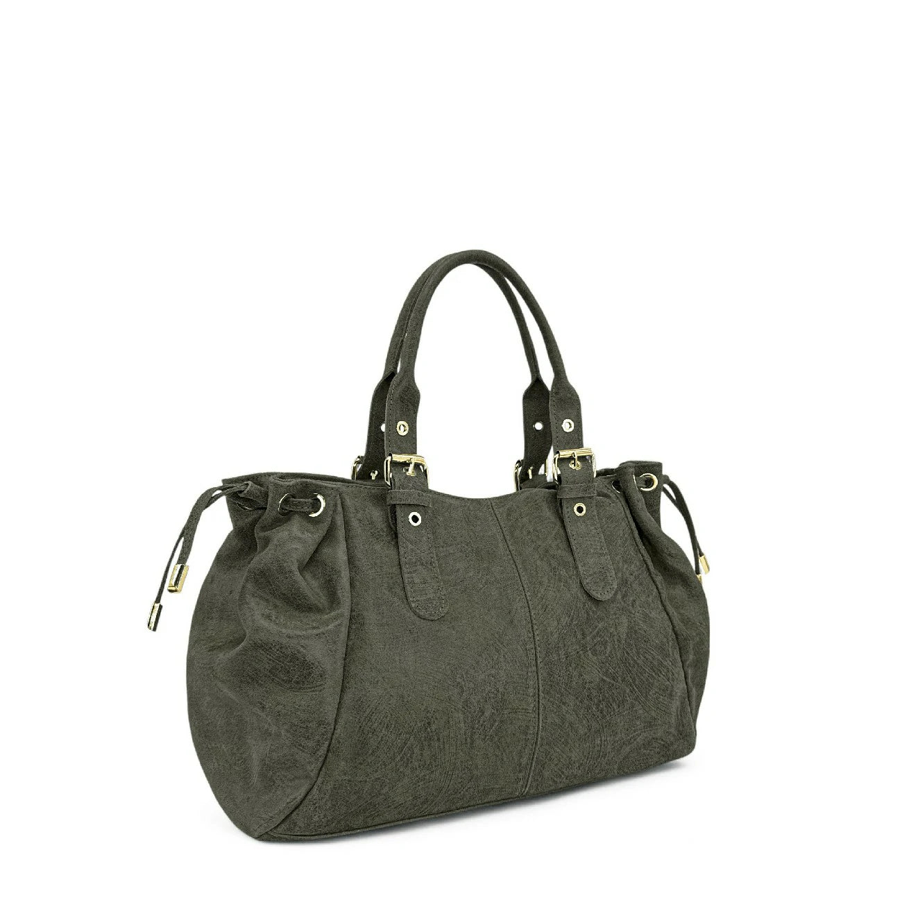 Sac bowling en cuir kaki à motif gratté, porté épaule, fabriqué en Italie.