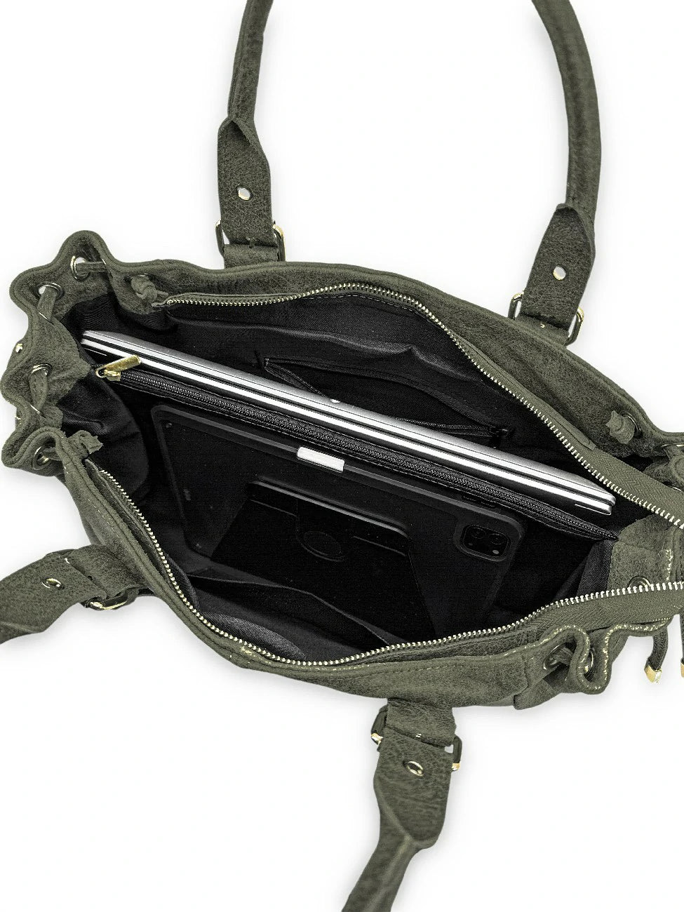 Cuir brossé mat et ferrures dorées habillent ce grand format à la ligne très actuelle capable d'accueillir un ordinateur 14 pouces. Son compartiment principal est divisé par une poche zippée centrale et offre des perspectives de rangement inestimables. Toutefois, si des pochettes A4 peu épaisses trouveront leur place de part et d'autres, ce sera plus compliqué pour des classeurs plus volumineux. Comme tous les cuirs brossés, on ne recommande pas de charger le sac à main plus que son volume ne l'offre : la pression sur le cuir brossé risquerait de fragiliser celui-ci.