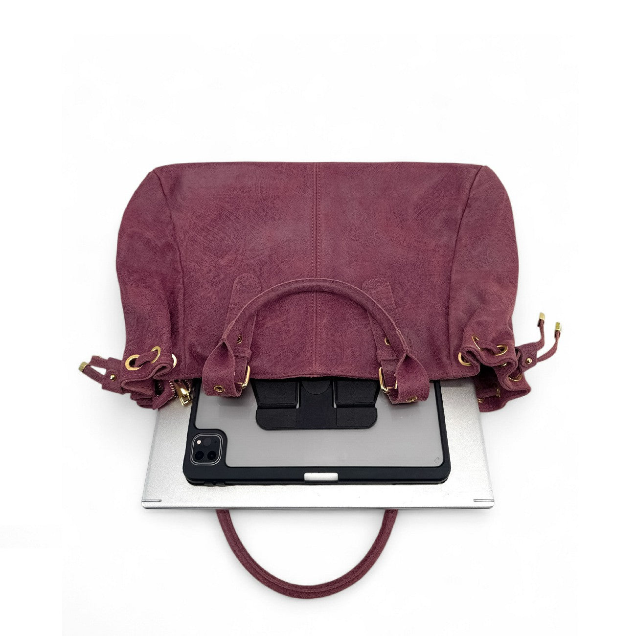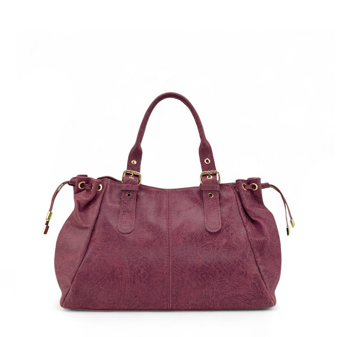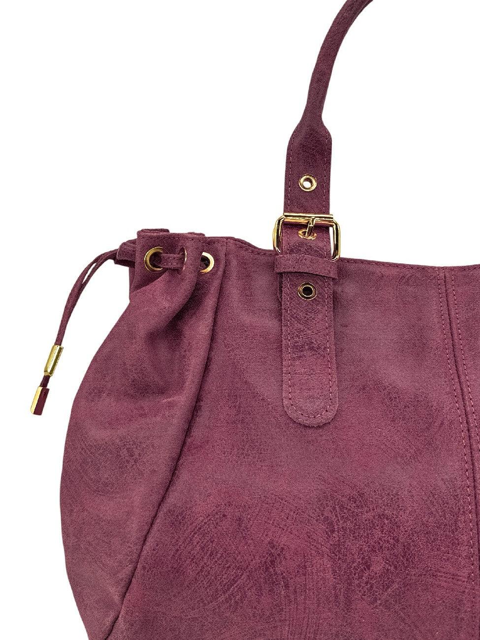 Sac bowling en cuir prune à motif gratté, porté épaule, fabriqué en Italie.