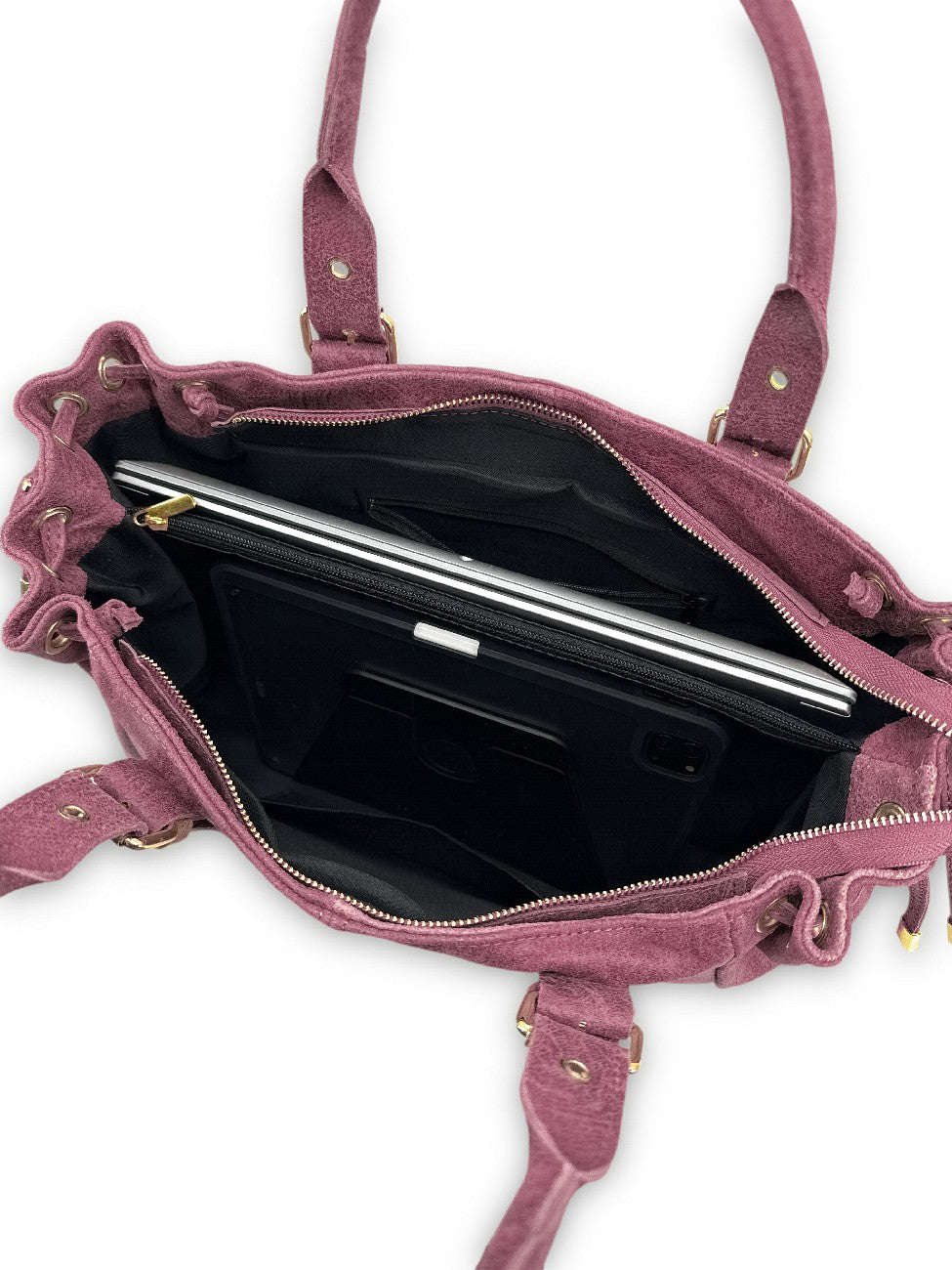 Cuir brossé mat et ferrures dorées habillent ce grand format à la ligne très actuelle capable d'accueillir un ordinateur 14 pouces. Son compartiment principal est divisé par une poche zippée centrale et offre des perspectives de rangement inestimables. Toutefois, si des pochettes A4 peu épaisses trouveront leur place de part et d'autres, ce sera plus compliqué pour des classeurs plus volumineux. Comme tous les cuirs brossés, on ne recommande pas de charger le sac à main plus que son volume ne l'offre : la pression sur le cuir brossé risquerait de fragiliser celui-ci.