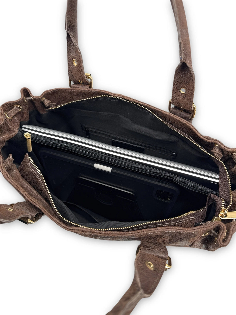 Cuir brossé mat et ferrures dorées habillent ce grand format à la ligne très actuelle capable d'accueillir un ordinateur 14 pouces. Son compartiment principal est divisé par une poche zippée centrale et offre des perspectives de rangement inestimables. Toutefois, si des pochettes A4 peu épaisses trouveront leur place de part et d'autres, ce sera plus compliqué pour des classeurs plus volumineux. Comme tous les cuirs brossés, on ne recommande pas de charger le sac à main plus que son volume ne l'offre : la pression sur le cuir à motif risquerait de fragiliser celui-ci.