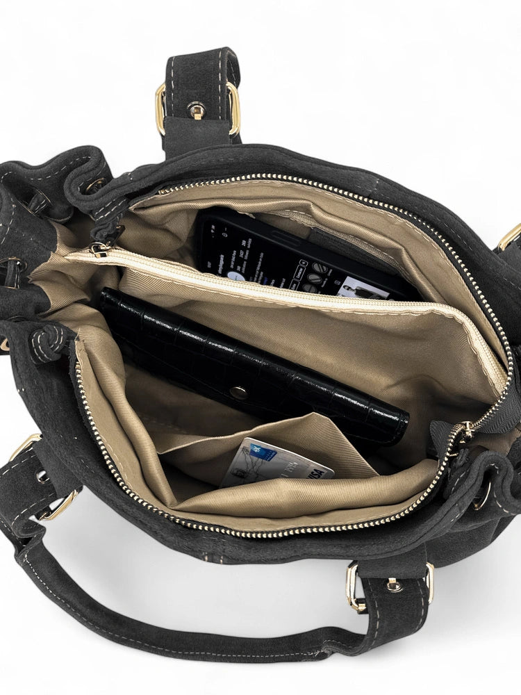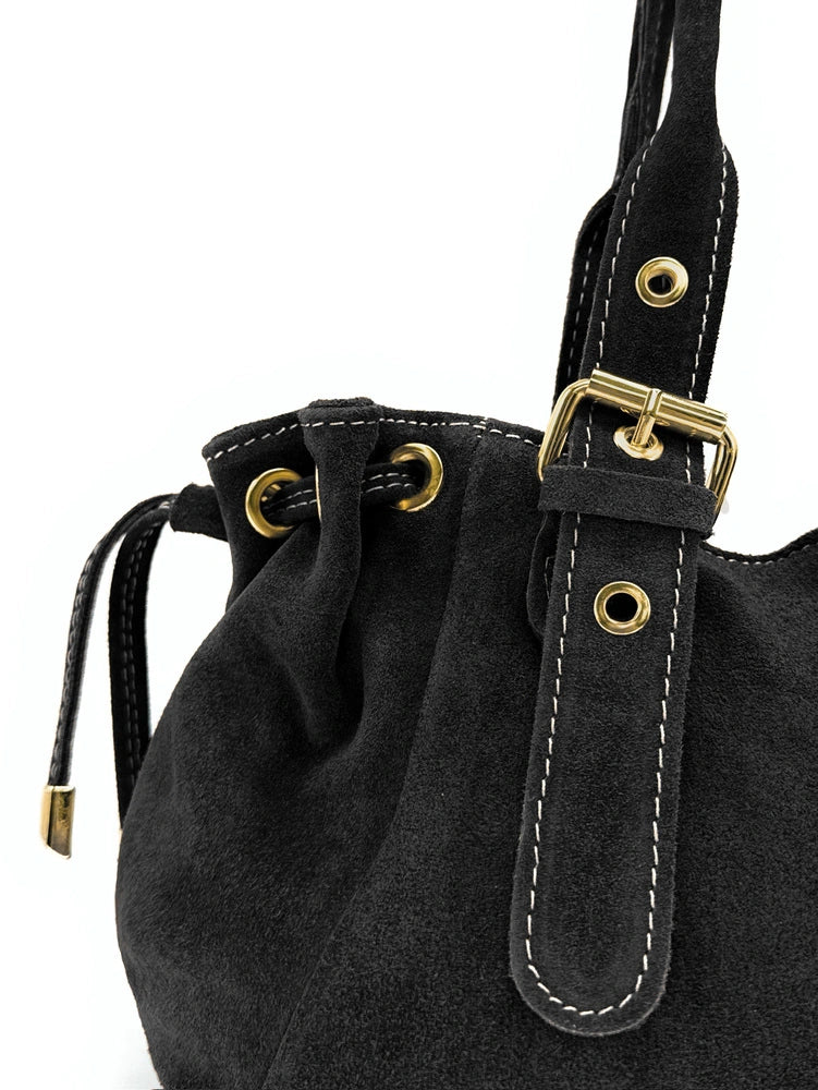 Sac bowling en cuir nubuck noir, porté épaule, fabriqué en Italie.