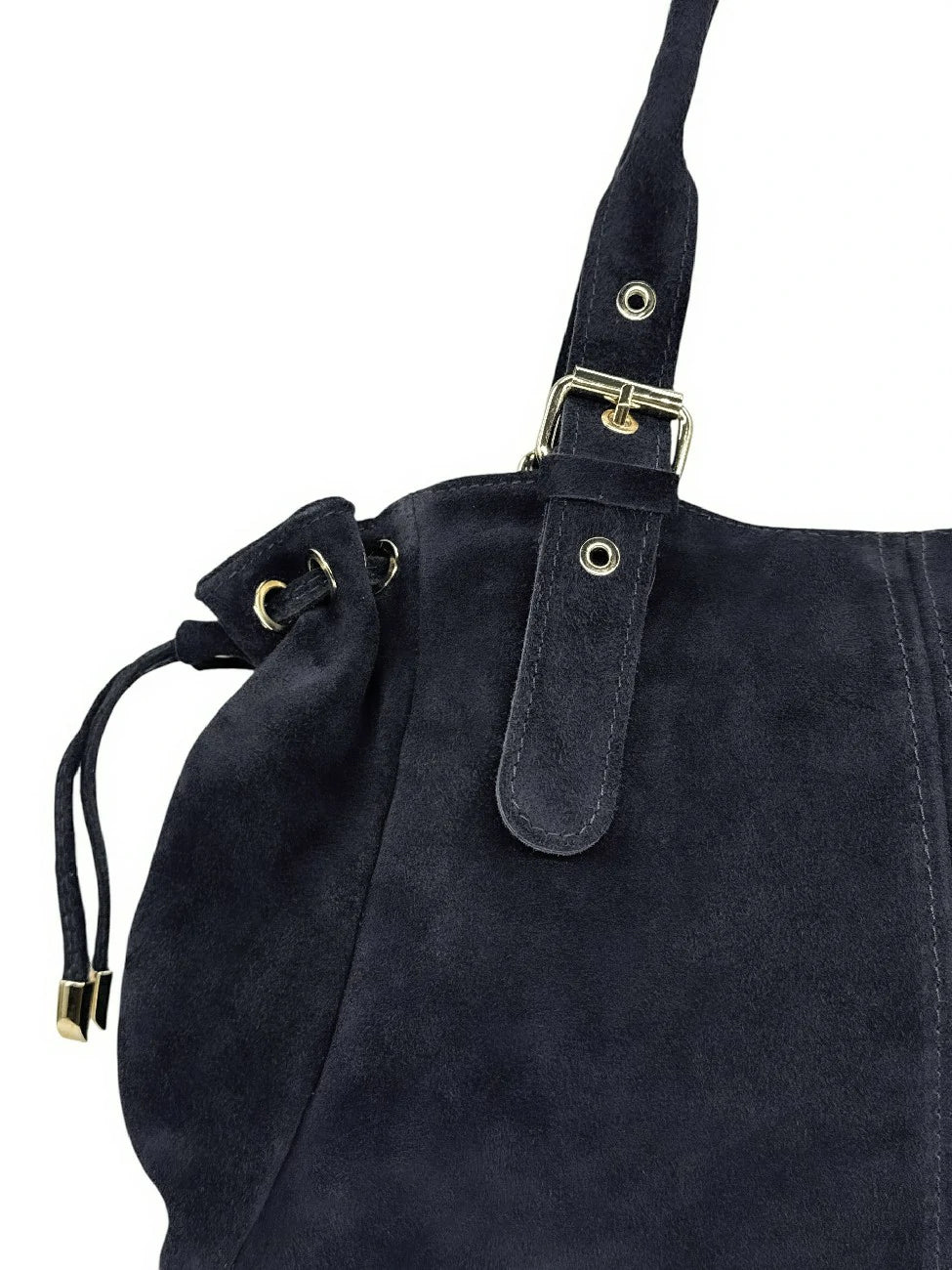 Sac bowling en cuir nubuck bleu marine porté épaule, fabriqué en Italie.