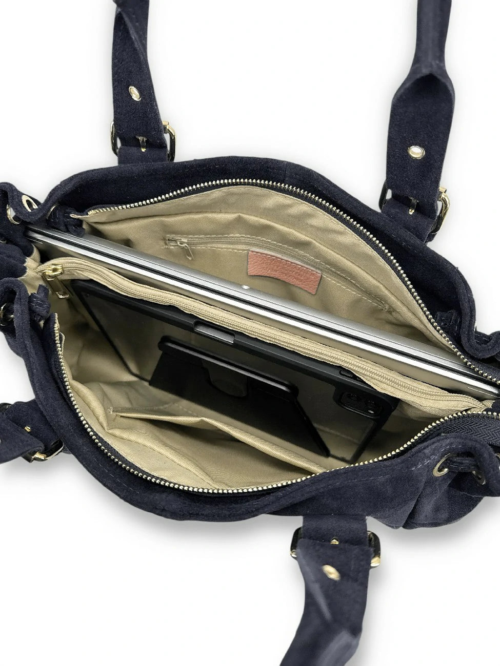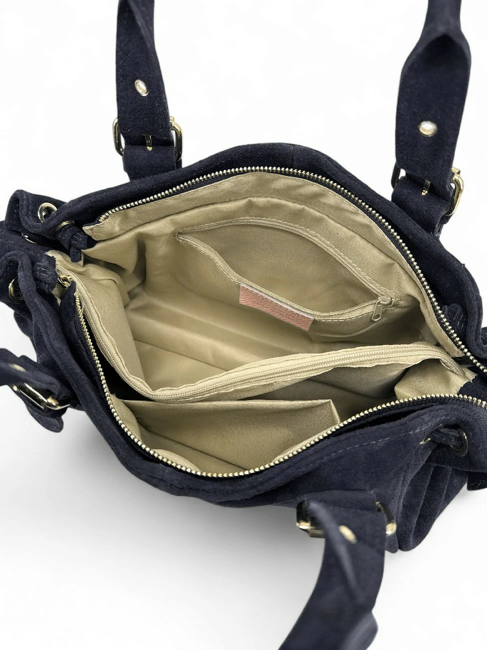 ATTENTION : ce sac à main est en nubuck, une matière délicate qui ne saurait supporter des charges lourdes, ou une manipulation inappropriée telle que le tirer par une anse pour en sortir des accessoires alors qu'il est chargé : cela crée des tensions sur les anses et le cuir finit par céder . Dans le cas d'une utilisation étudiante, nous vous conseillons vivement d'opter pour sa version en cuir grainé, bien plus résistante, et nécessitant un entretien minimum.