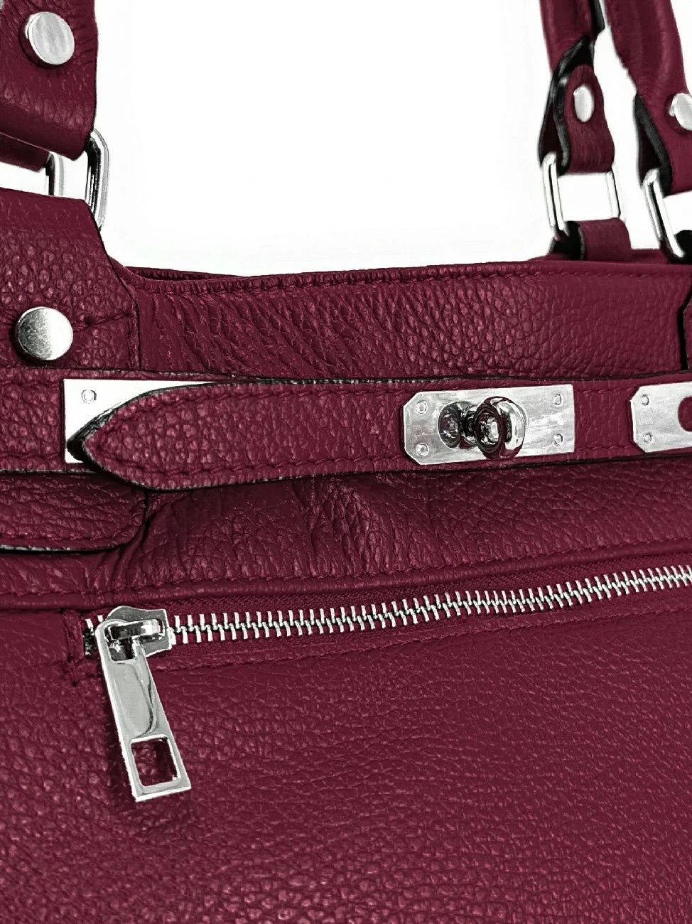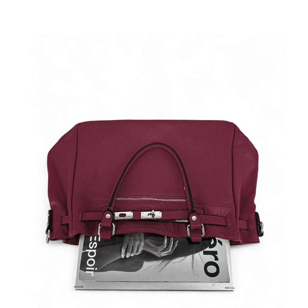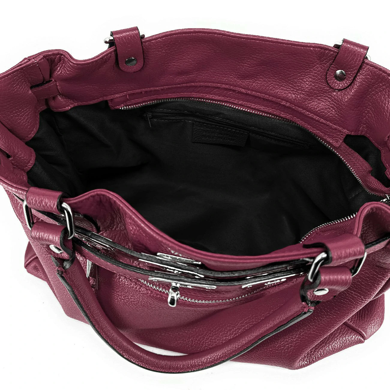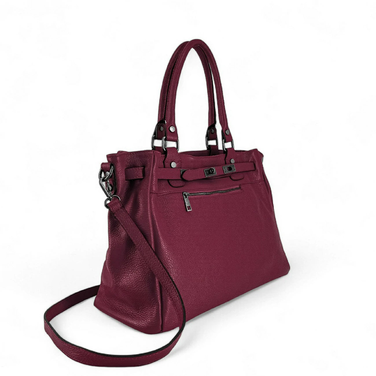 Sac cabas en cuir grainé prune et détails argentés, porté main, épaule ou bandoulière, fabriqué en Italie.