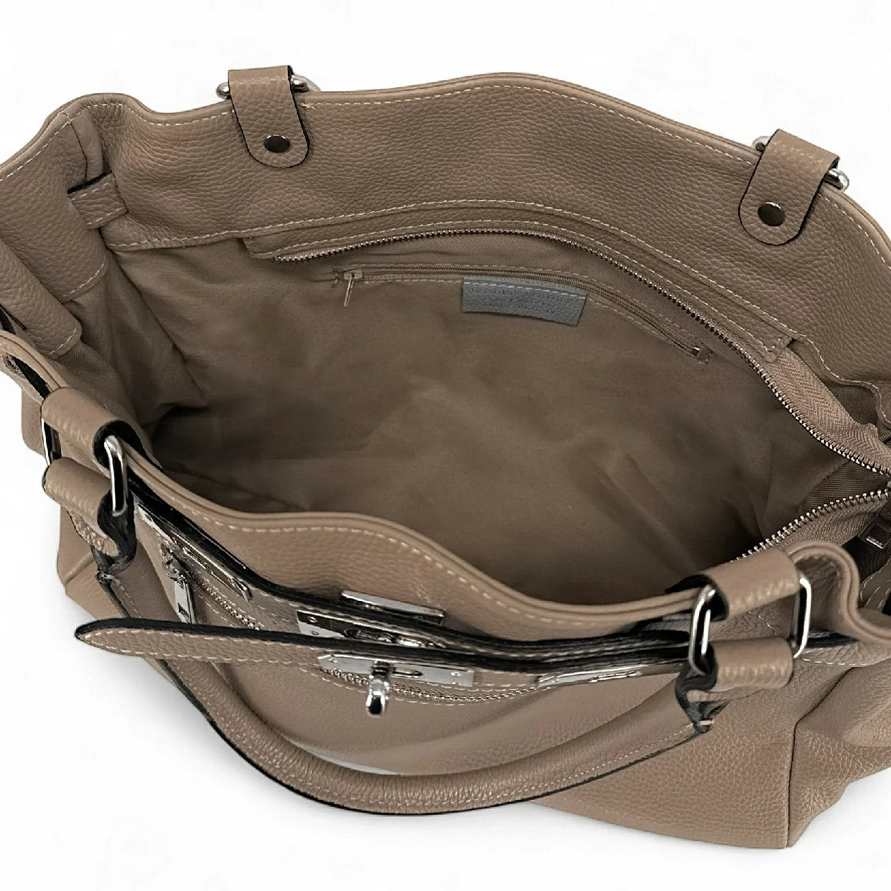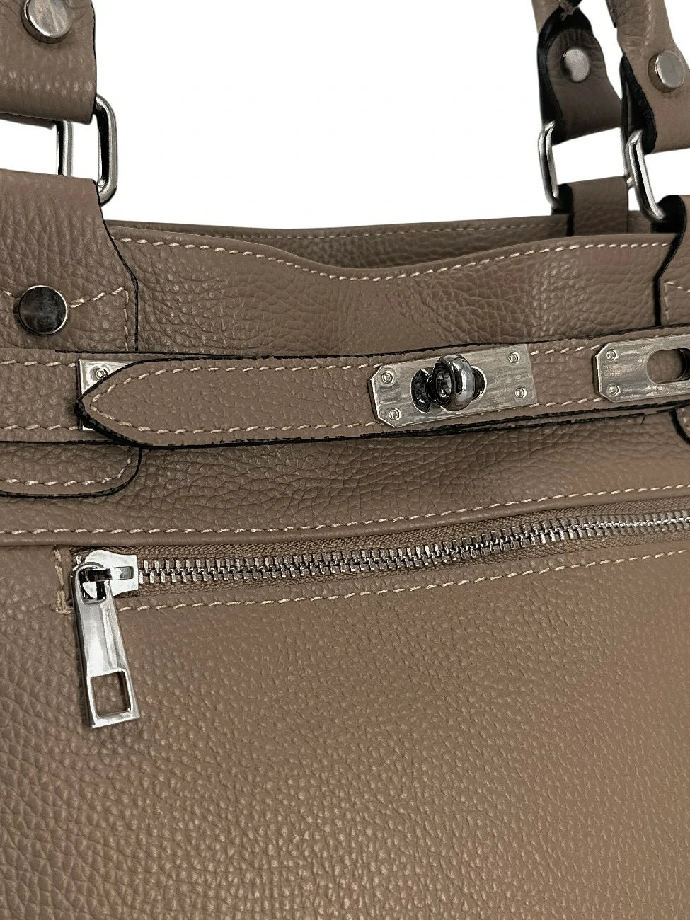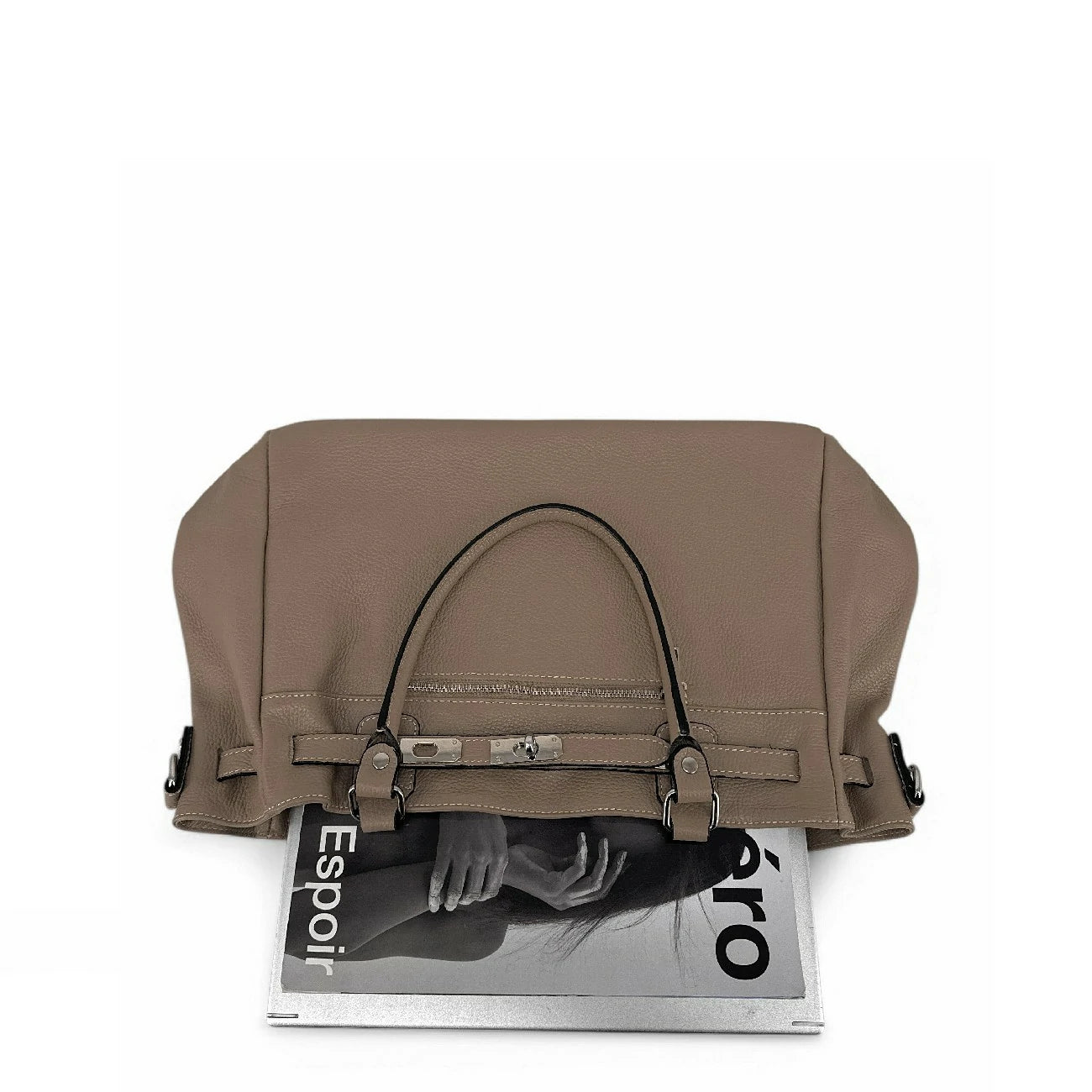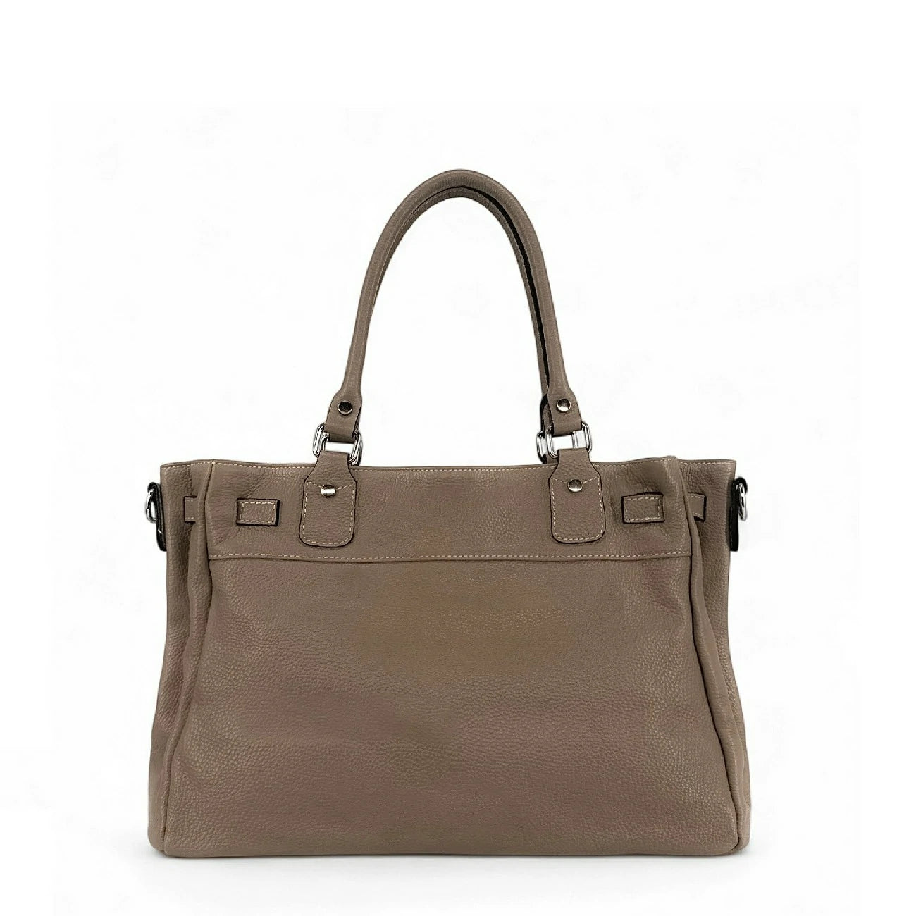 Sac cabas en cuir grainé taupe foncé et détails argentés, porté main, épaule ou bandoulière, fabriqué en Italie.