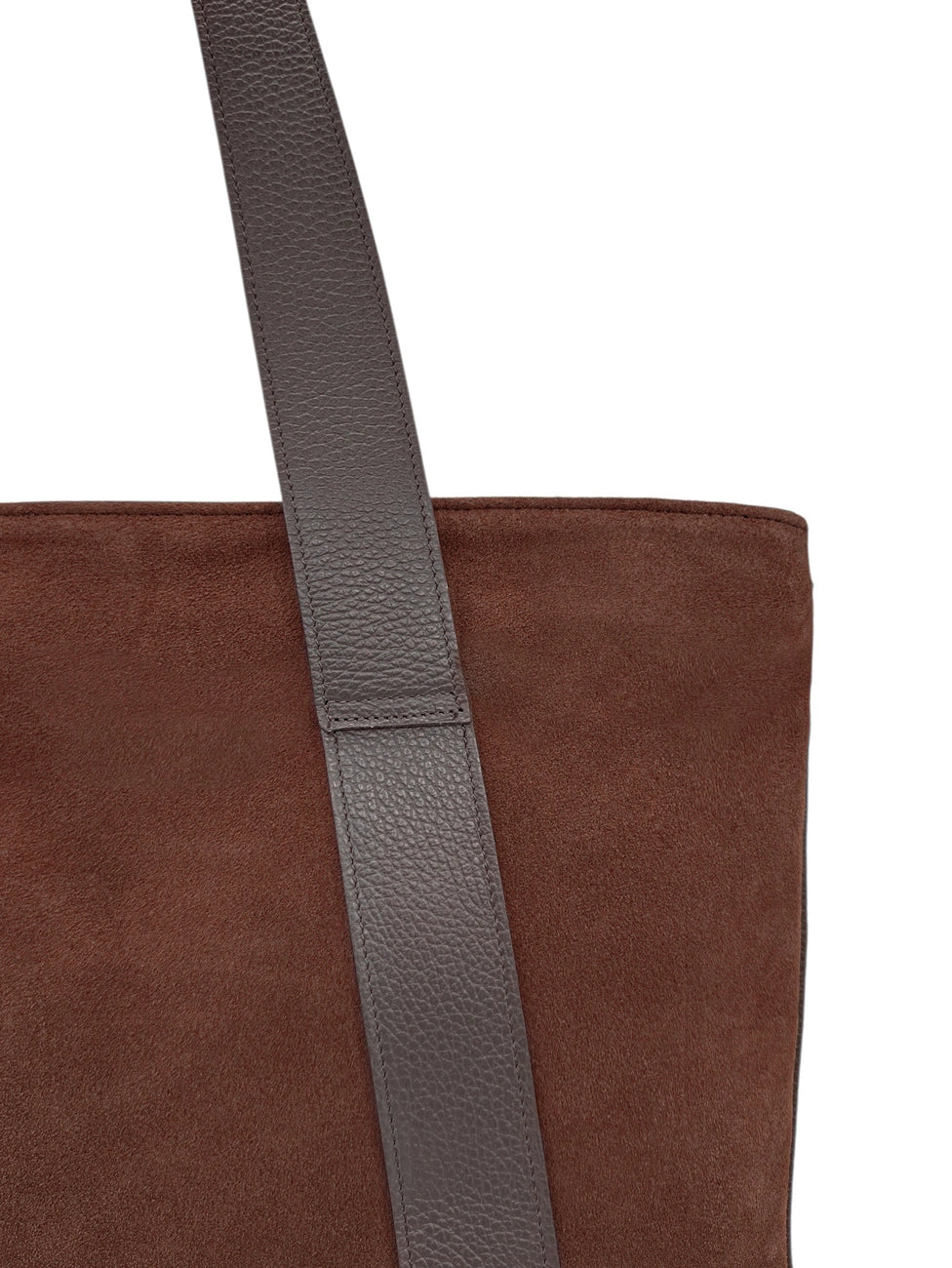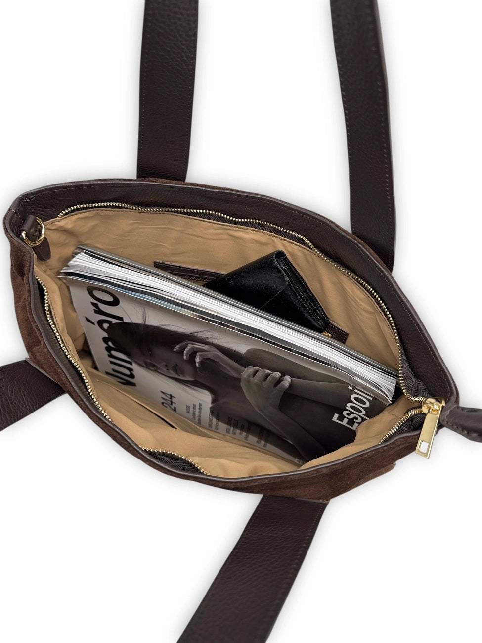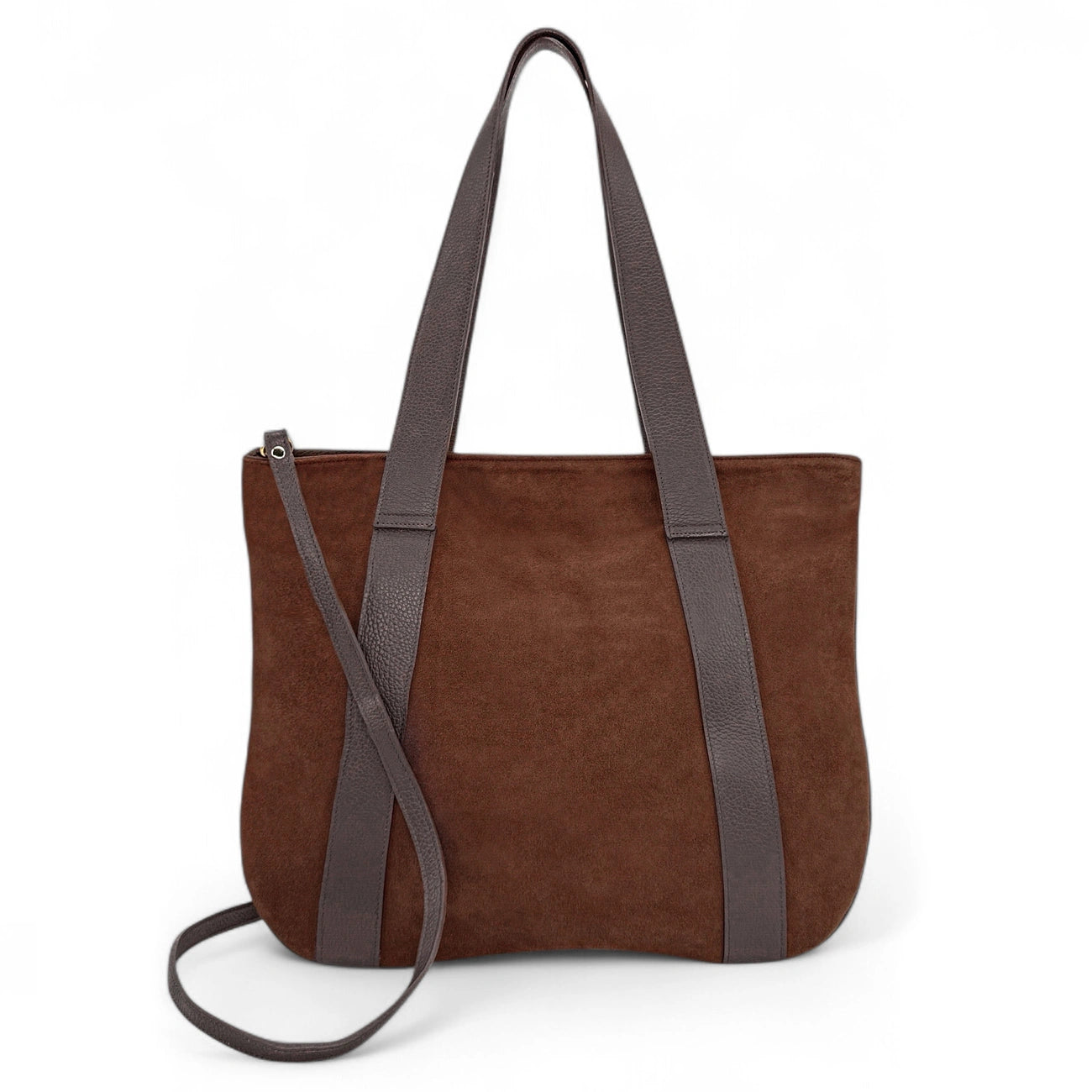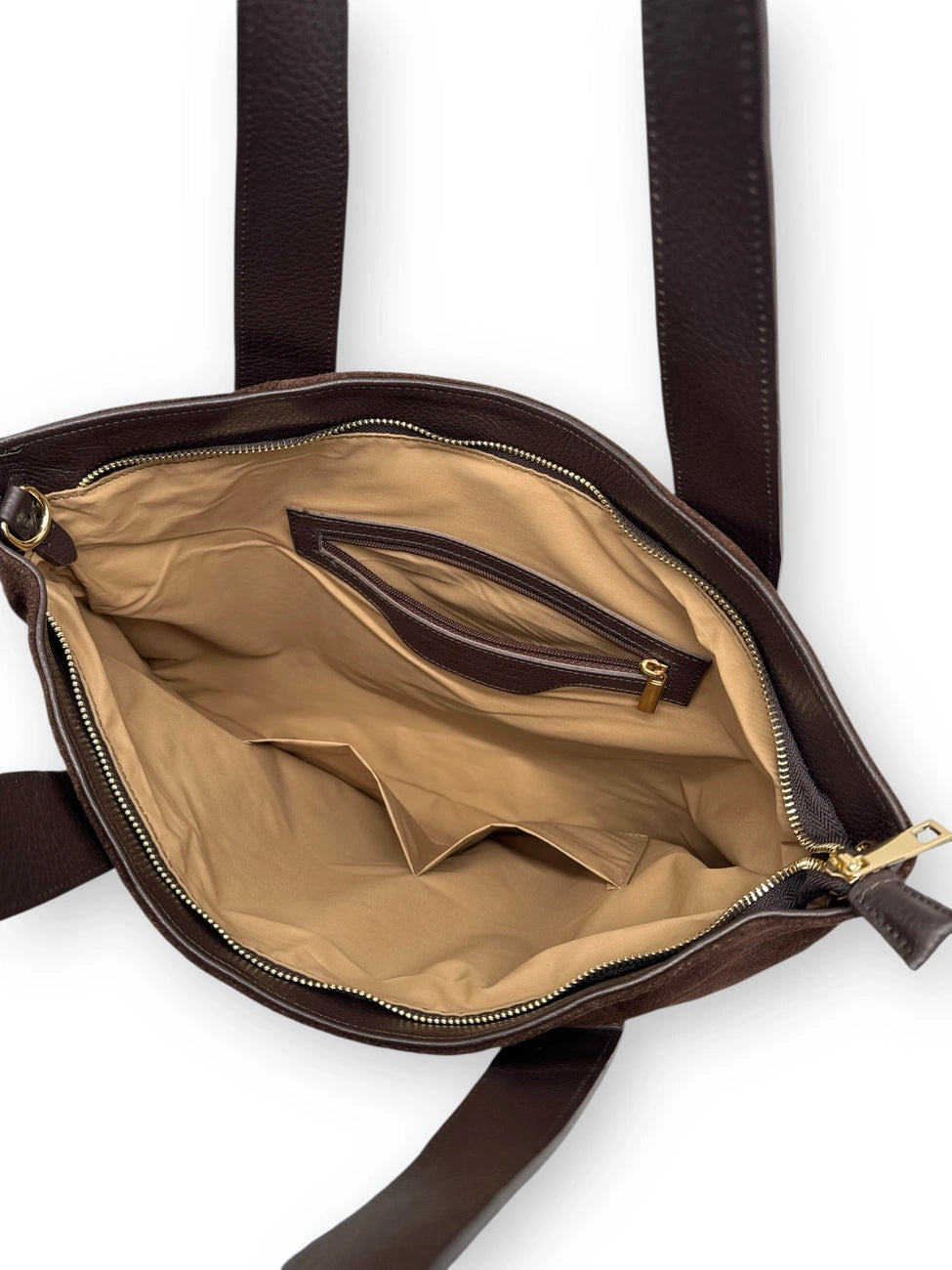 Grand sac cabas type sac ordinateur et porte-documents en cuir nubuck marron chocolat, porté épaule ou main, Fabriqué en Italie.