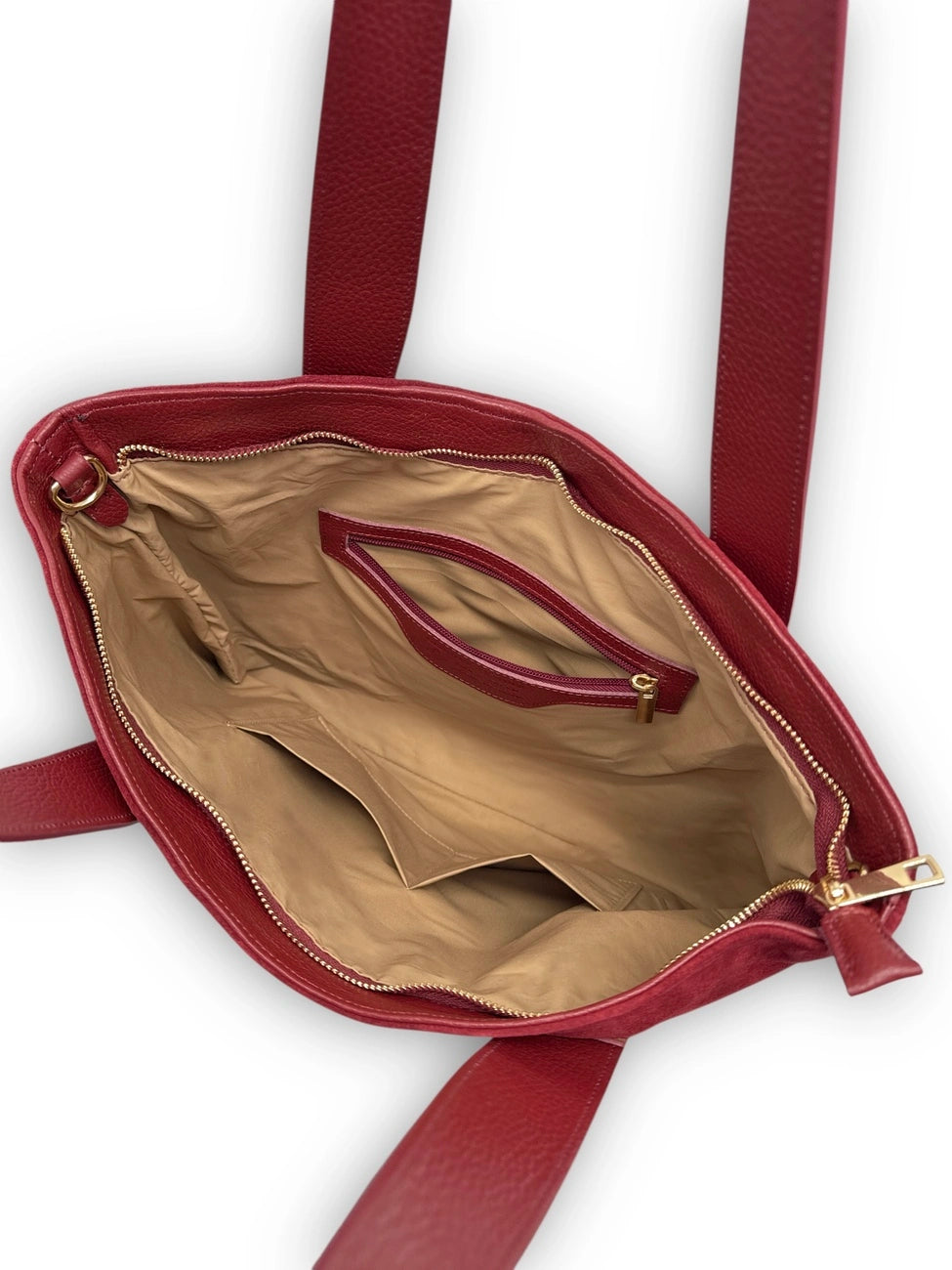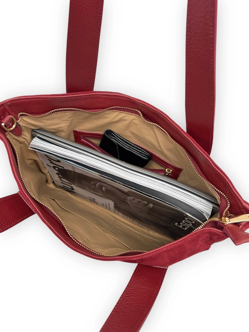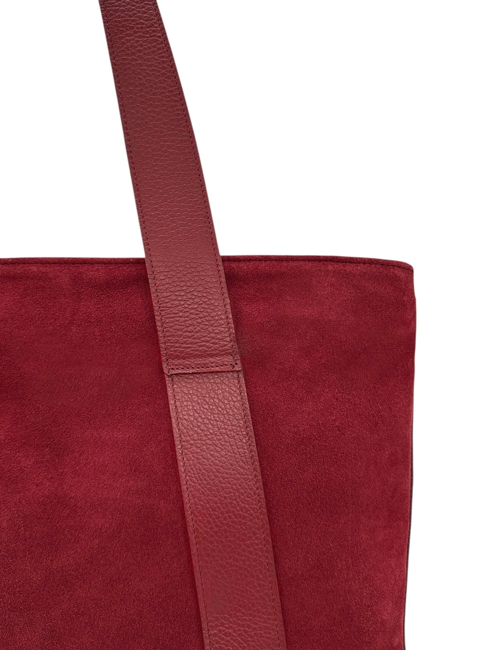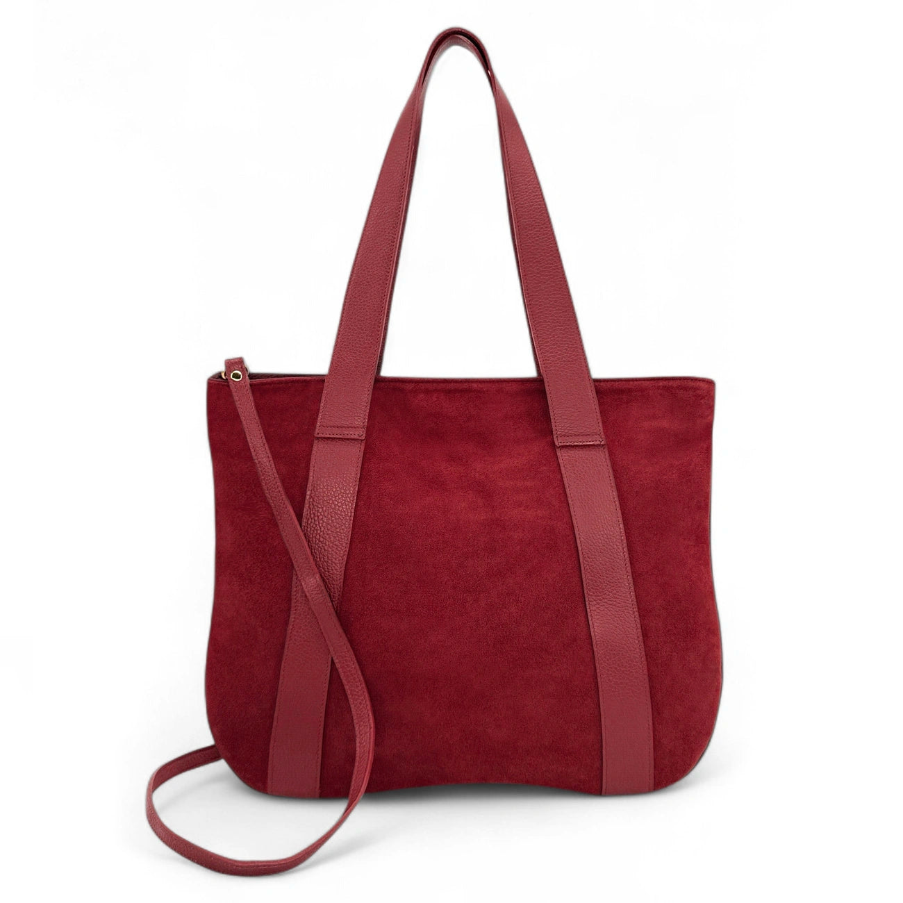 Grand sac cabas en cuir nubuck rouge bordeaux, porté épaule ou main, Fabriqué en Italie.