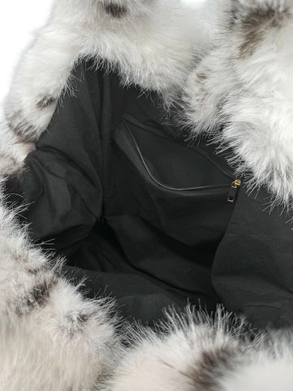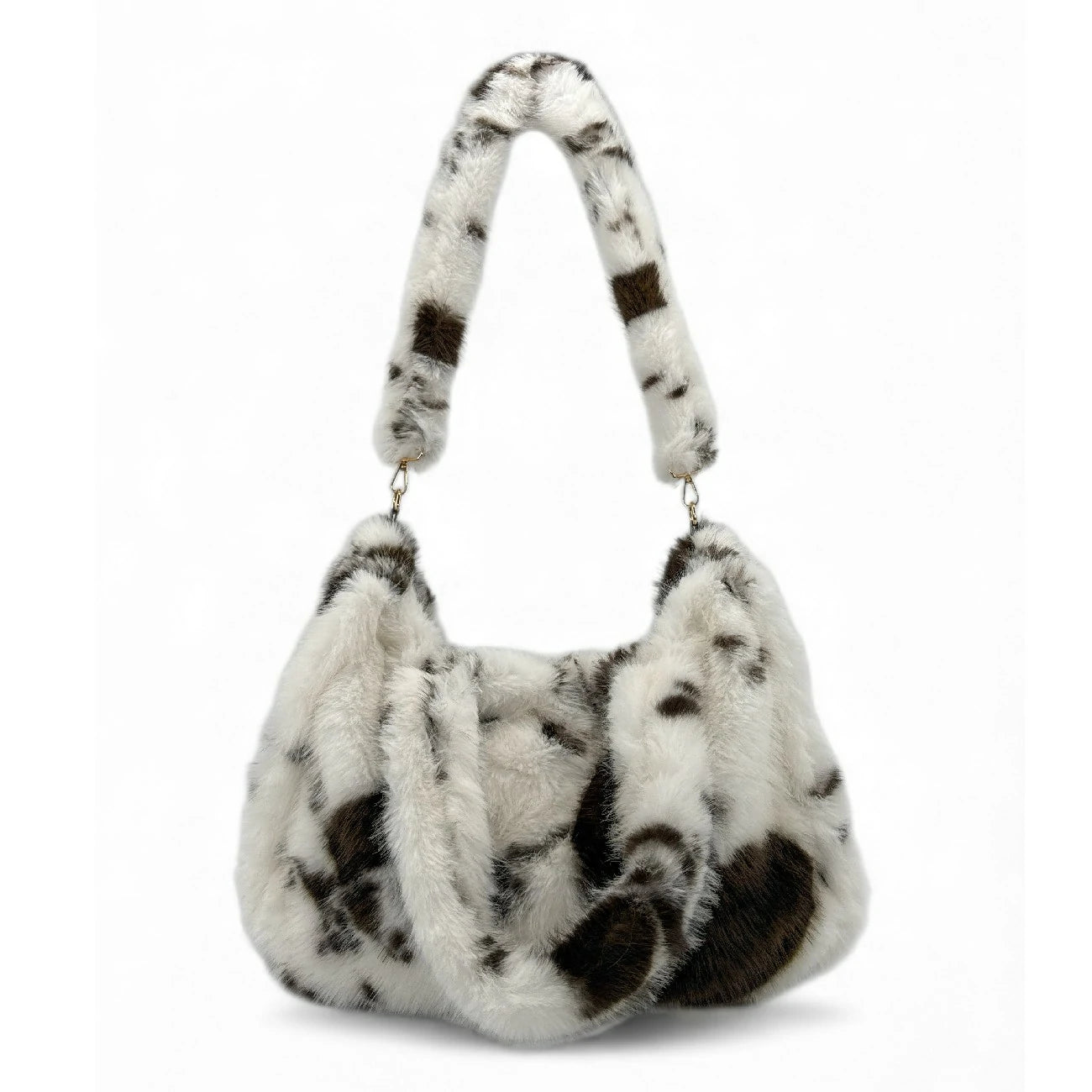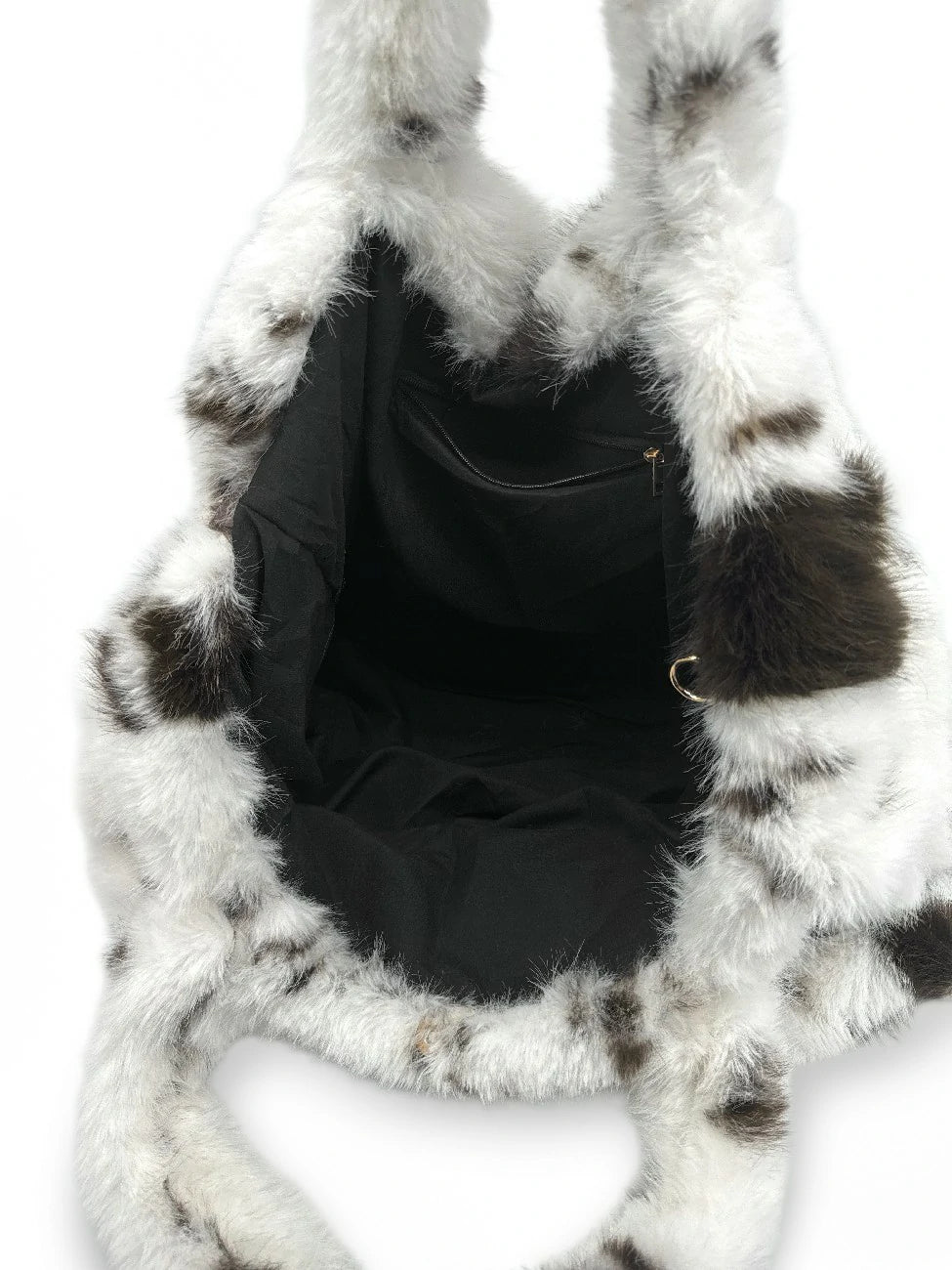 Sac cabas en fausse fourrure façon vache chocolat et crème, porté épaule ou bandoulière.