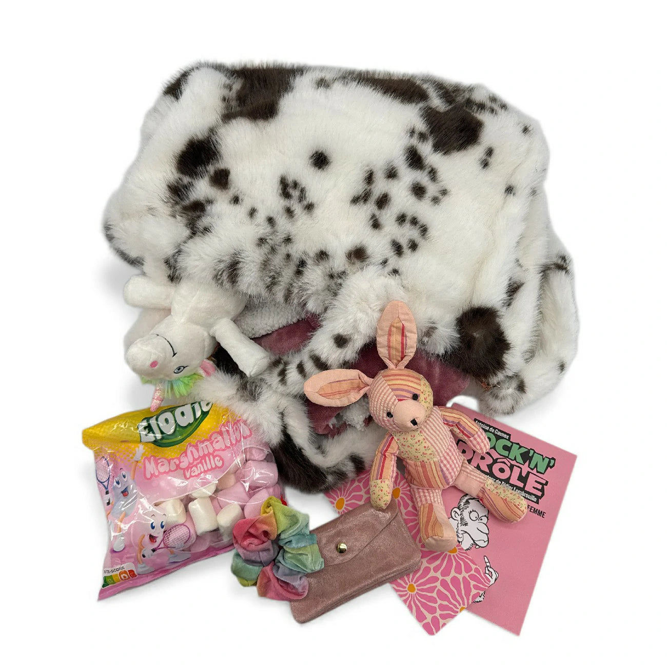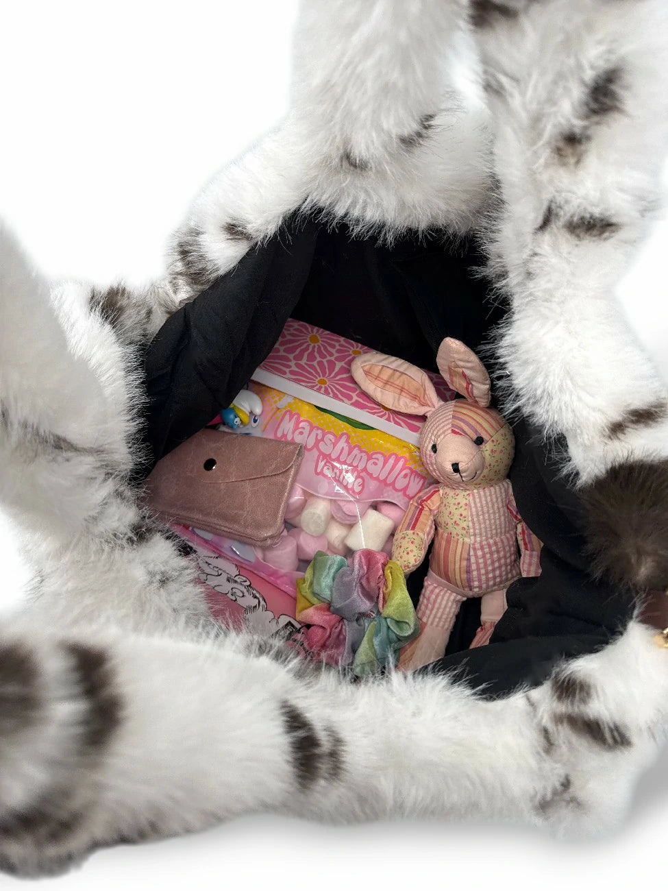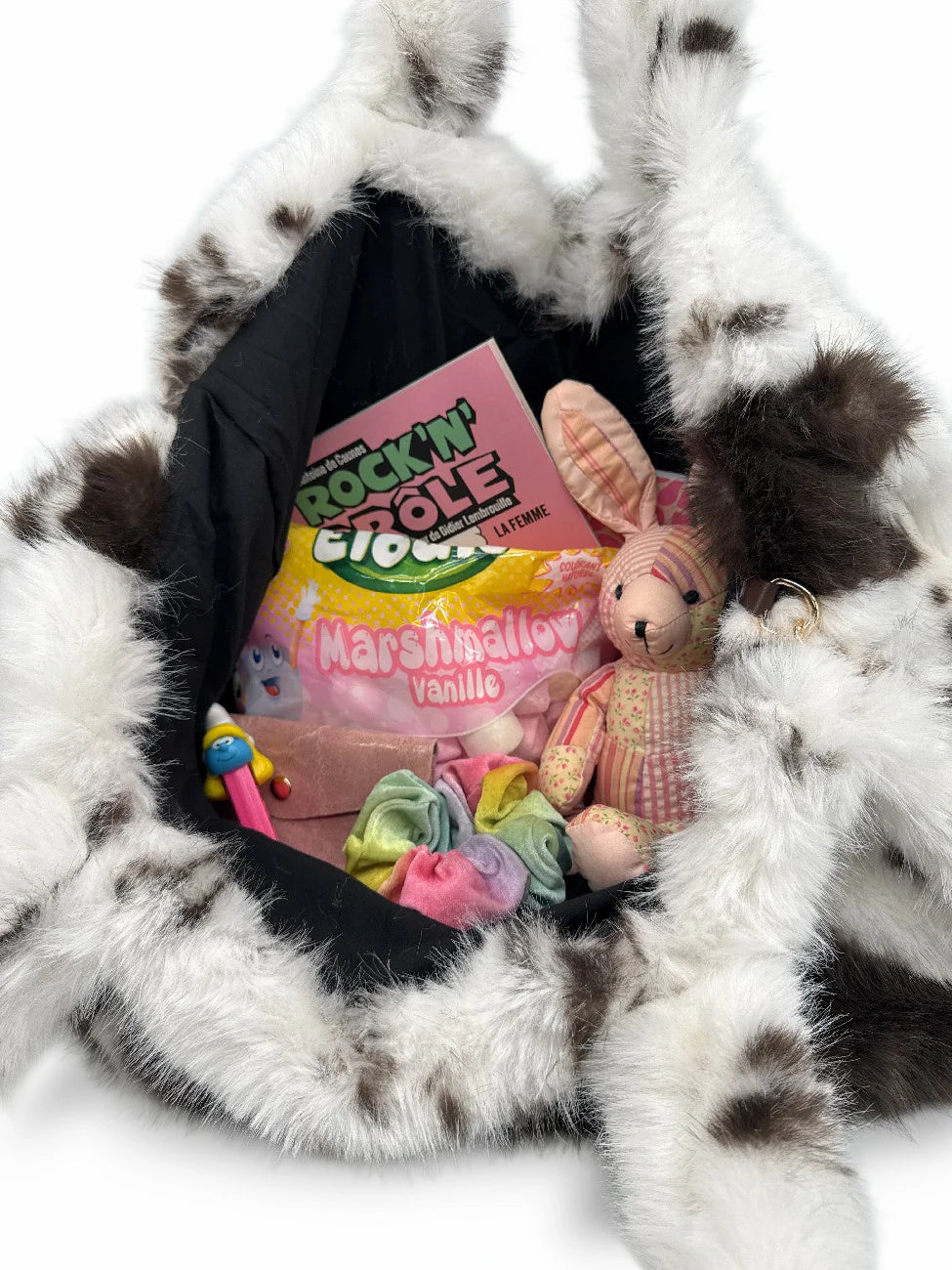 Mêmes si les modèles fluffy ont envahi les collections automne/hiver 2025, celui ci interpelle. Ce sac au volume week-end inspire : Fausse fourrure ultra crémeuse, design façon pillow... Le motif vache marron foncé y ajoute une touche originale ludique ! Ce cabas fourre tout oversized ne se prend pas au sérieux, même s'il est pile poil dans la tendance animalière fluffy de cet hiver ! Le PJ PARTY, tout vegan, est parfait pour un quotidien audacieux et décomplexé, une soirée à thème "pyjama party" ou encore un week end entre copines. On adore !
