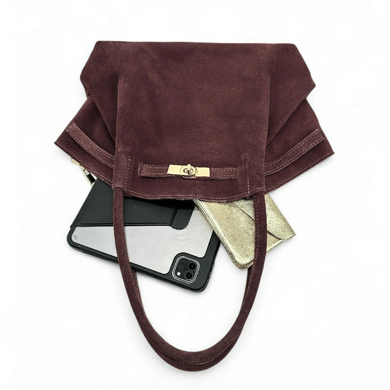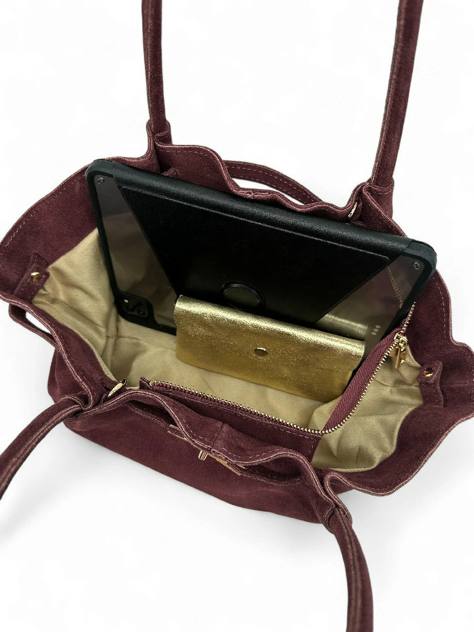 Sous ses plis souples et sa teinte bordeaux profonde, ce cabas en daim séduit par sa fluidité et son allure effortless. Ceinturé d’un twist doré, doté d’un grand compartiment et d’une anse double en rouleau, il conjugue beauté et praticité. Un must-have de la maroquinerie artisanale à glisser dans toutes les envies chic…