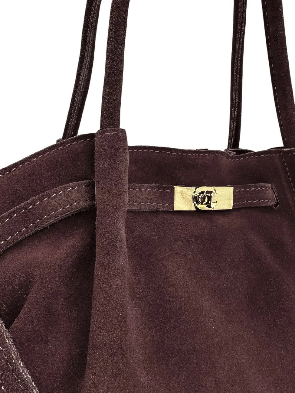 Sac cabas allongé de type slouchy en cuir nubuck, porté épaule ou bandoulière, fabriqué en Italie.