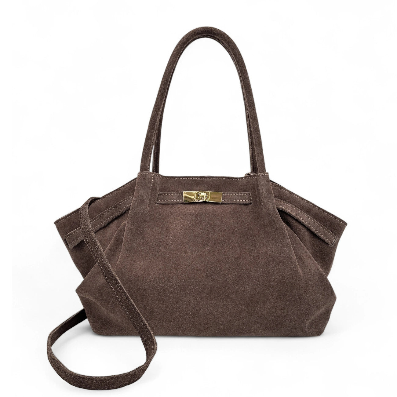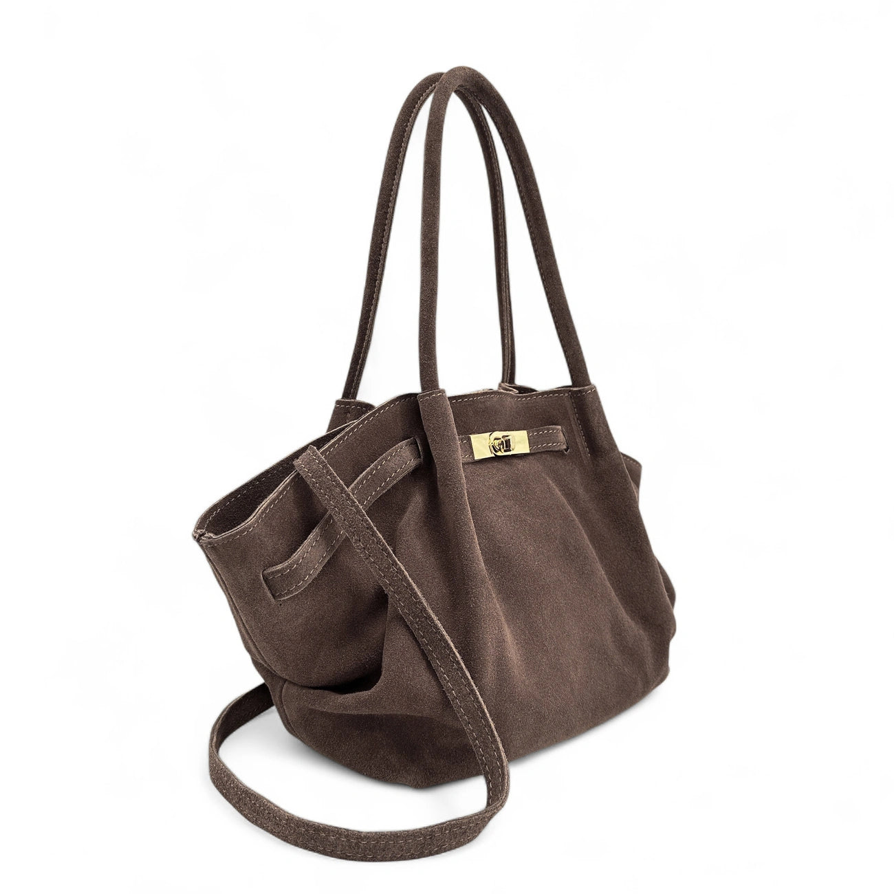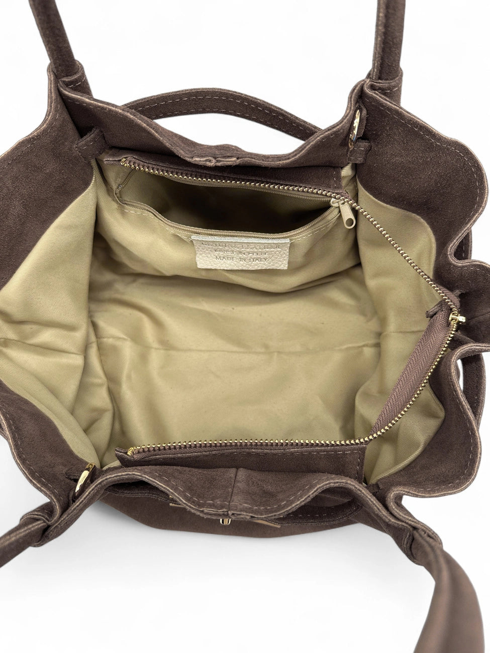 Sac cabas allongé de type slouchy en cuir nubuck, porté épaule ou bandoulière, fabriqué en Italie.