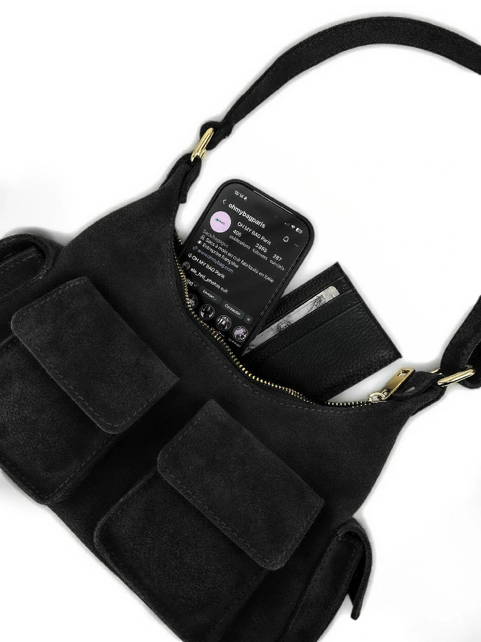 Sac cargo multipoches en nubuck noir, porté bandoulière, fabriqué en Italie.