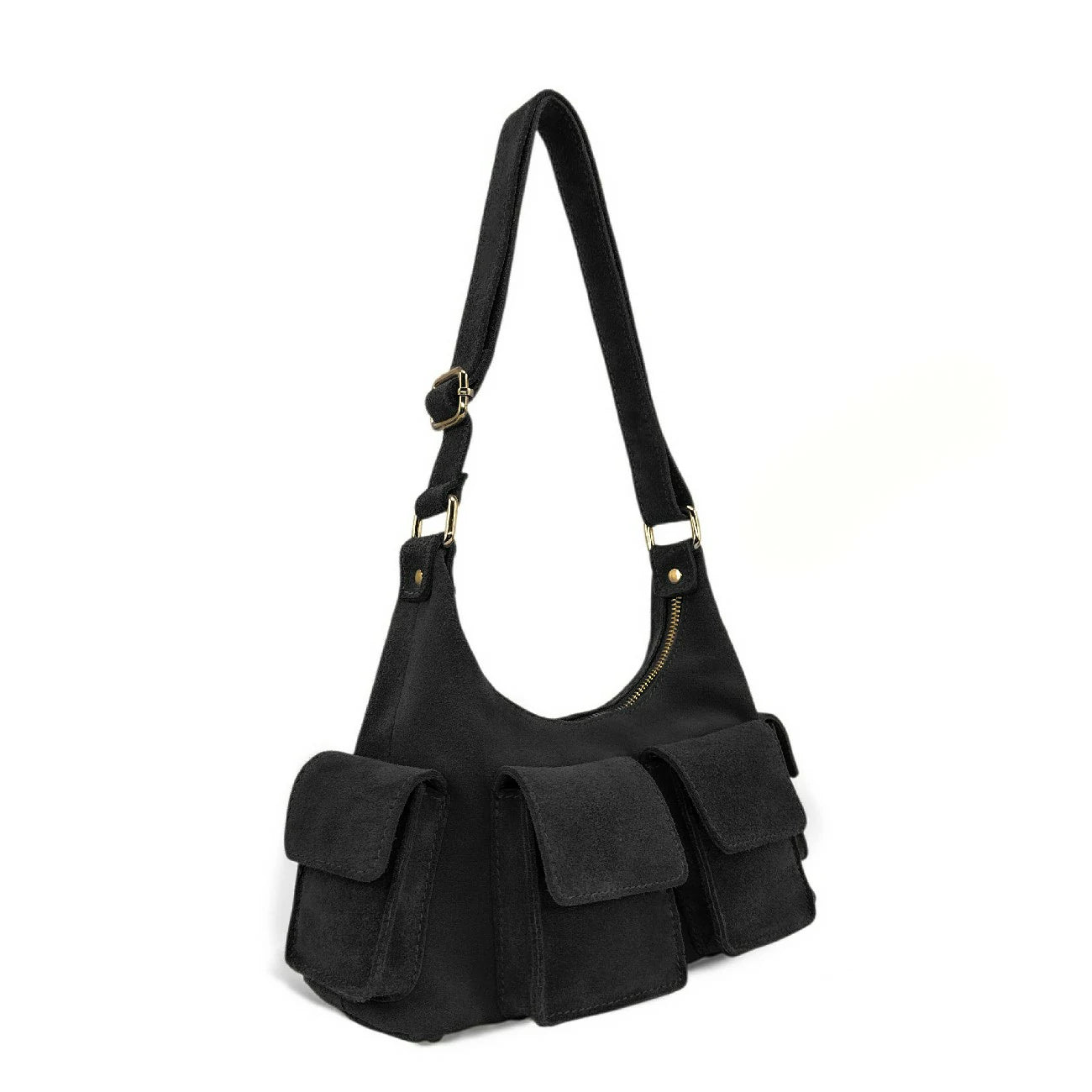 Ce sac à main cargo en cuir nubuck noir est à la fois étoffé niveau style que côté pratique, totalement prêt à booster votre allure au quotidien . Bandoulière réglable montée sur anneaux dorés, porté épaule ou crossbody. Compartiment principal avec deux poches plaquées et quatre poches externes à rabat pour un rangement optimal. Fermeture éclair pour sécuriser vos essentiels. Un sac élégant, polyvalent et fonctionnel, parfait pour vos journées actives.