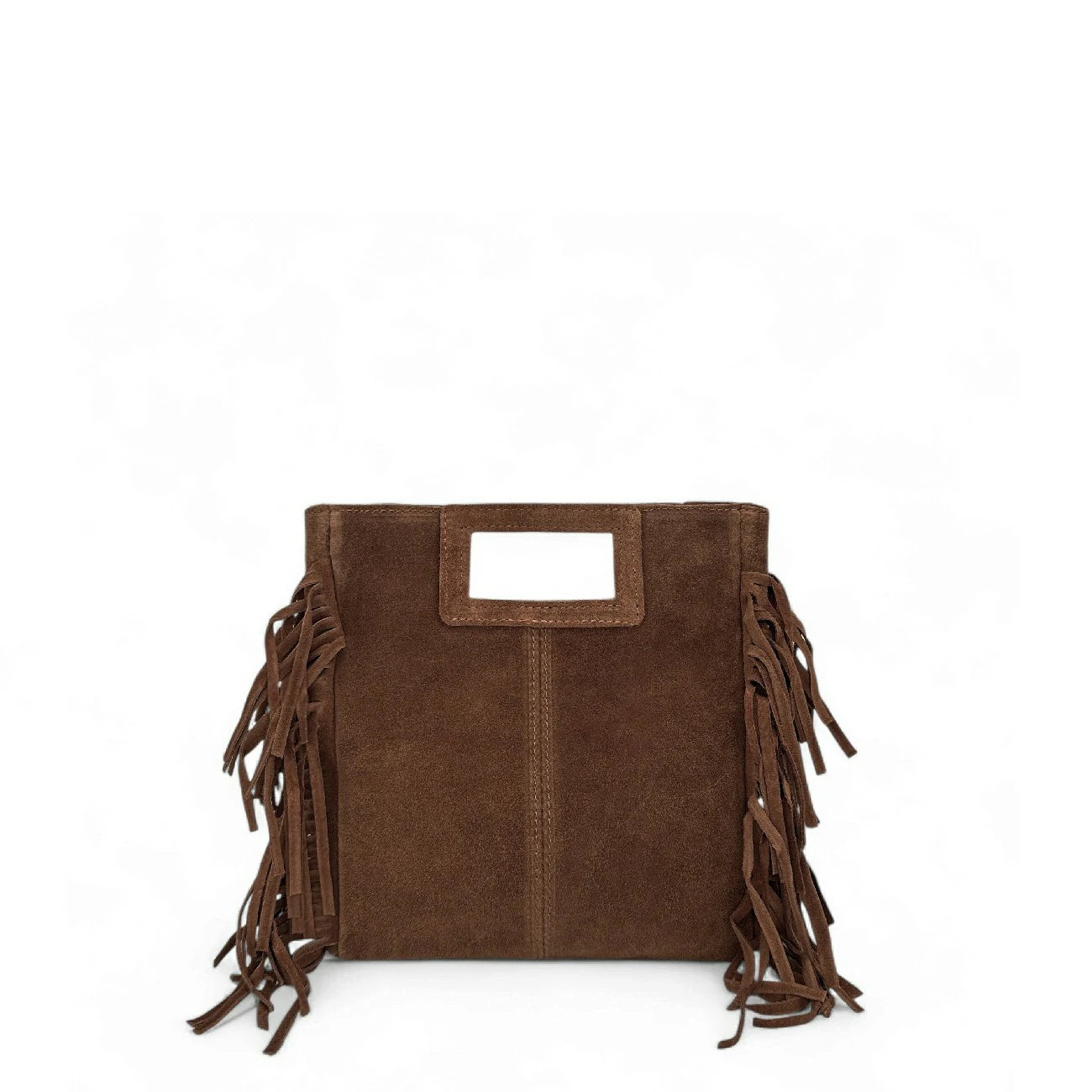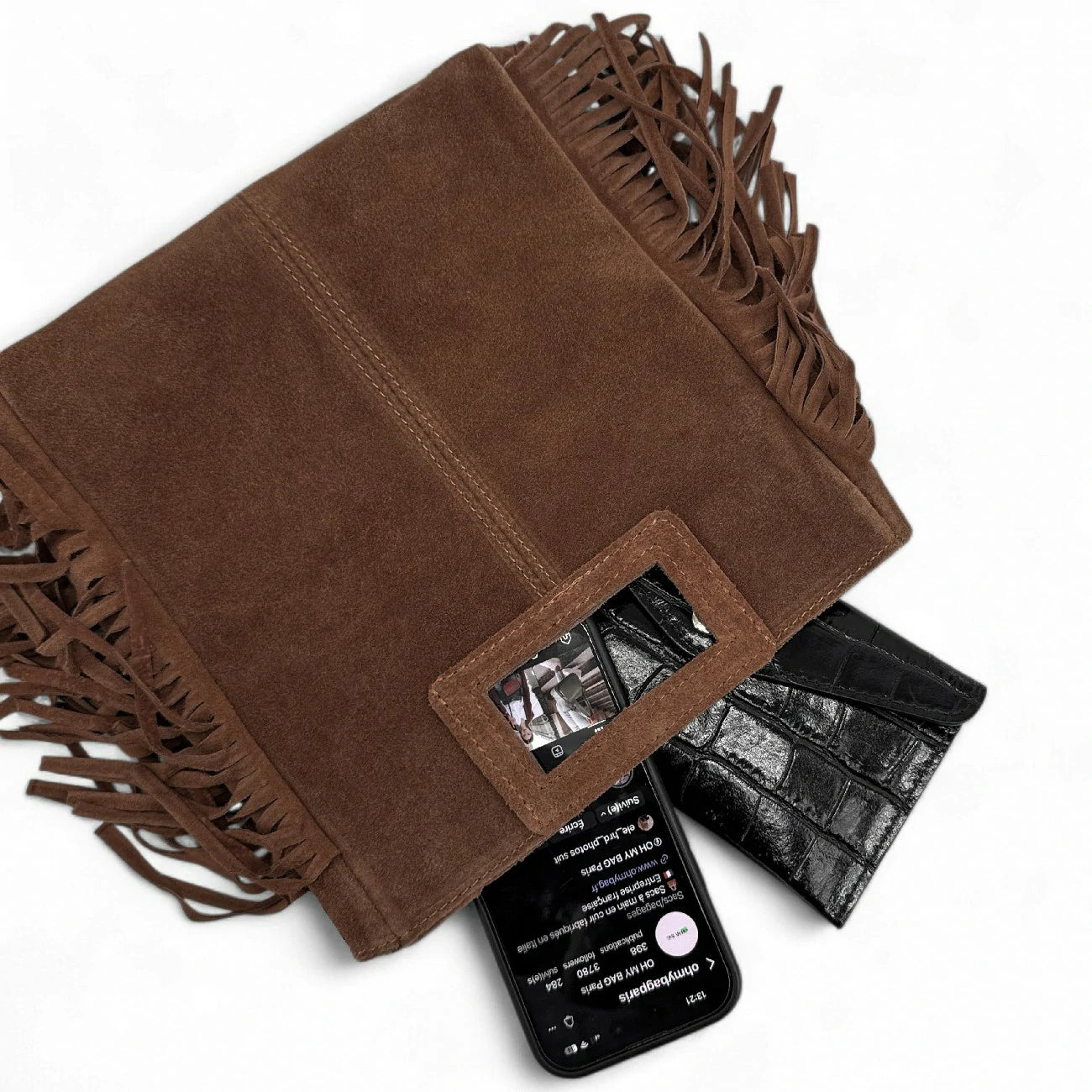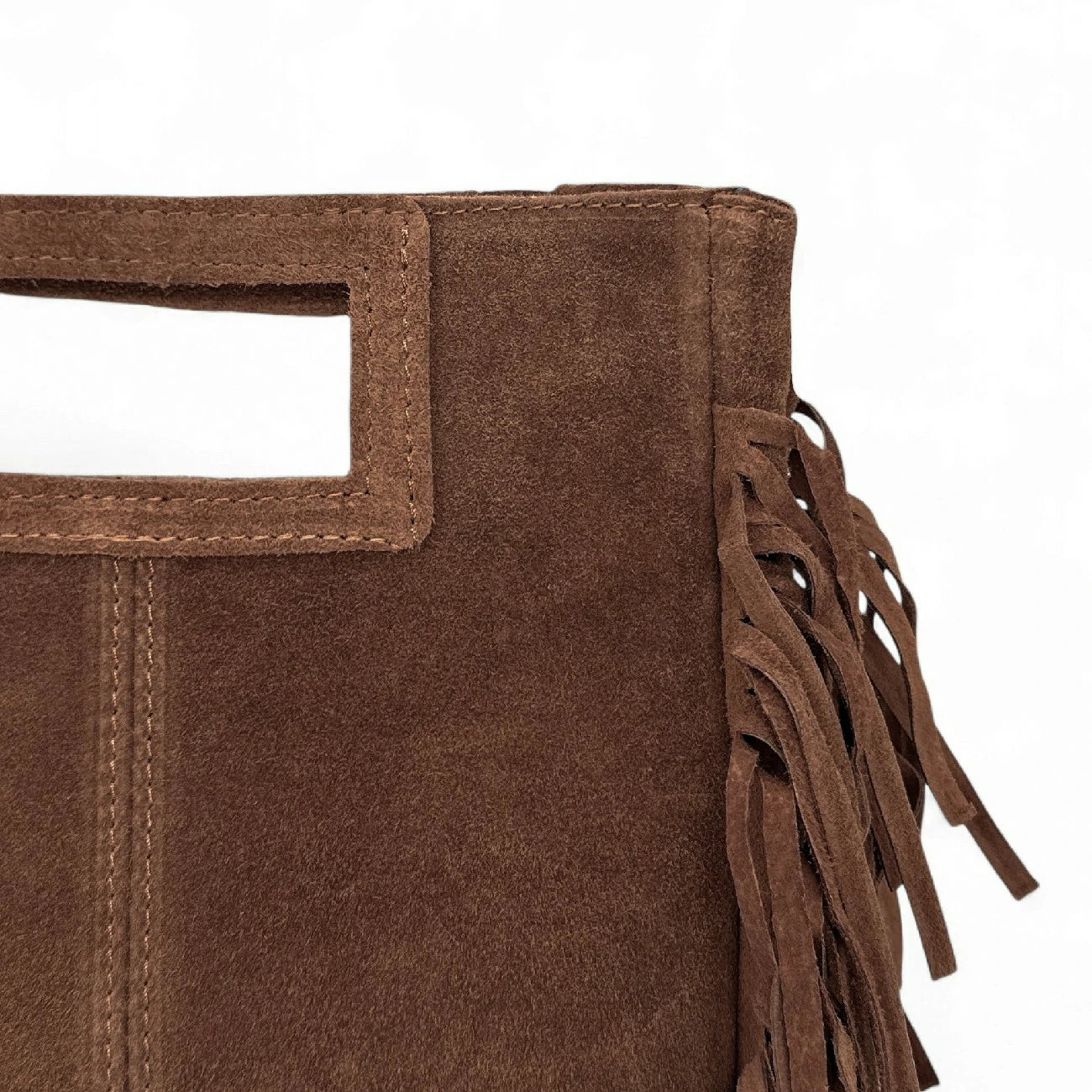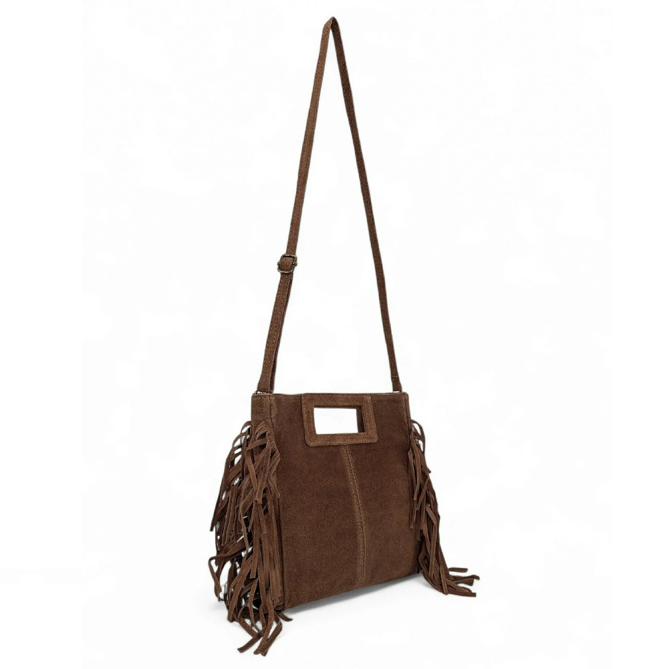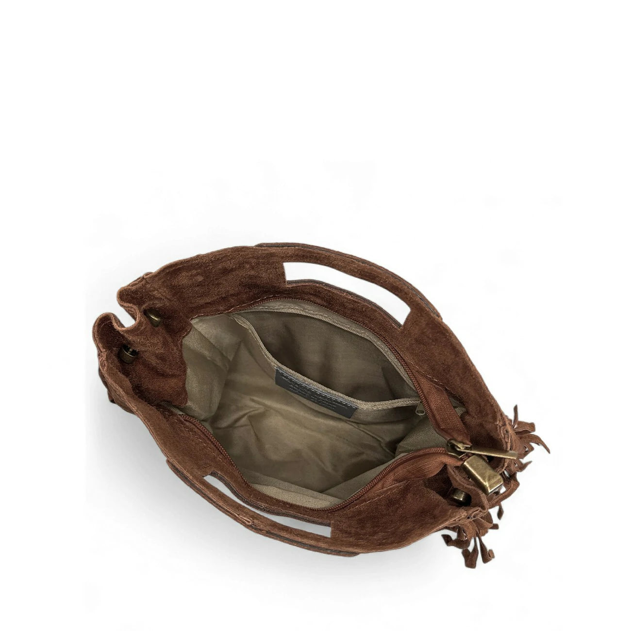 Sac à main à franges en cuir nubuck cannelle porté main ou bandoulière, fabriqué en Italie.