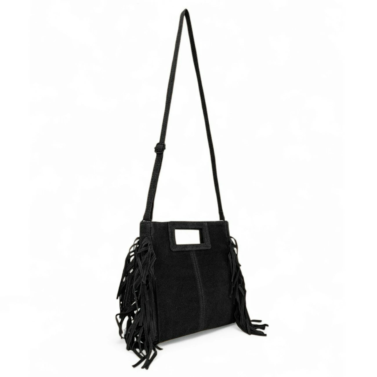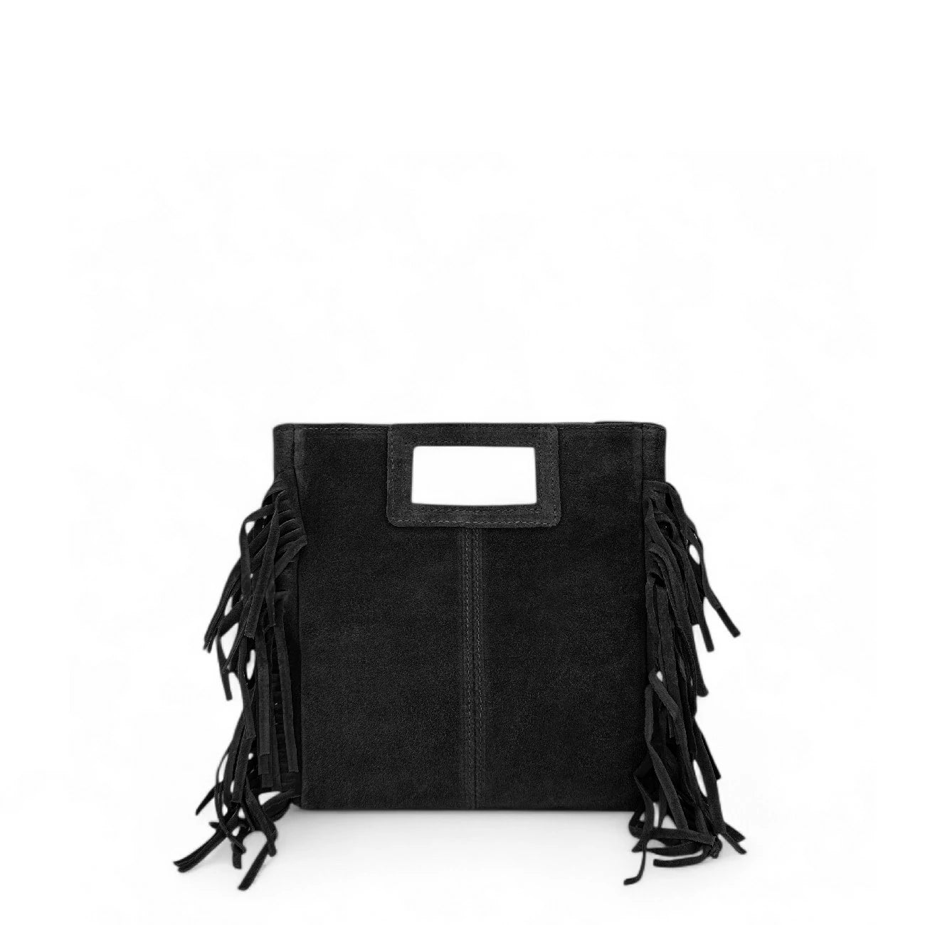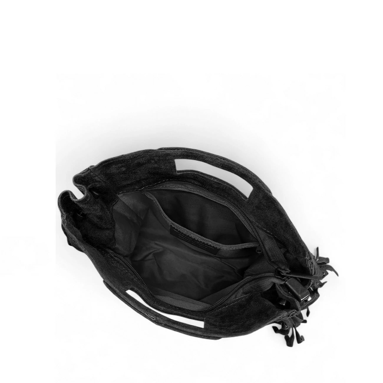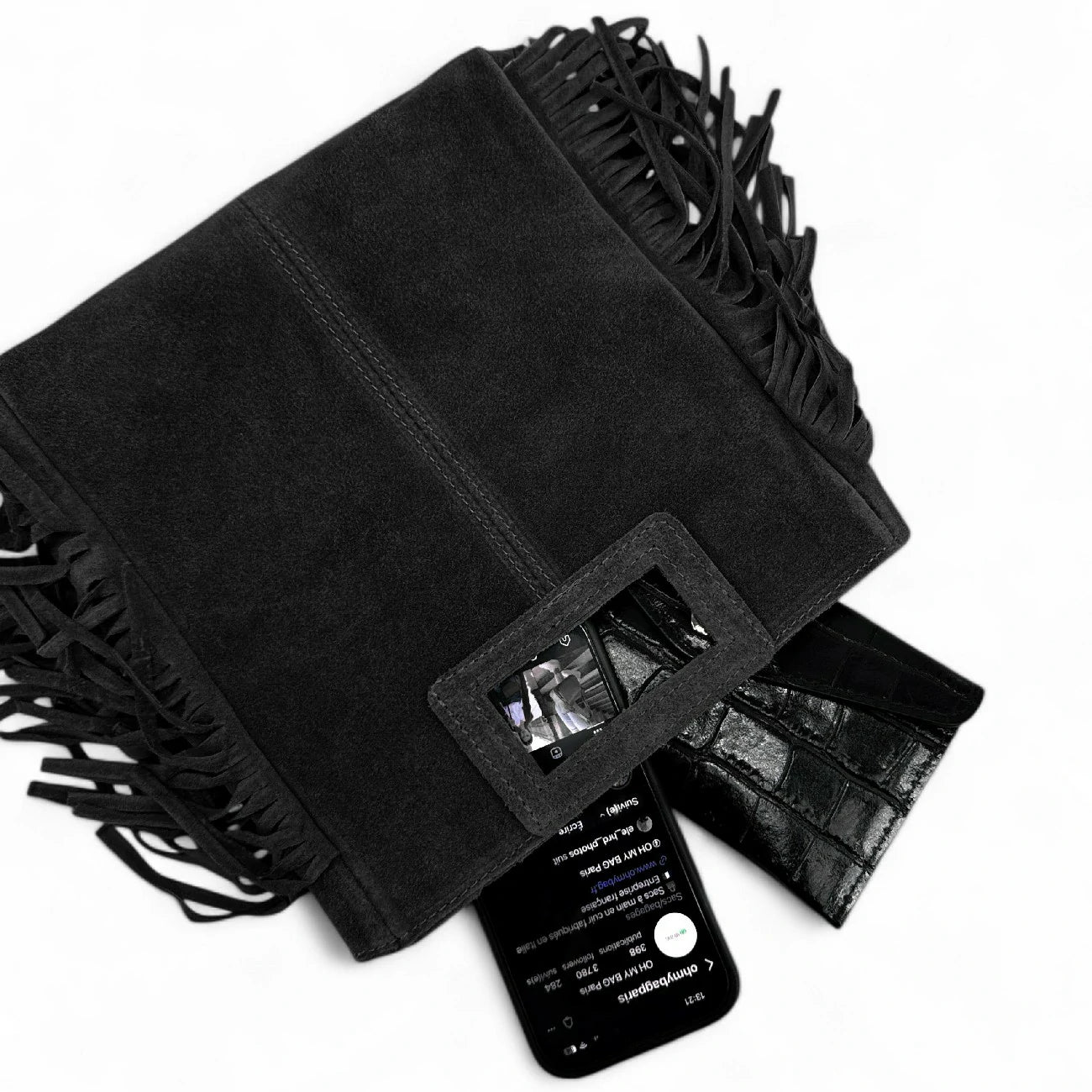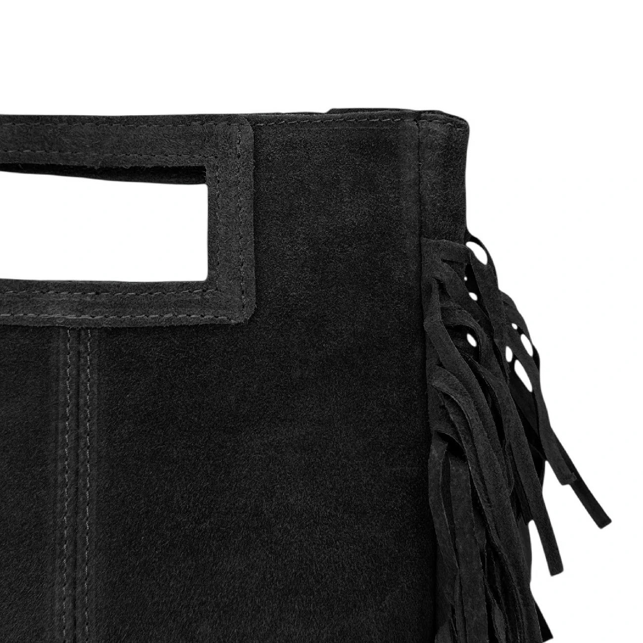 Sac à main à franges en cuir nubuck noir porté main ou bandoulière, fabriqué en Italie.