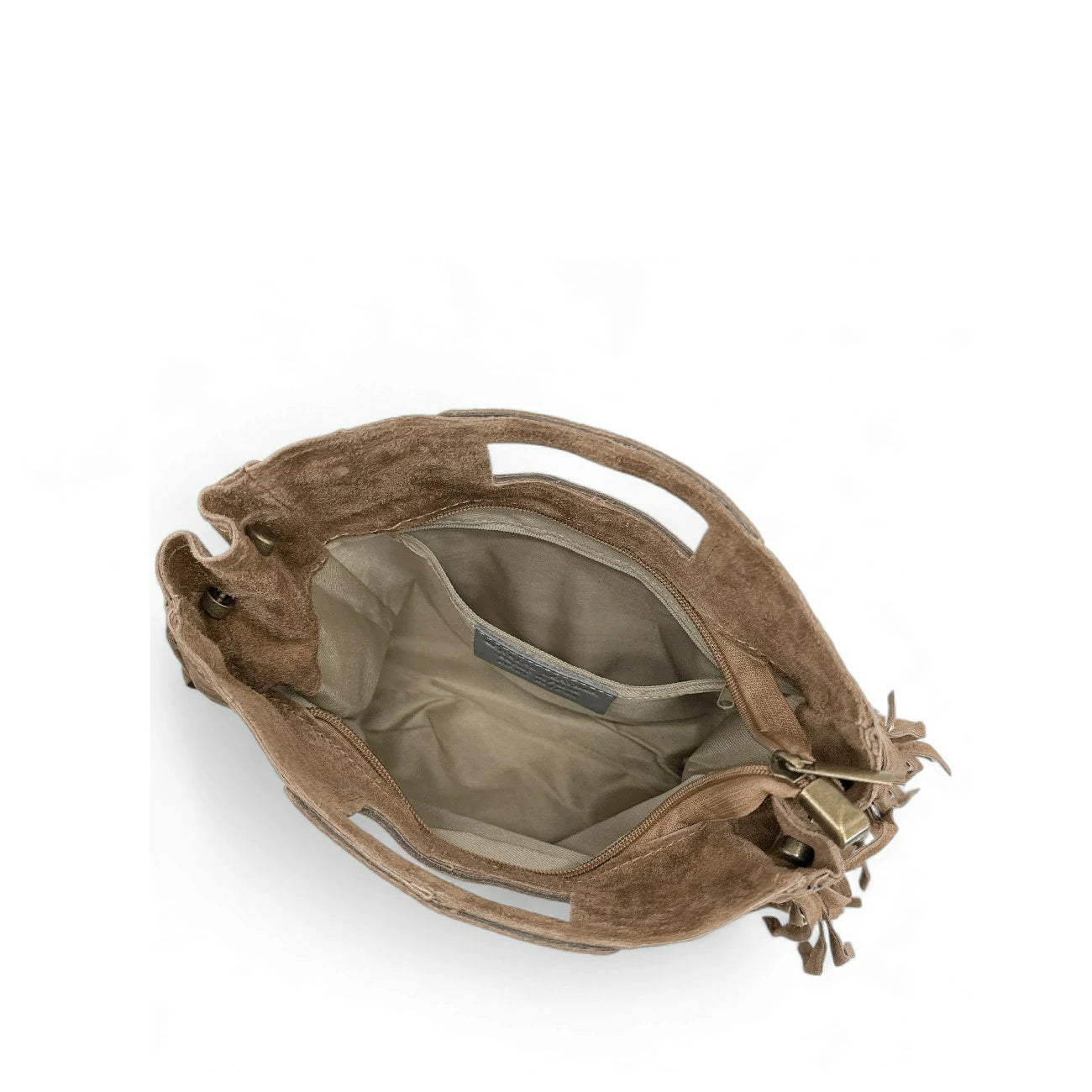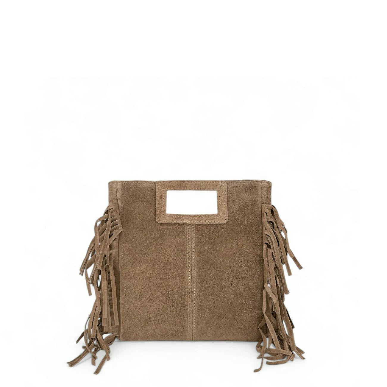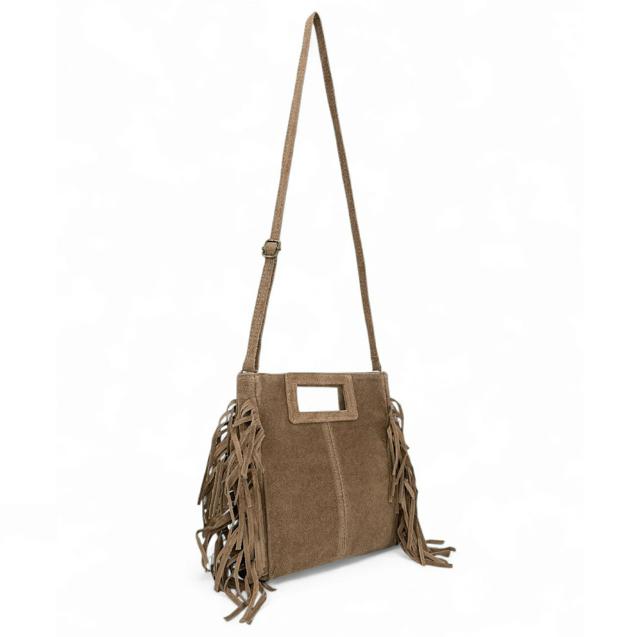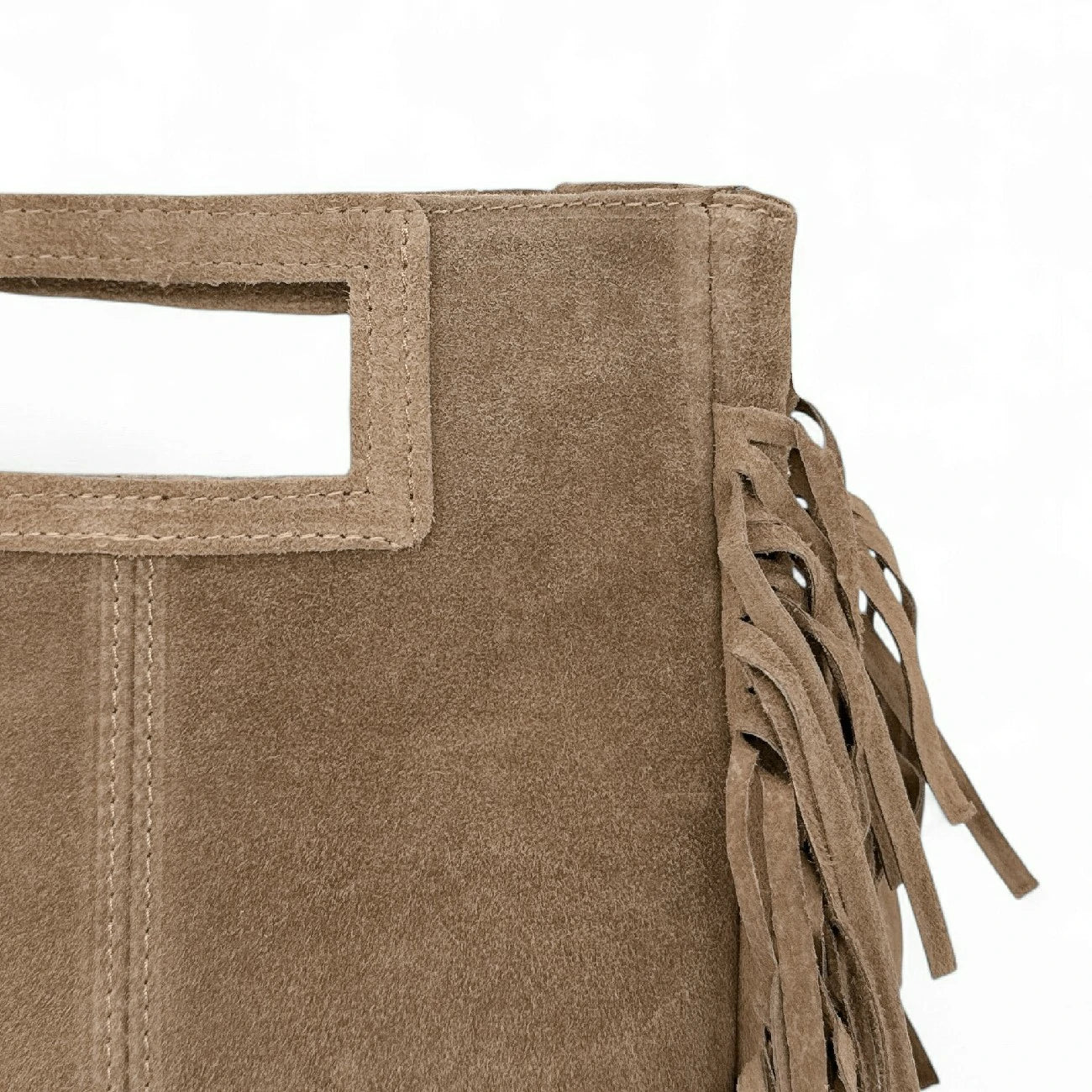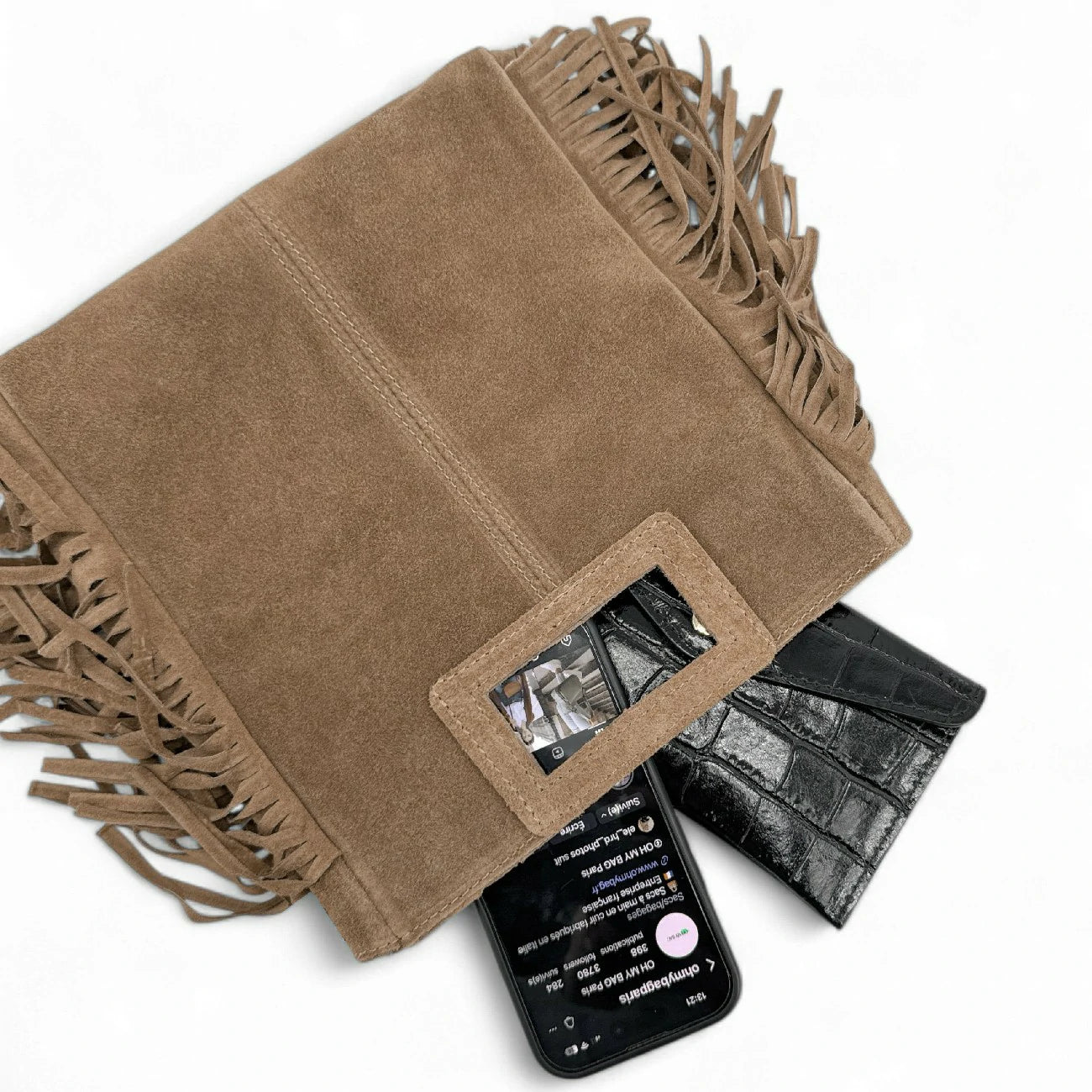 Sac à main à franges en cuir nubuck taupe foncé porté main ou bandoulière, fabriqué en Italie.