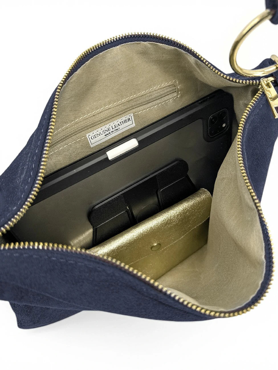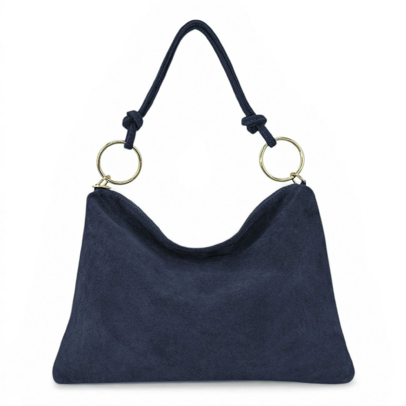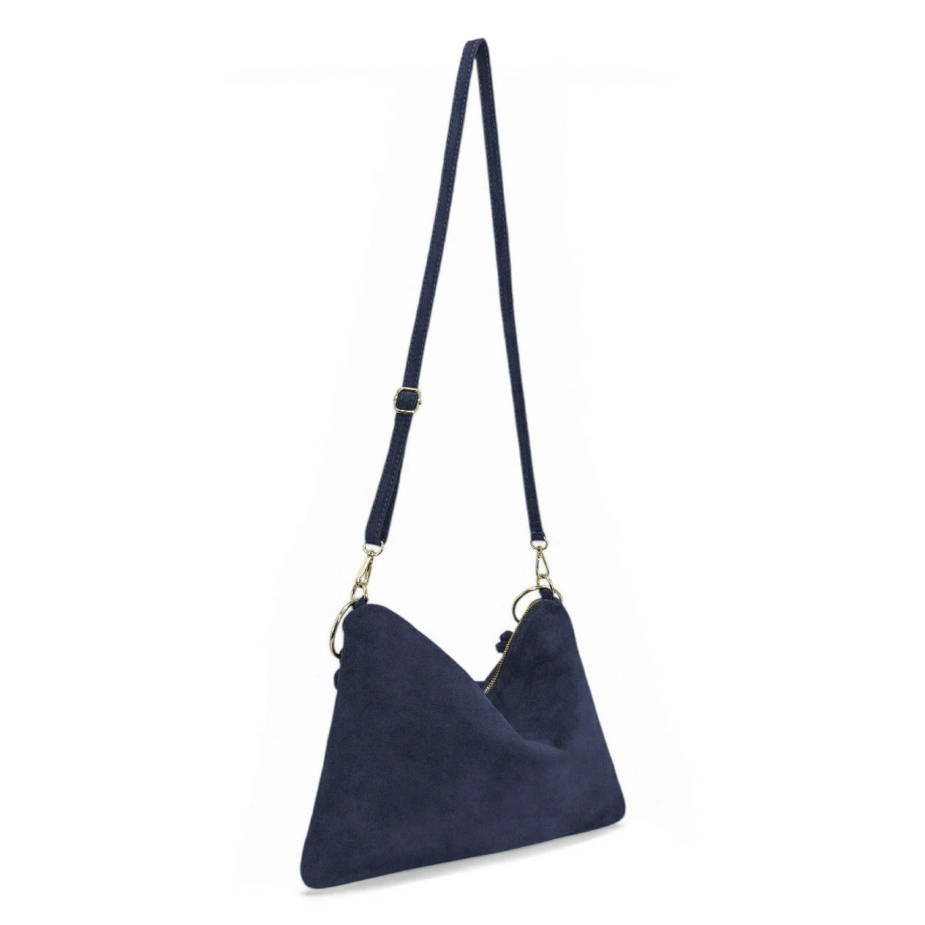 Sac à main de style pochette en cuir nubuck bleu foncé, porté épaule ou bandoulière, fabriqué en Italie.