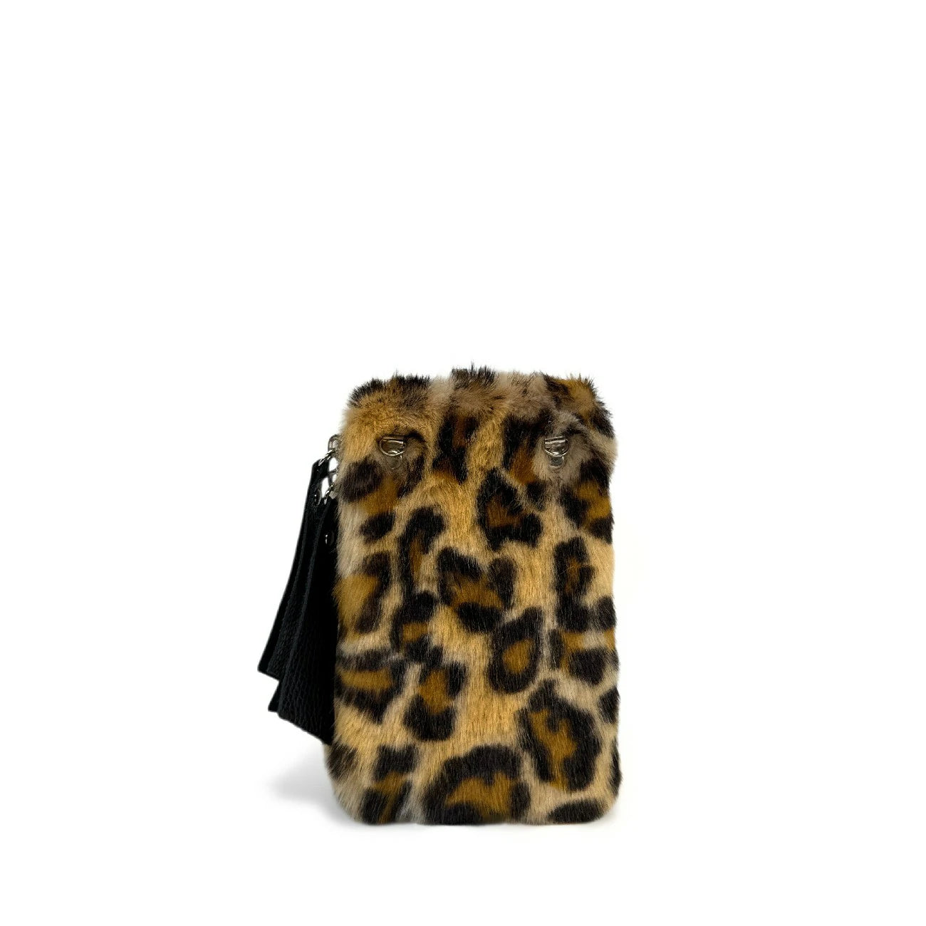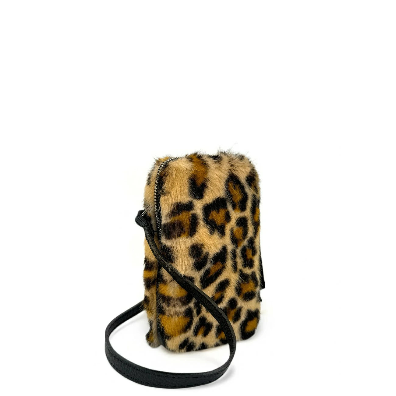 Pochette téléphone en cuir et fausse fourrure léopard, porté bandoulière, fabriqué en Italie.