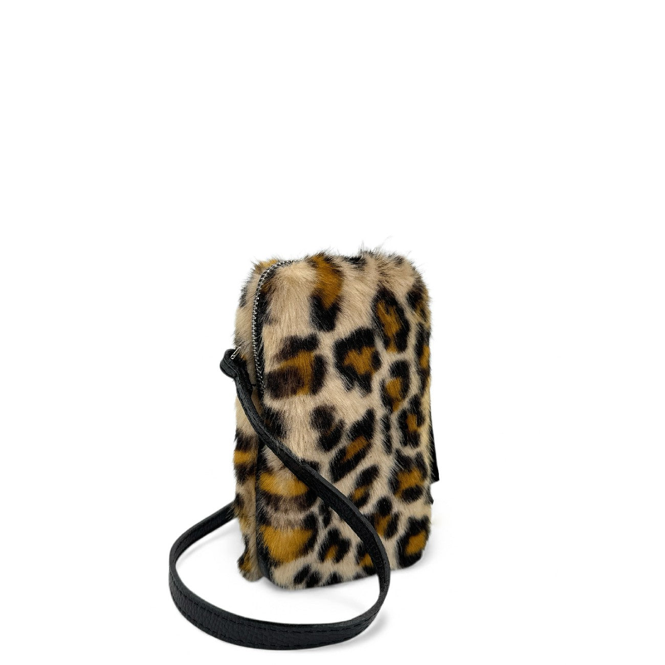 Pochette téléphone en cuir et fausse fourrure léopard crème, porté bandoulière, fabriqué en Italie.