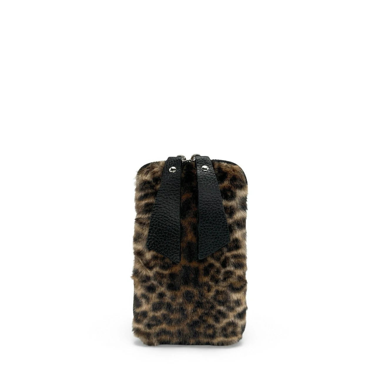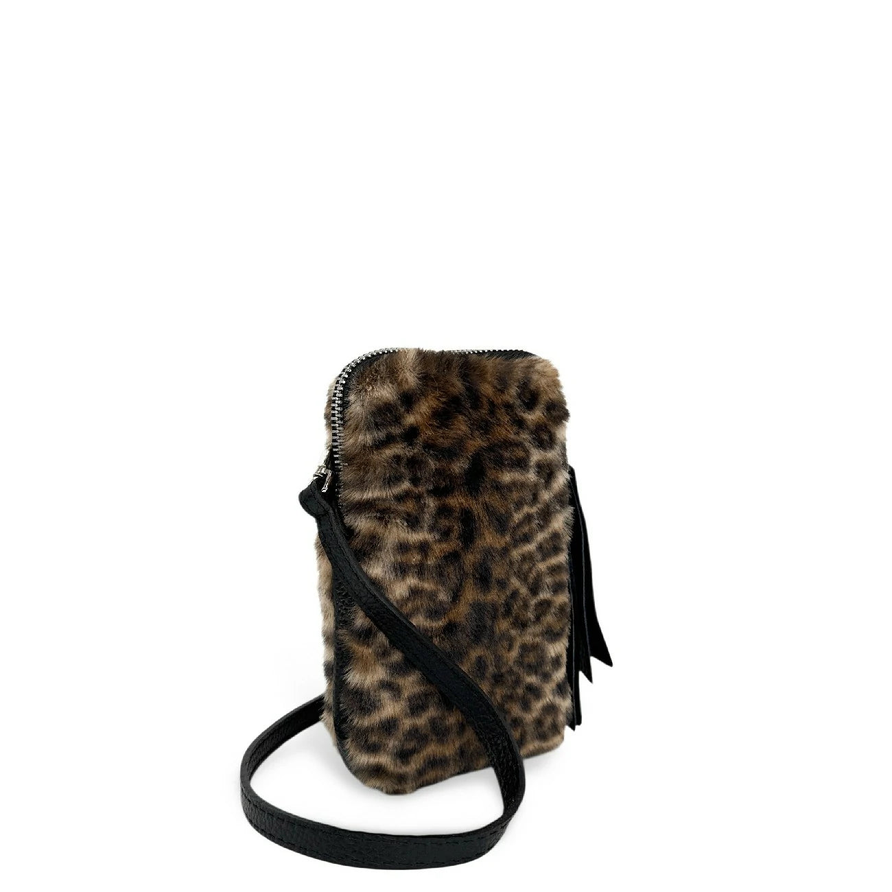 Pochette téléphone en cuir et fausse fourrure ocelot, porté bandoulière, fabriqué en Italie.