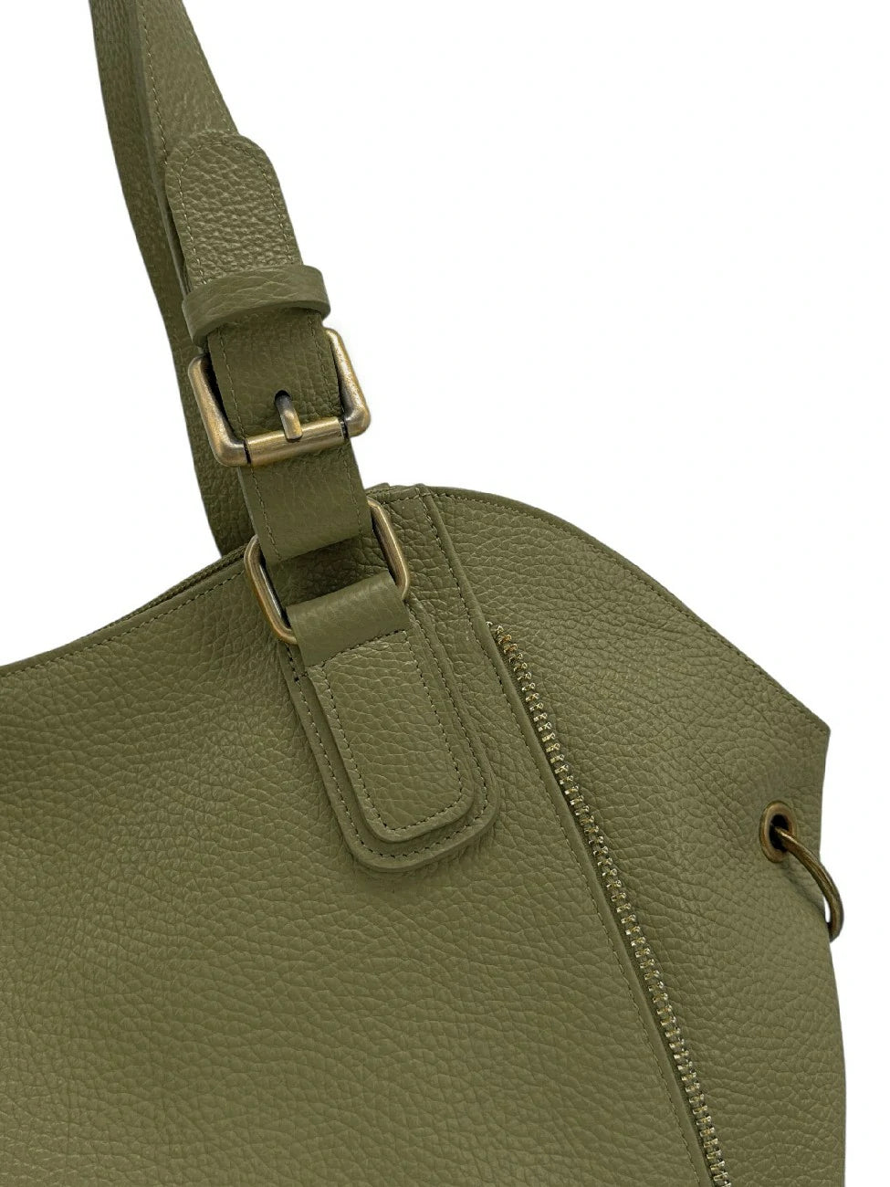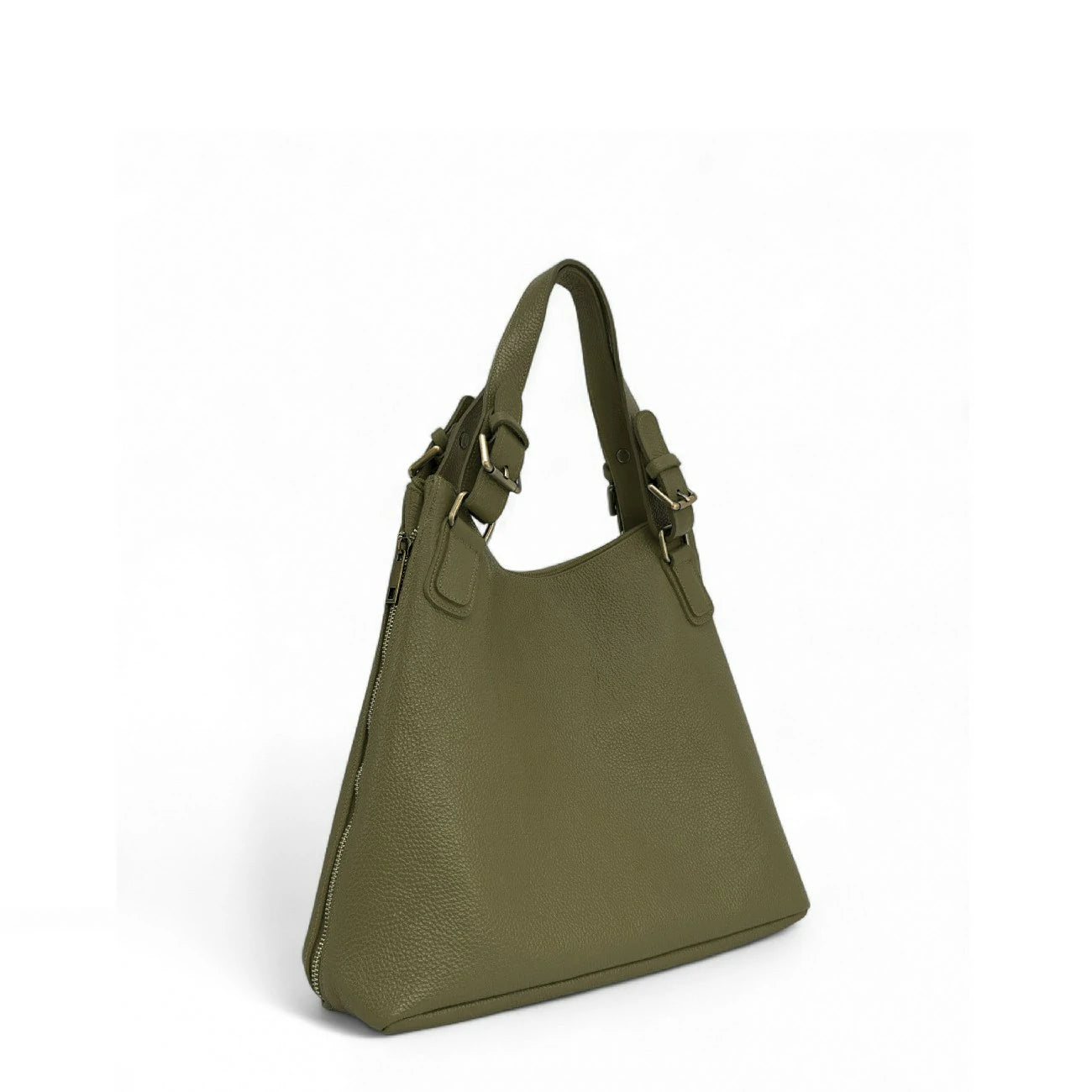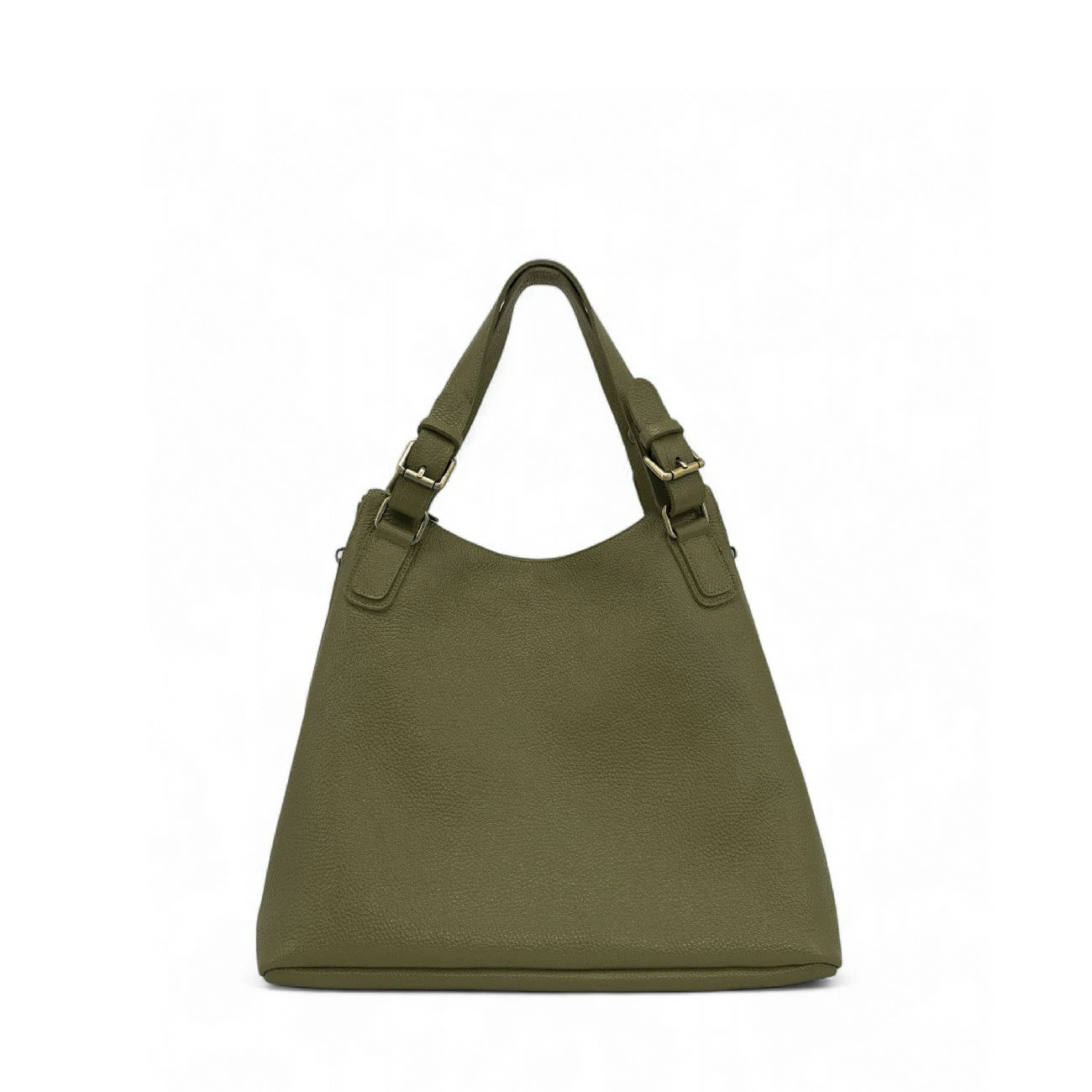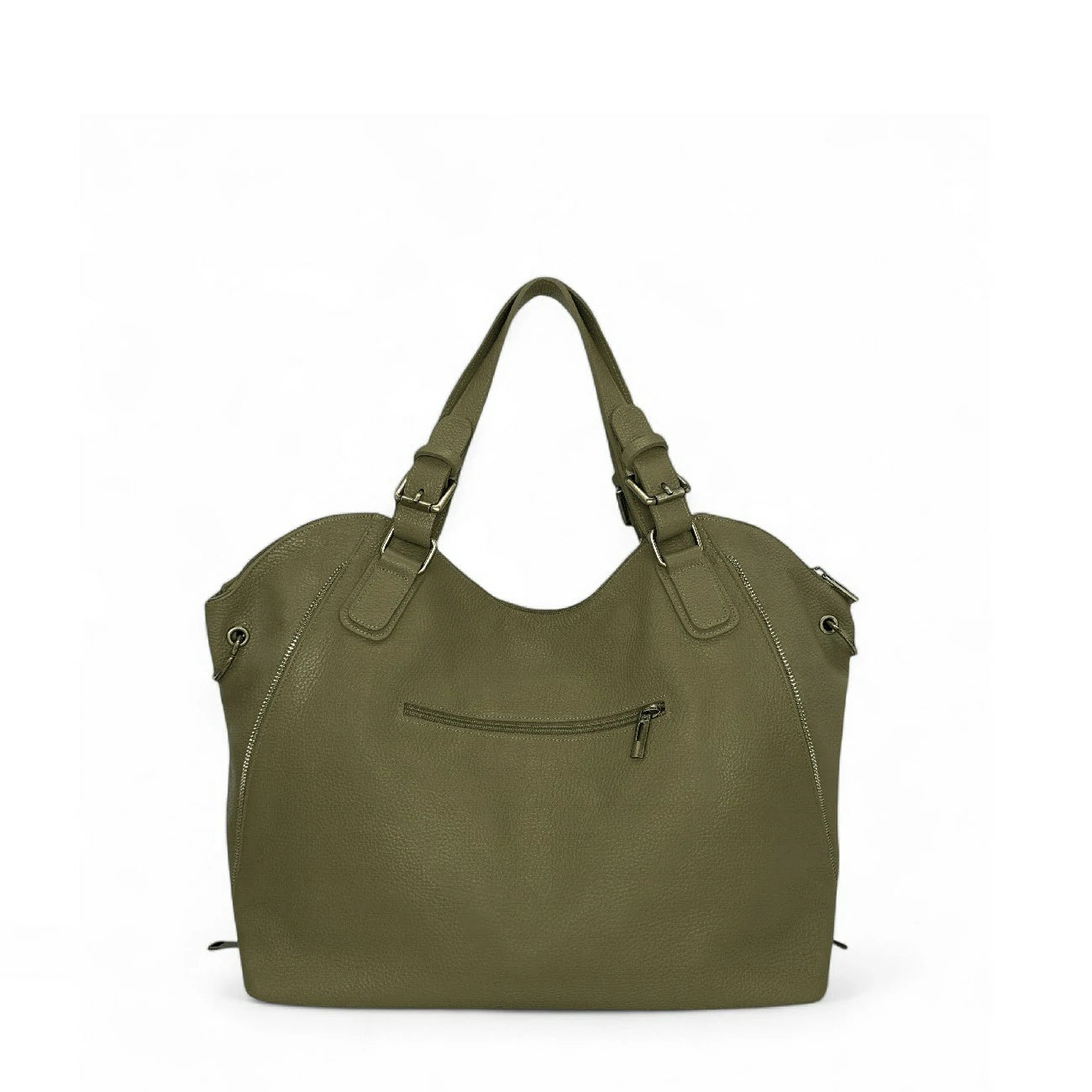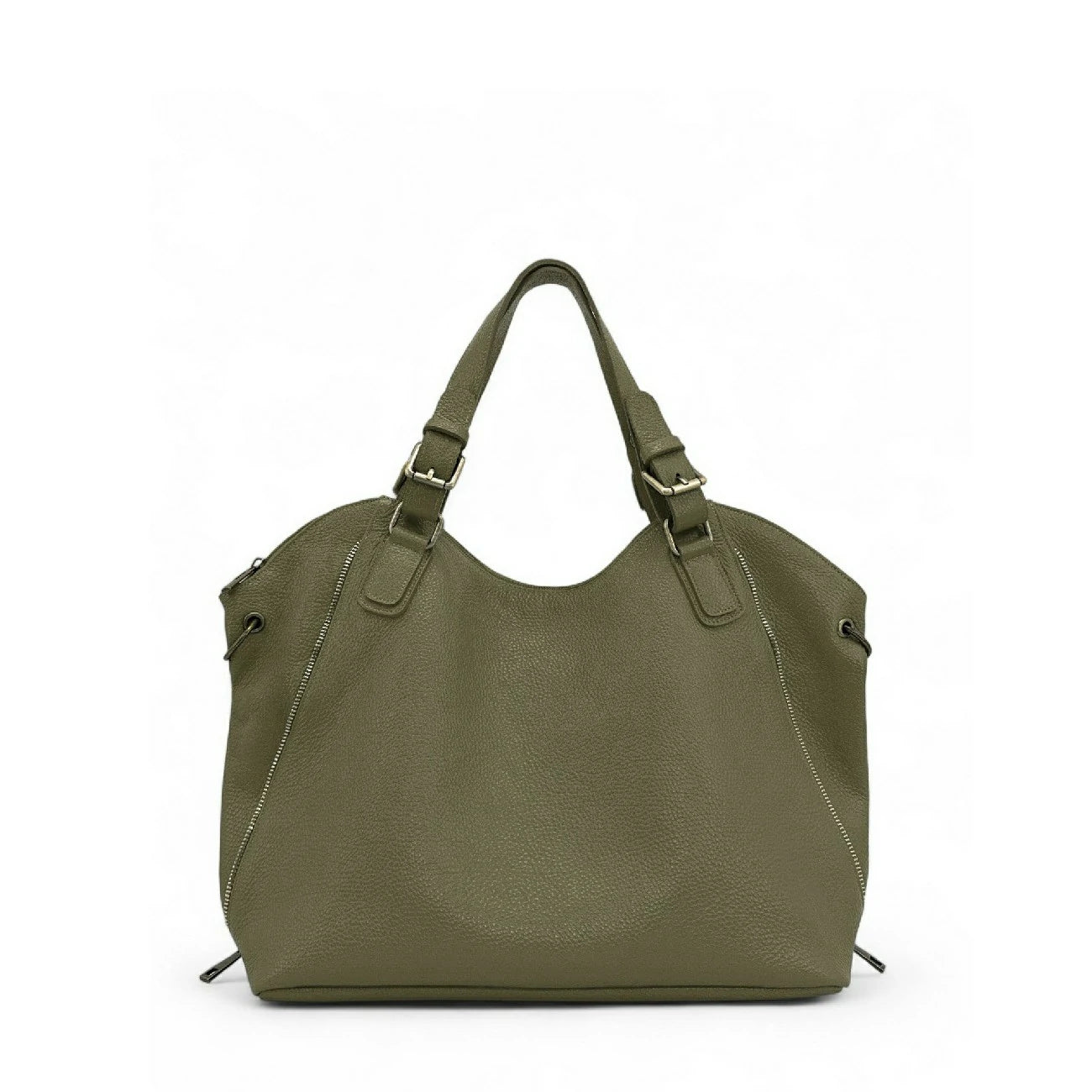 Grand sac en cuir grainé kaki, porté épaule, main ou bandoulière, fabriqué en Italie.