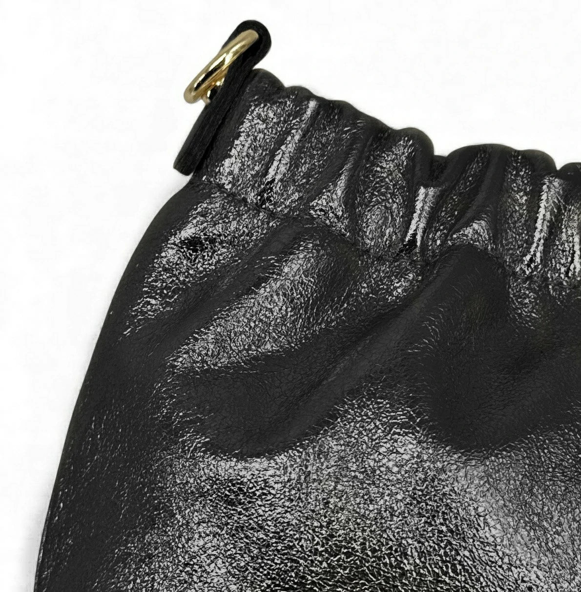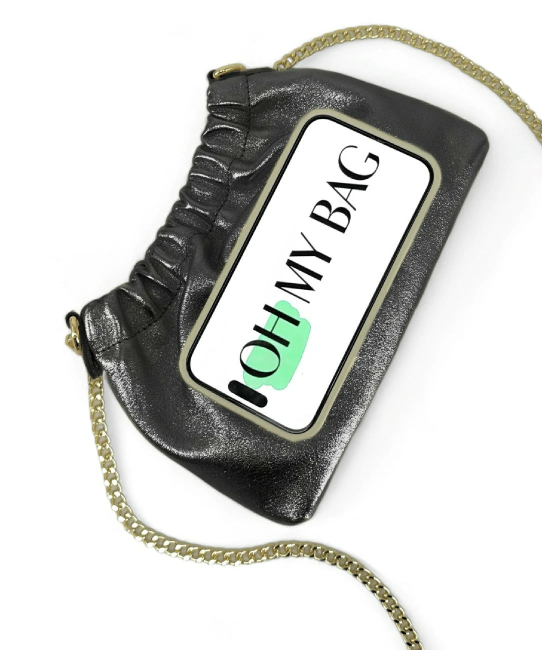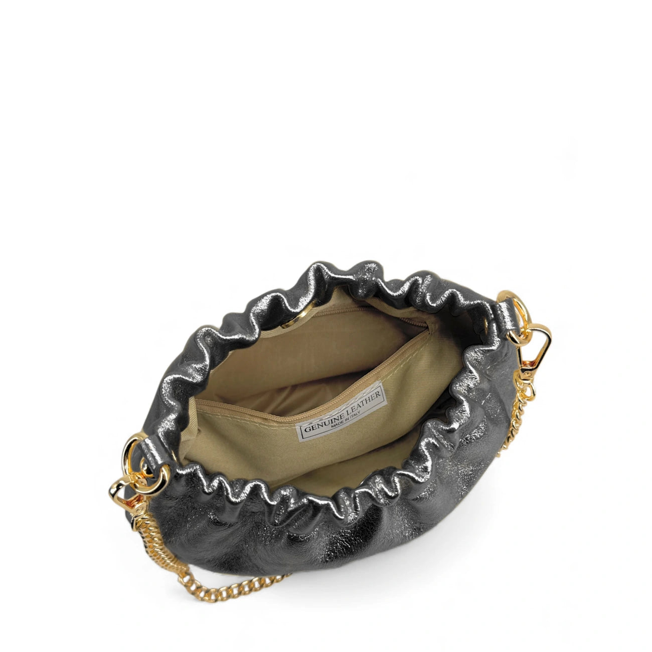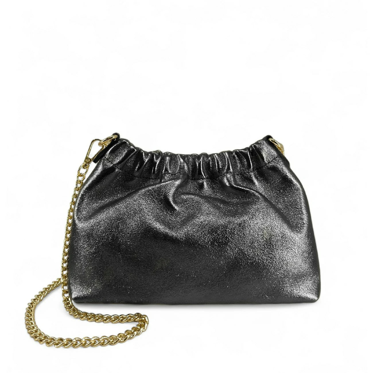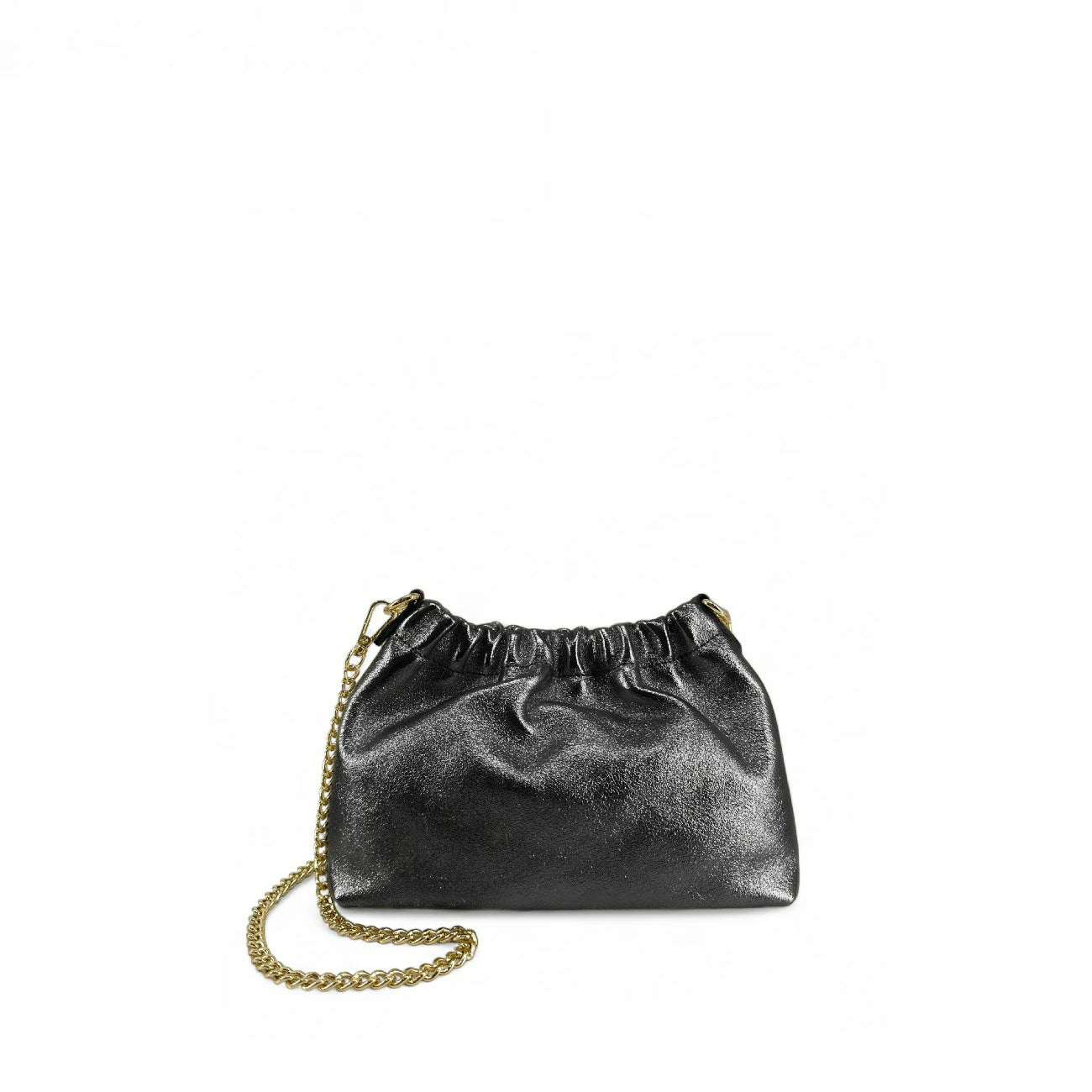 Sac pouch en cuir irisé noir avec bandoulière chaînette, porté main, épaule ou bandoulière, fabriqué en Italie.