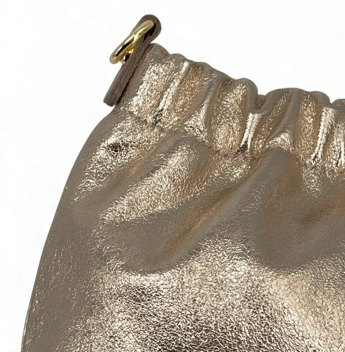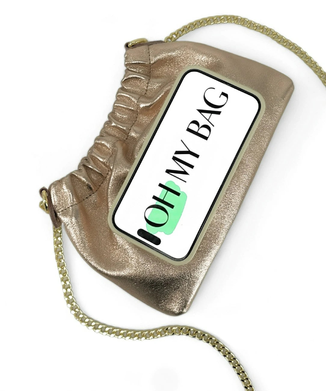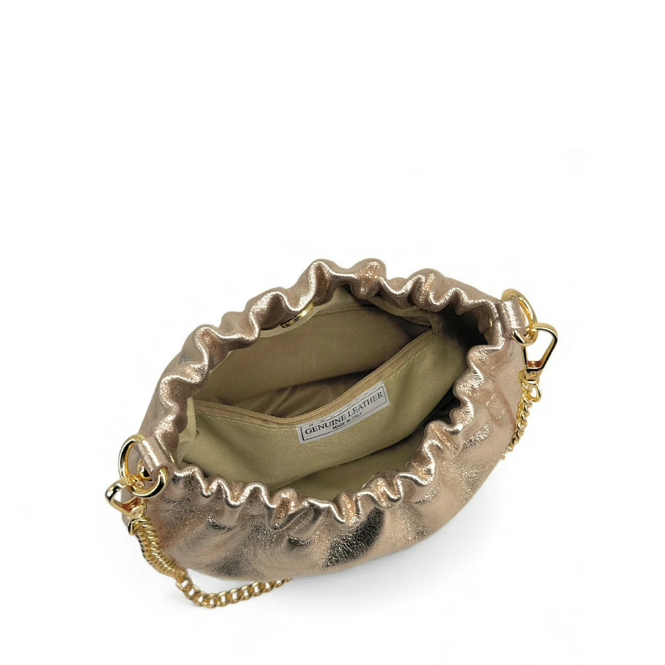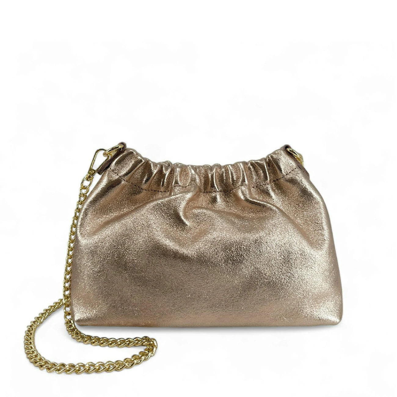 Sac pouch en cuir irisé champagne avec bandoulière chaînette, porté main, épaule ou bandoulière, fabriqué en Italie.